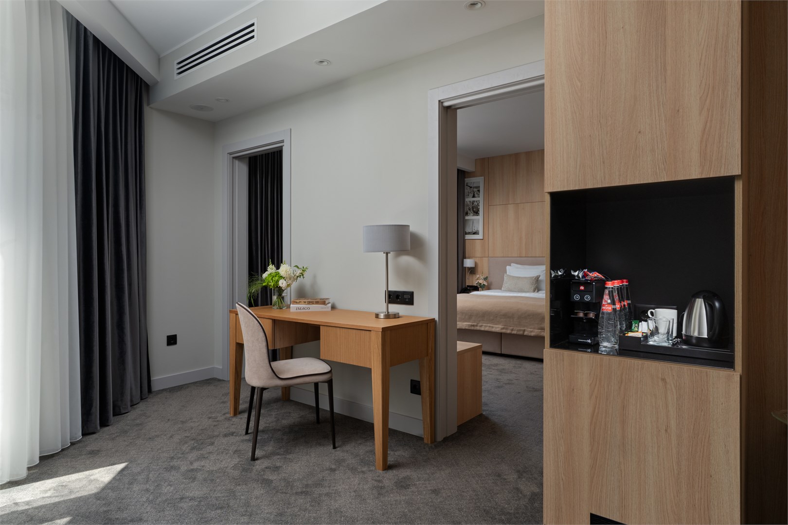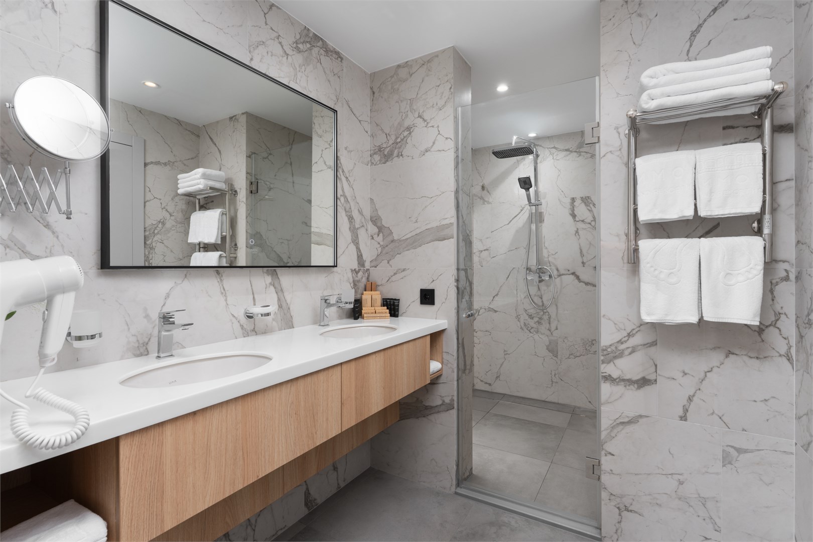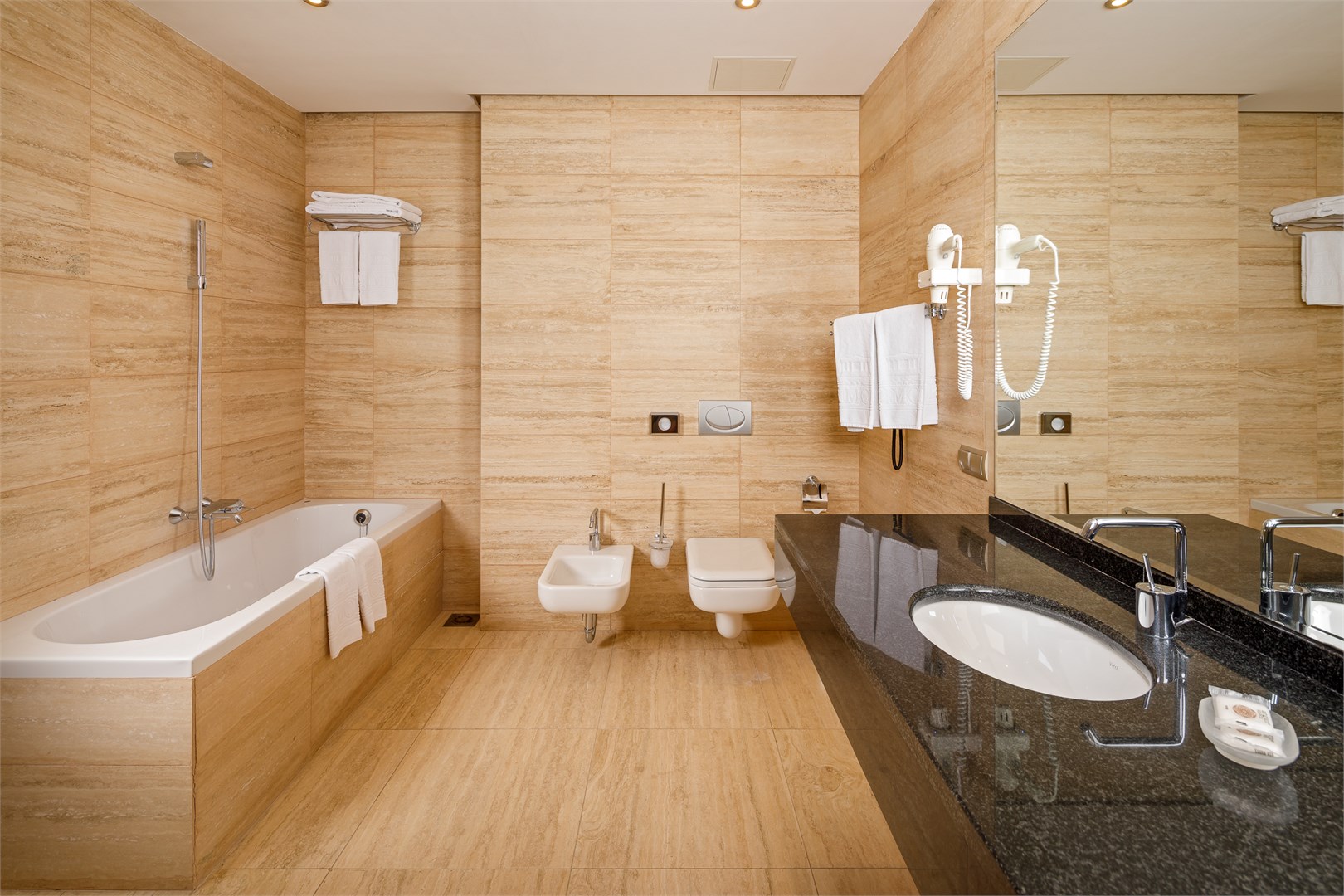 - В номере: душ, ванна, туалет, ТВ, холодильник, кондиционер, сейф, фен, телефон, чайная станция, электрочайник, двуспальная или две раздельные кровати, диван, кресло, терраса, кофемашина