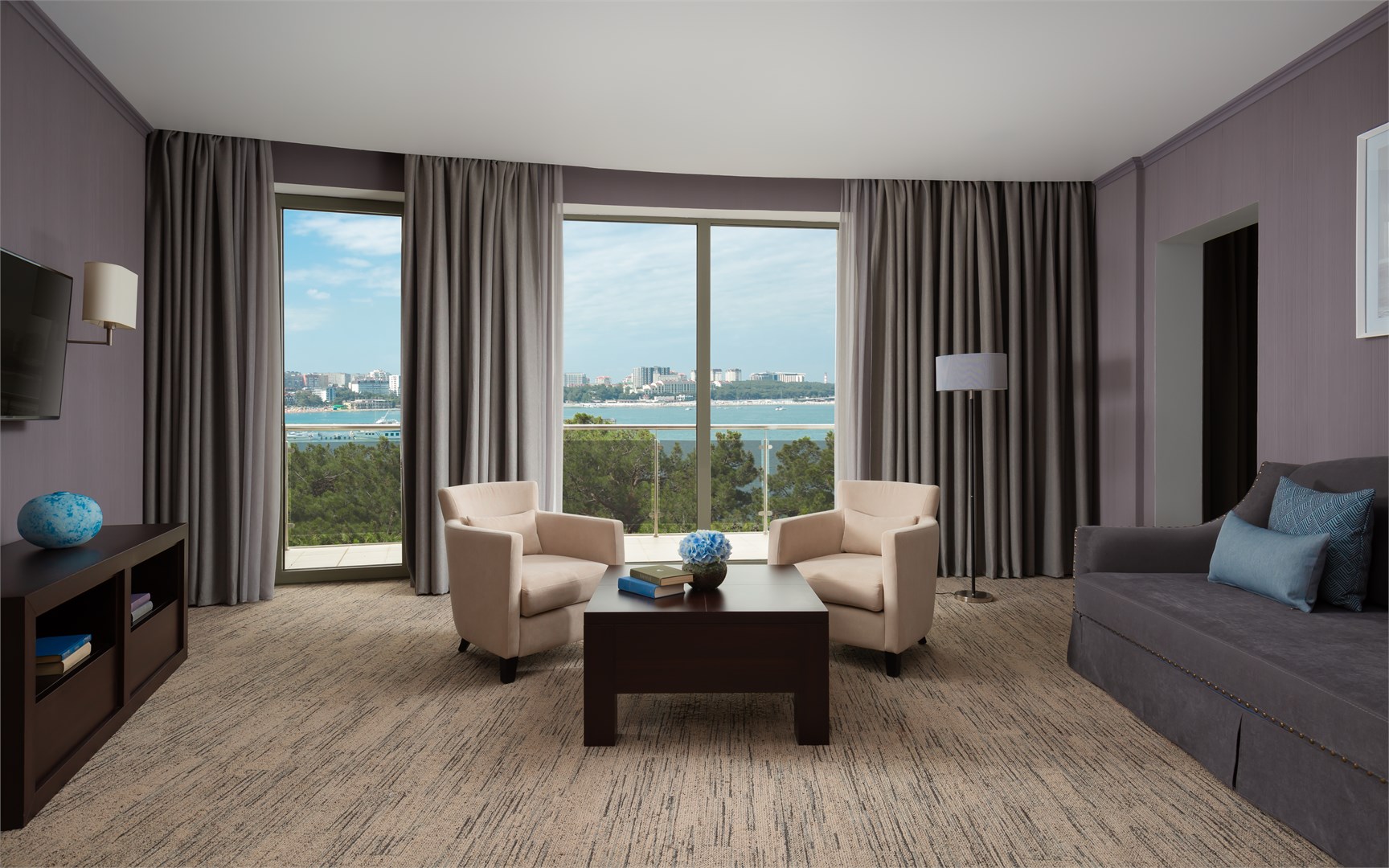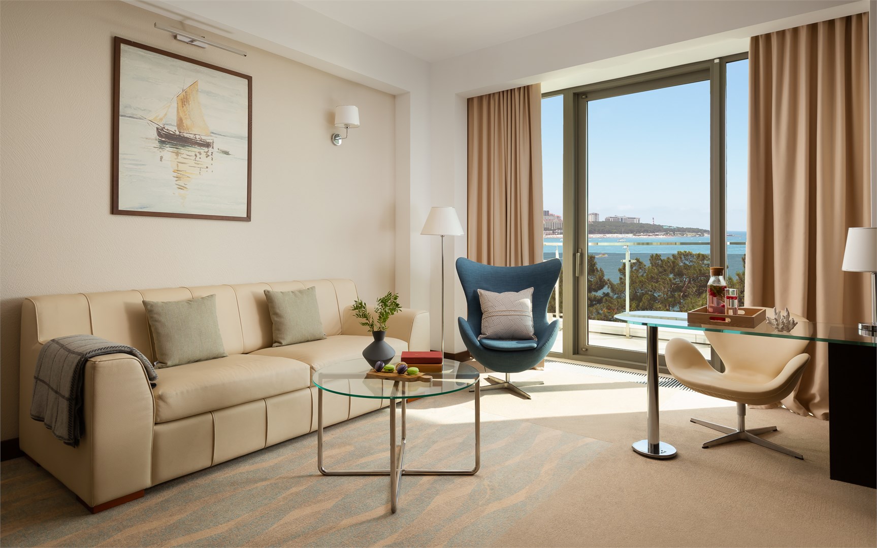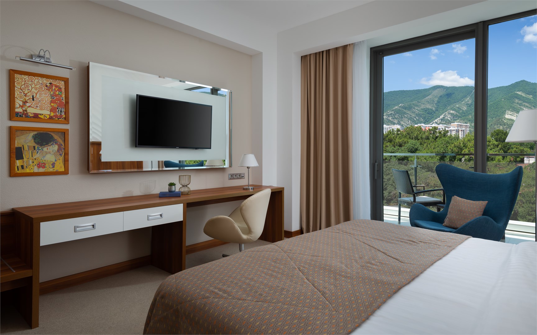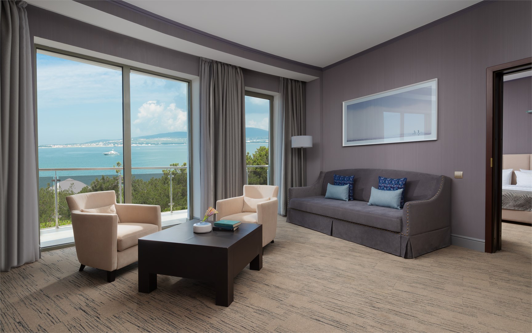 - В номере: душ, ванна, туалет, биде, ТВ, холодильник, кондиционер, сейф, фен, телефон, чайная станция, электрочайник, двуспальная кровать, диван, кресло, балкон