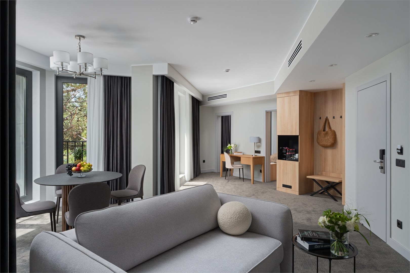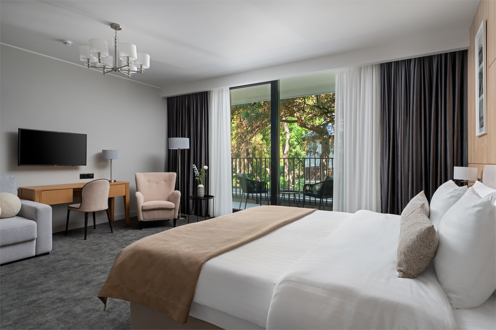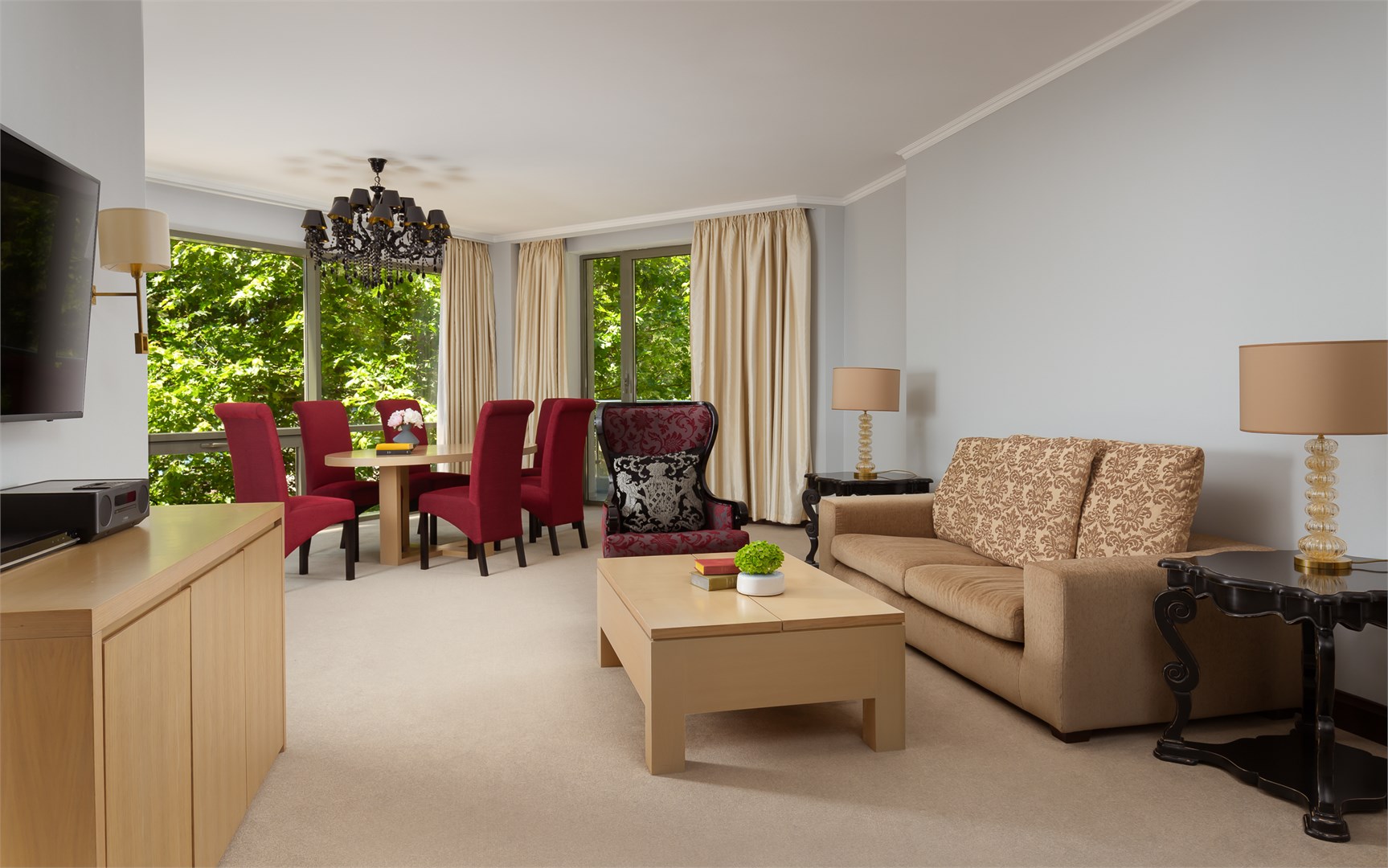 - В номере: душ, ванна, туалет, биде, ТВ, холодильник, кондиционер, сейф, фен, телефон, чайная станция, электрочайник, двуспальная кровать, диван, кресло, балкон