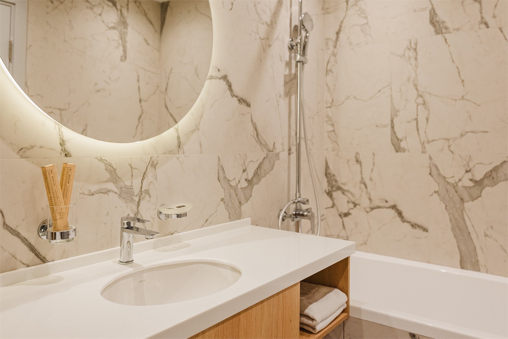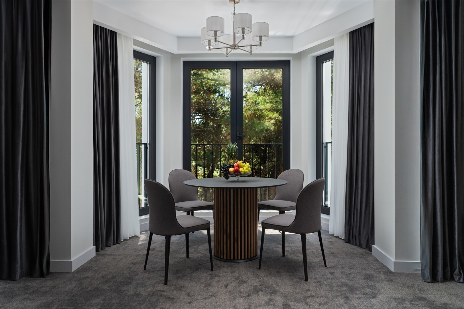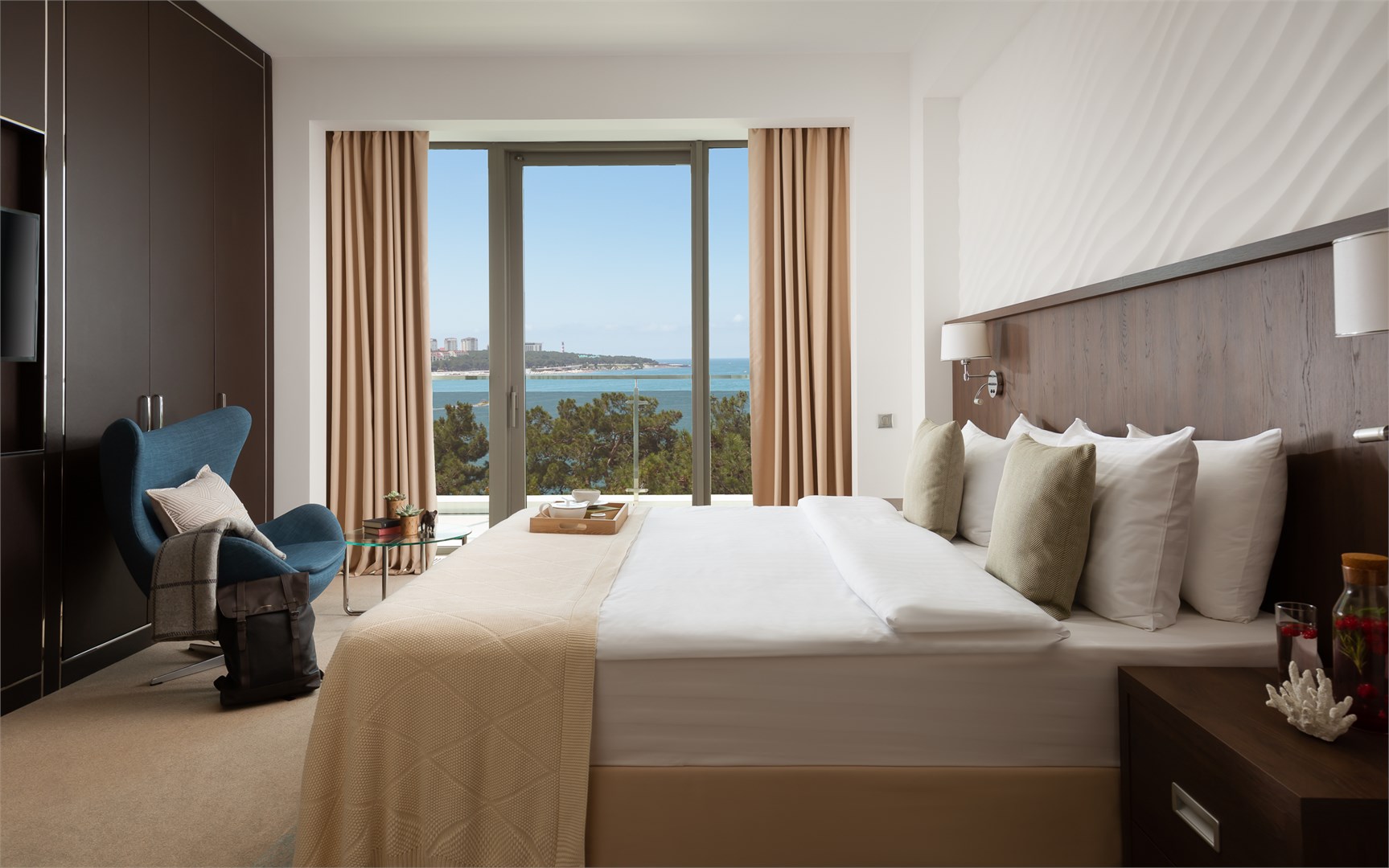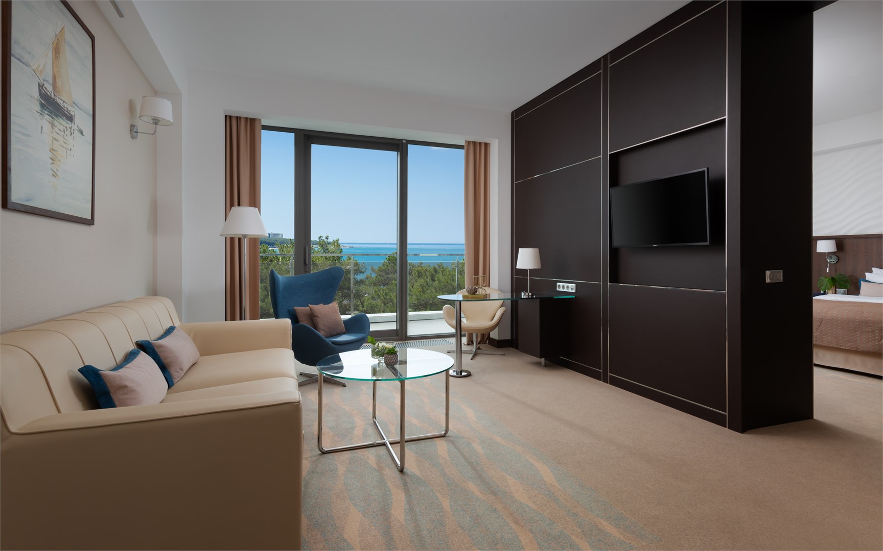 - В номере: душ, ванна, туалет, биде, ТВ, холодильник, кондиционер, сейф, фен, телефон, чайная станция, электрочайник, двуспальная кровать, диван, кресло, балкон