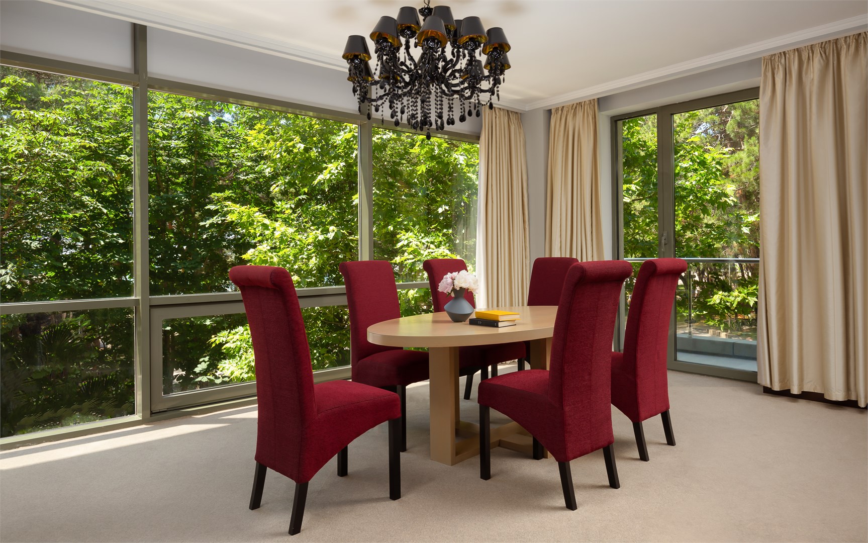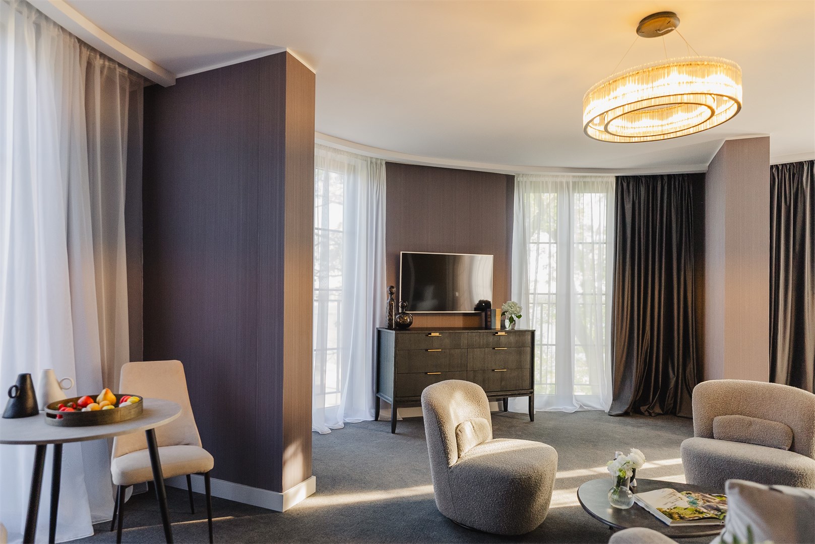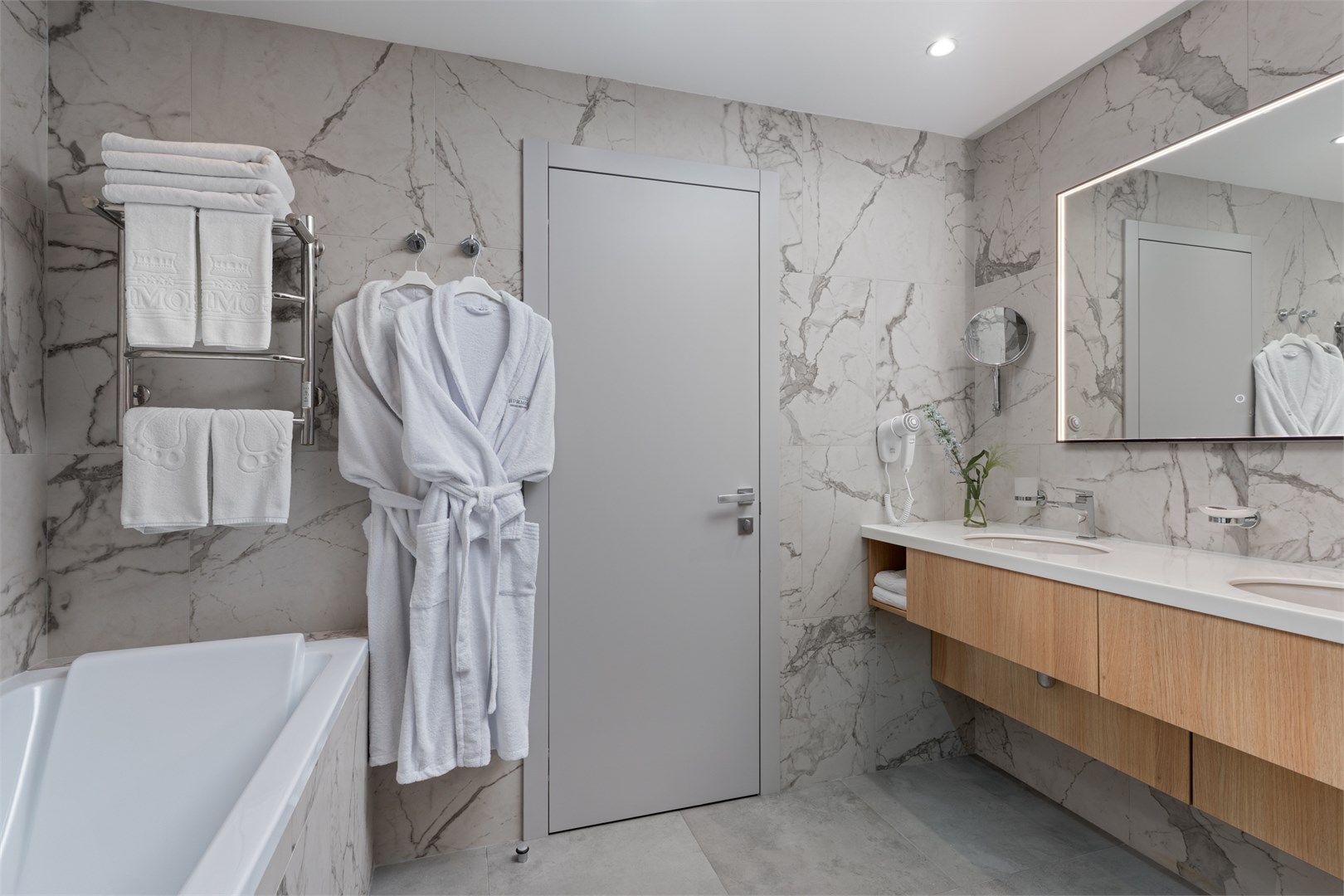 - В номере: душ, ванна, туалет, ТВ, холодильник, кондиционер, сейф, фен, телефон, мини-кухня, чайная станция, электрочайник, двуспальная или две раздельные кровати, диван, кресло, балкон (французский), кофемашина