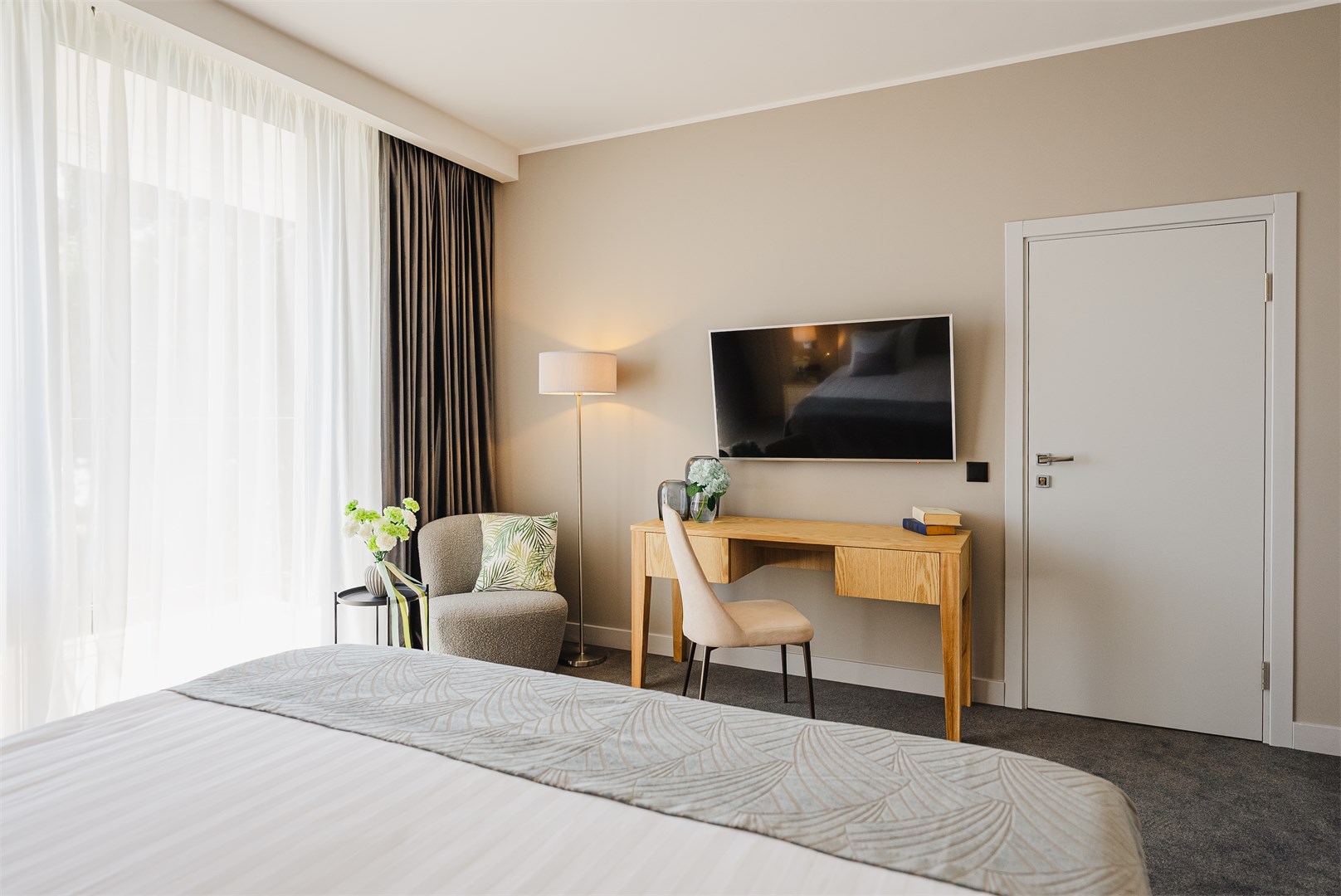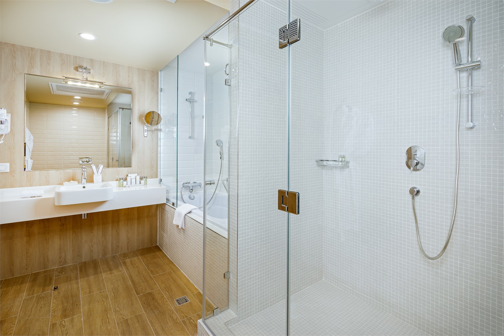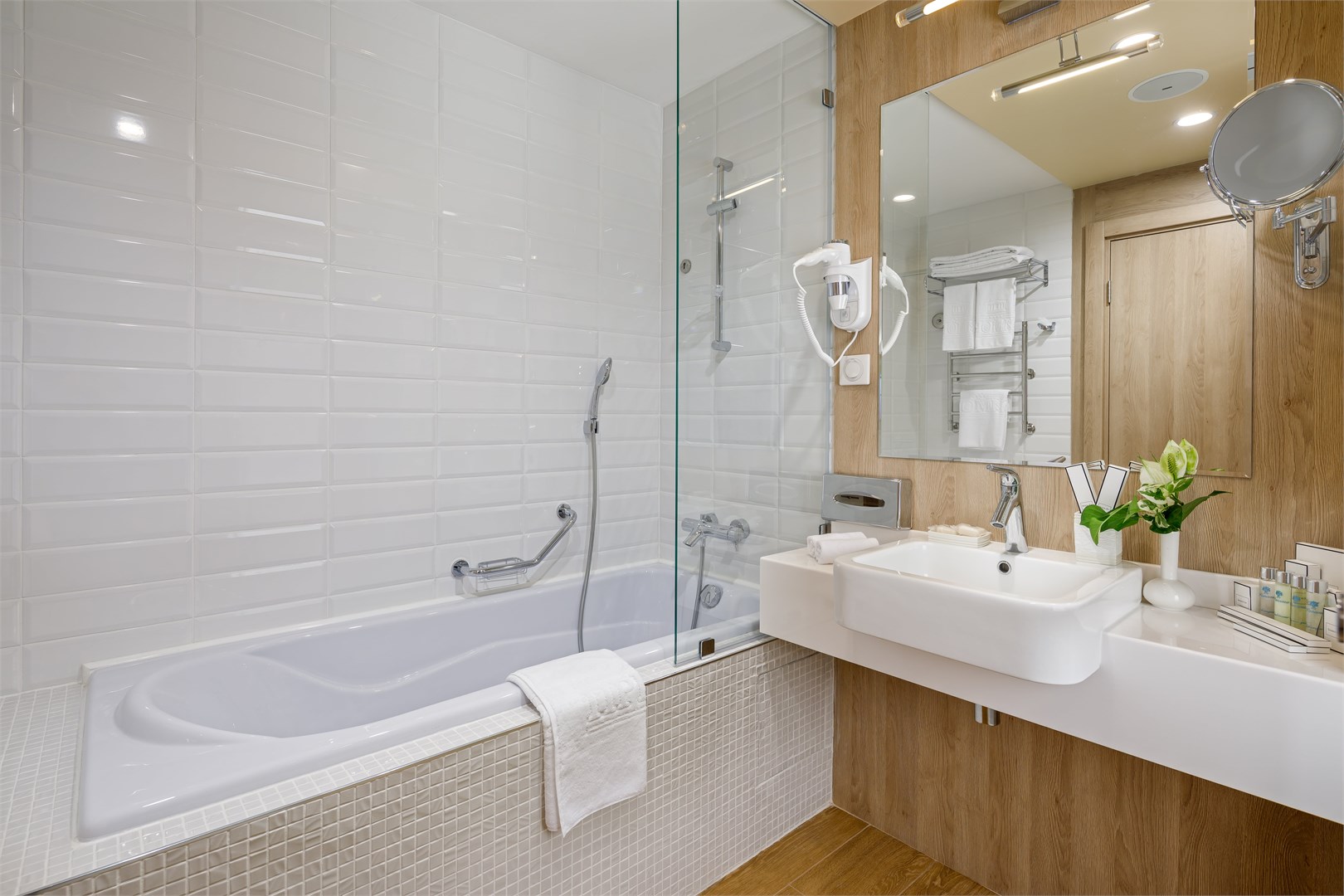 - В номере: душ, ванна, туалет, ТВ, холодильник, кондиционер, сейф, фен, телефон, чайная станция, электрочайник, двуспальная или две раздельные кровати, кресло, балкон