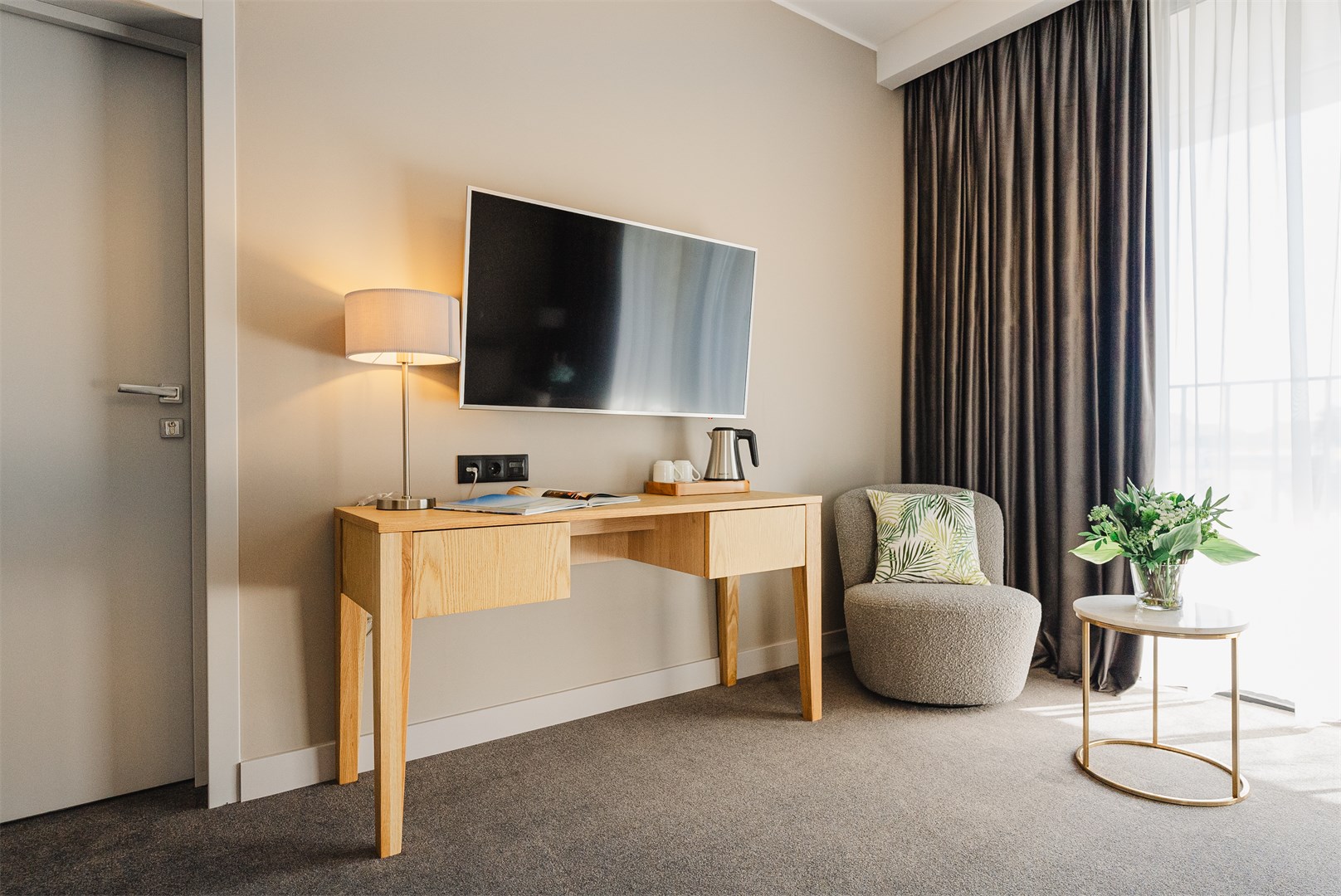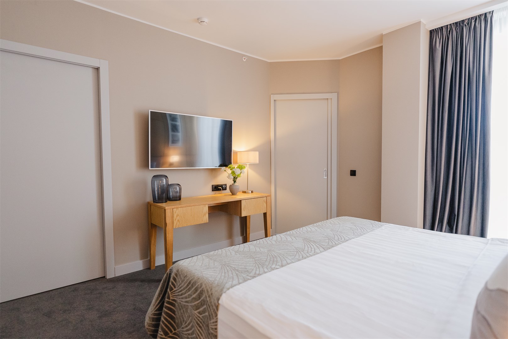 - В номере: ванна, туалет, ТВ, холодильник, кондиционер, сейф, фен, телефон, чайная станция, электрочайник, двуспальная или две раздельные кровати, кресло, балкон