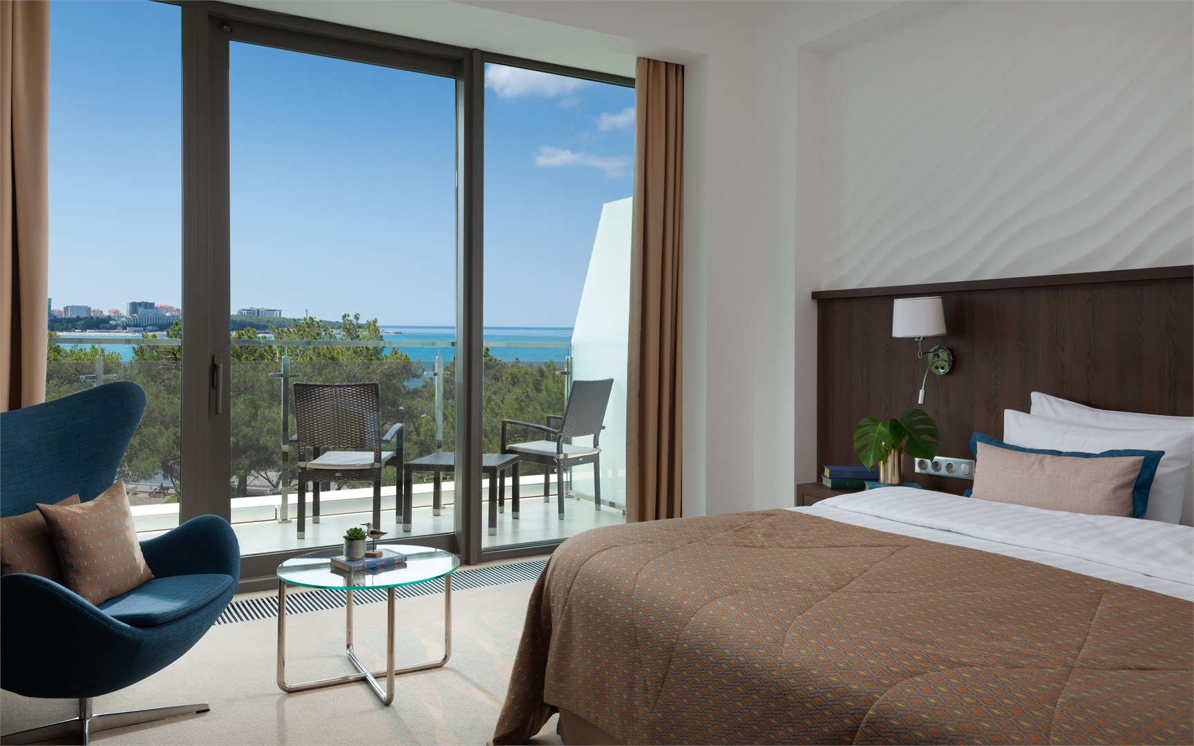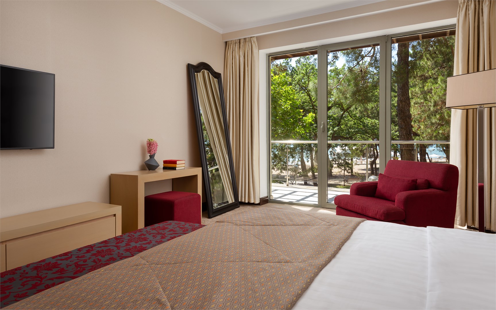 - В номере: душ, туалет, ТВ, холодильник, кондиционер, сейф, фен, телефон, чайная станция, электрочайник, двуспальная или две раздельные кровати, диван, кресло, балкон