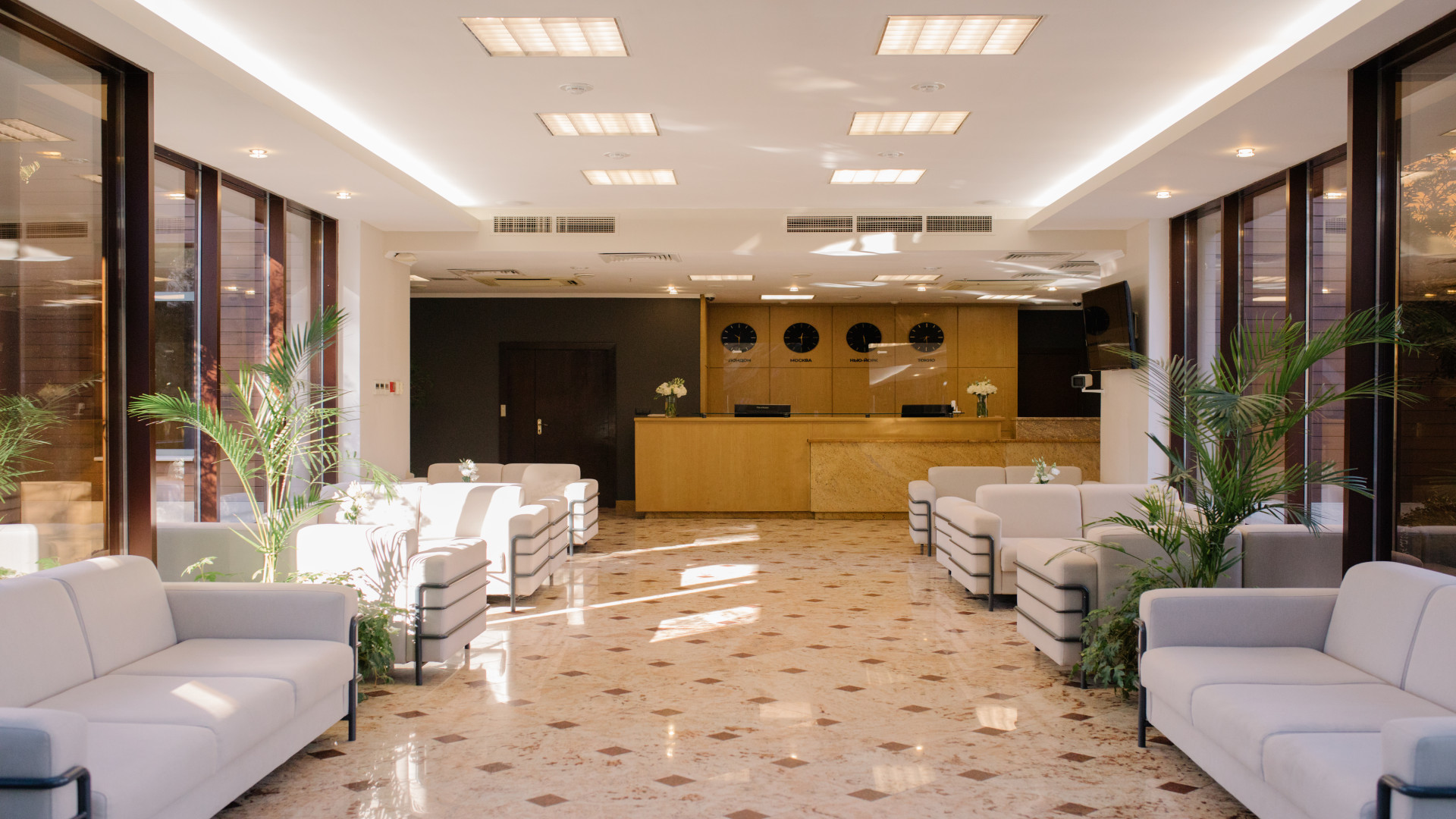 - В номере: душ, туалет, ТВ, холодильник, кондиционер, сейф, фен, телефон, чайная станция, электрочайник, двуспальная или две раздельные кровати, диван, кресло
