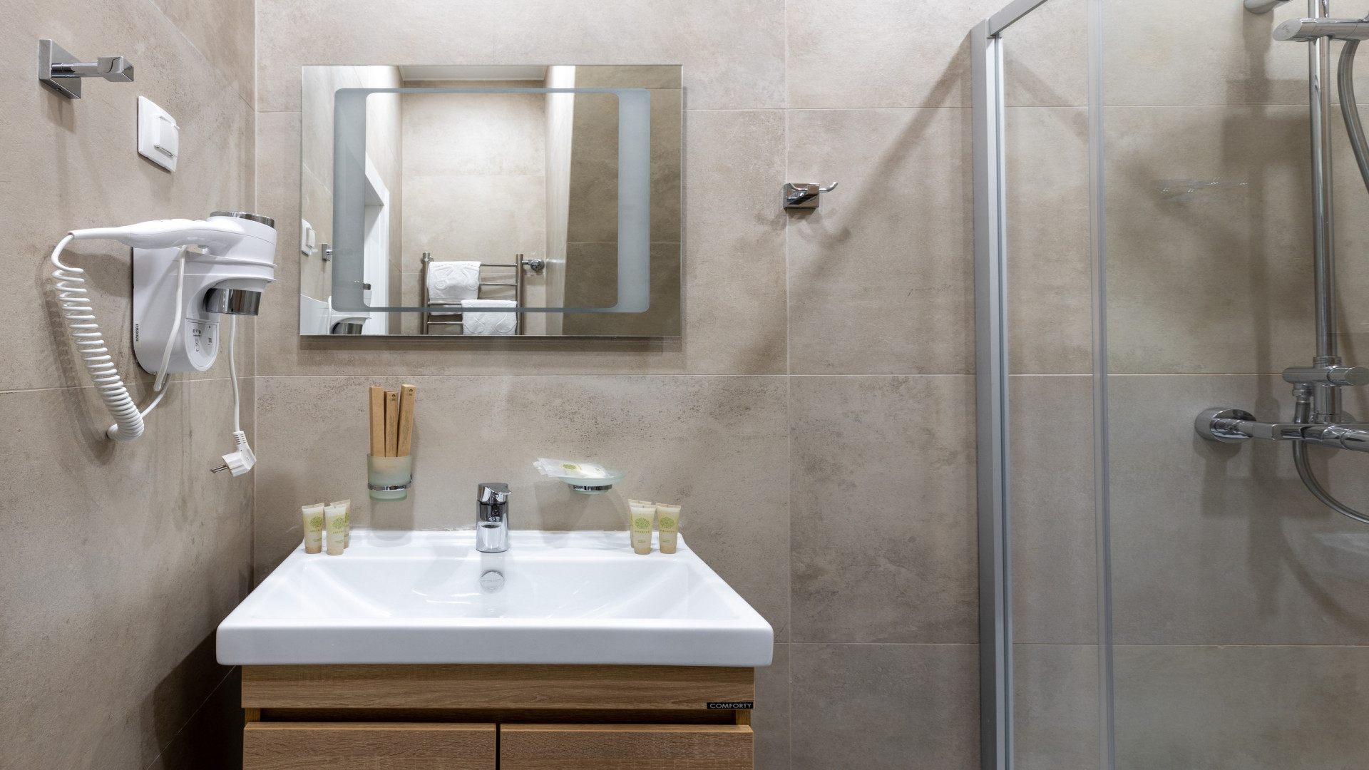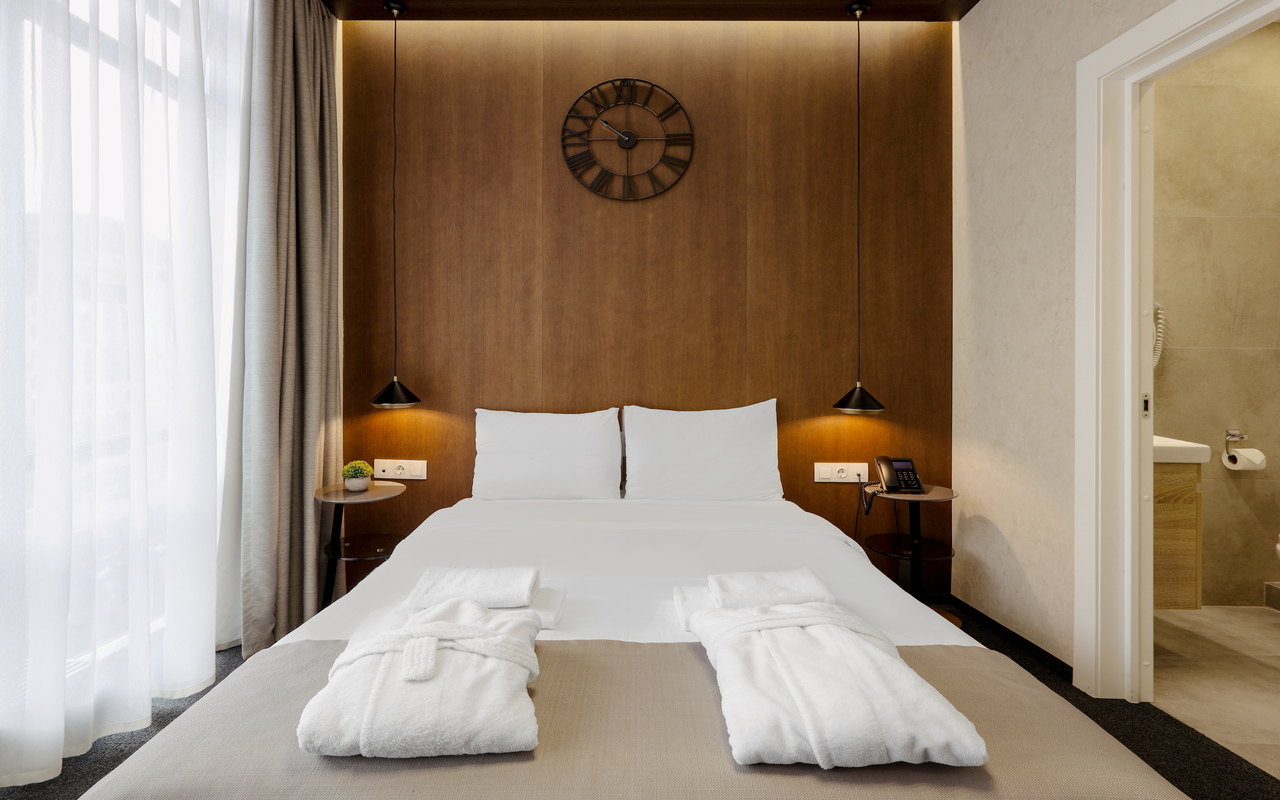 - В номере: душ, туалет, биде, ТВ, холодильник, кондиционер, фен, телефон, электрочайник, СВЧ-печь, двуспальная кровать