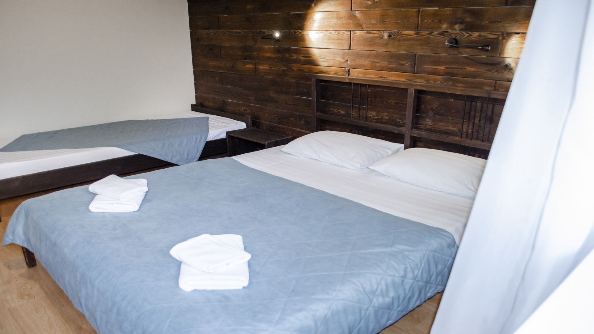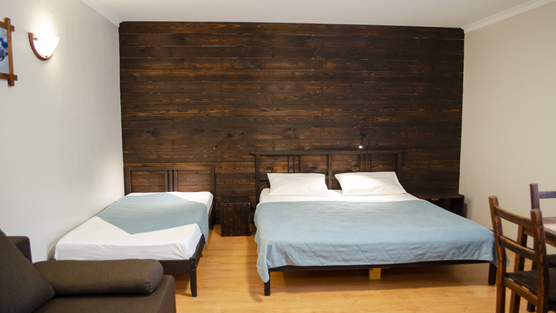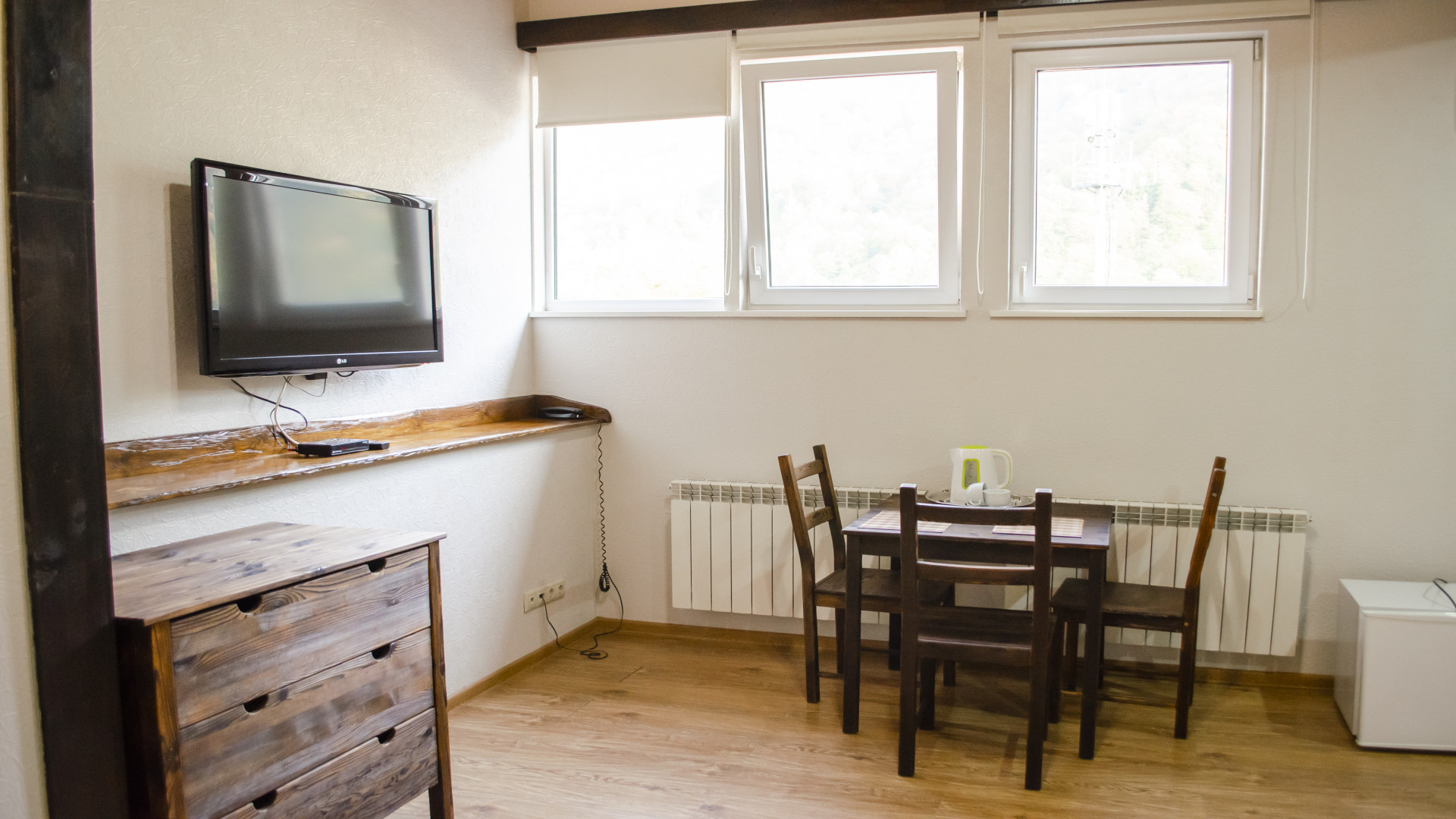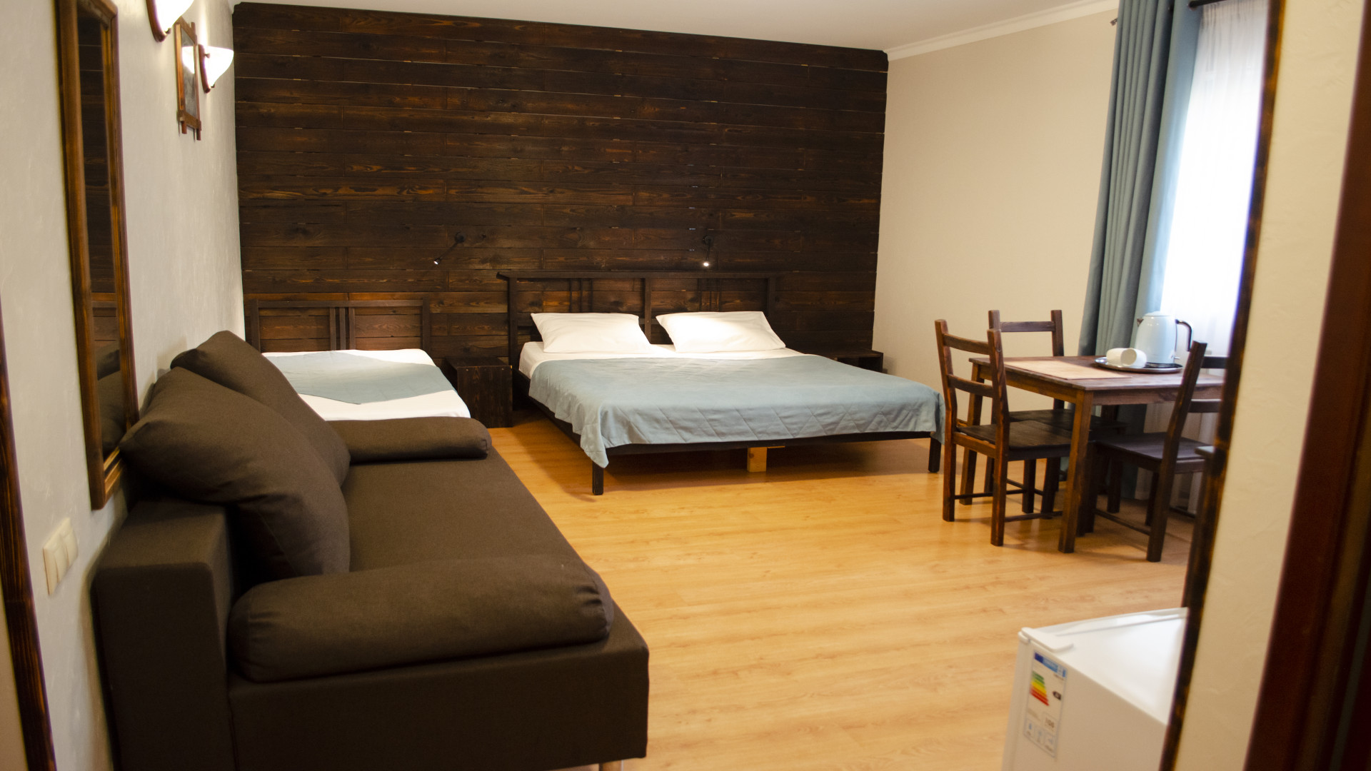 - В номере: душ, туалет, ТВ, холодильник, фен, телефон, электрочайник, односпальная кровать, двуспальная кровать, диван