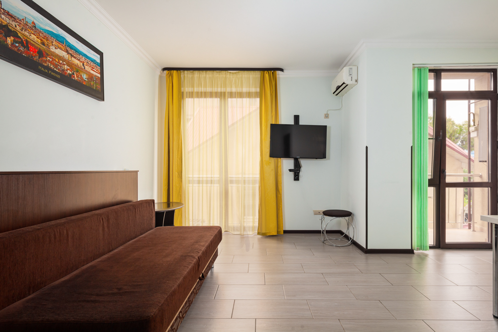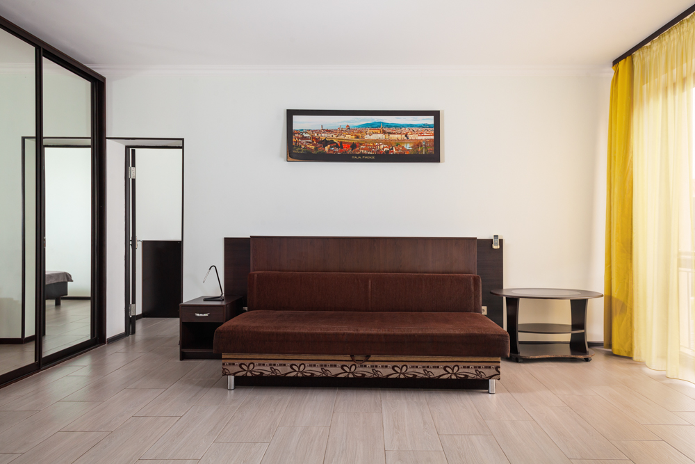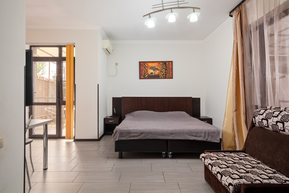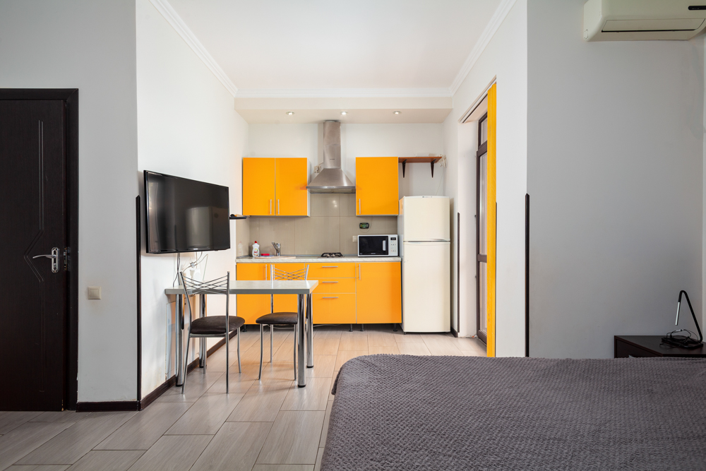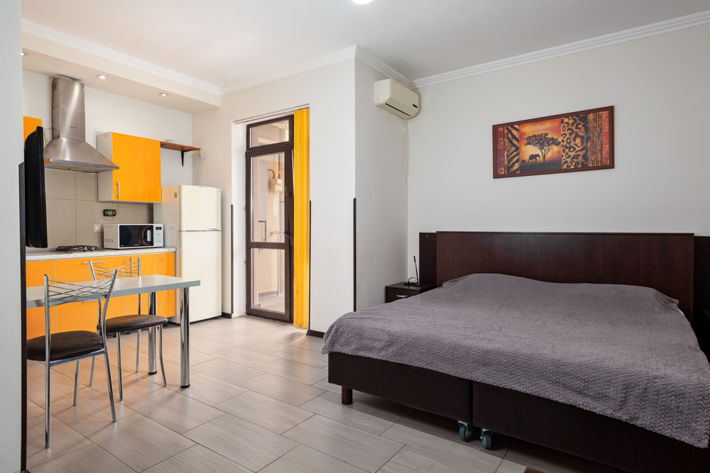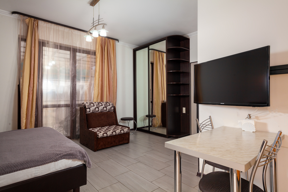 Просторные и комфортные однокомнатные студии площадью 30 м² оборудованы как полноценные квартиры. Грамотное зонирование делит номер на функциональные зоны, которые подходят для разных задач: обеденная зона, спальная зона, зона отдыха. Пространство позволяет разместить дополнительные спальные места. За счет тканей и мягких покрытий в номер не проникает шум и не мешает сну.