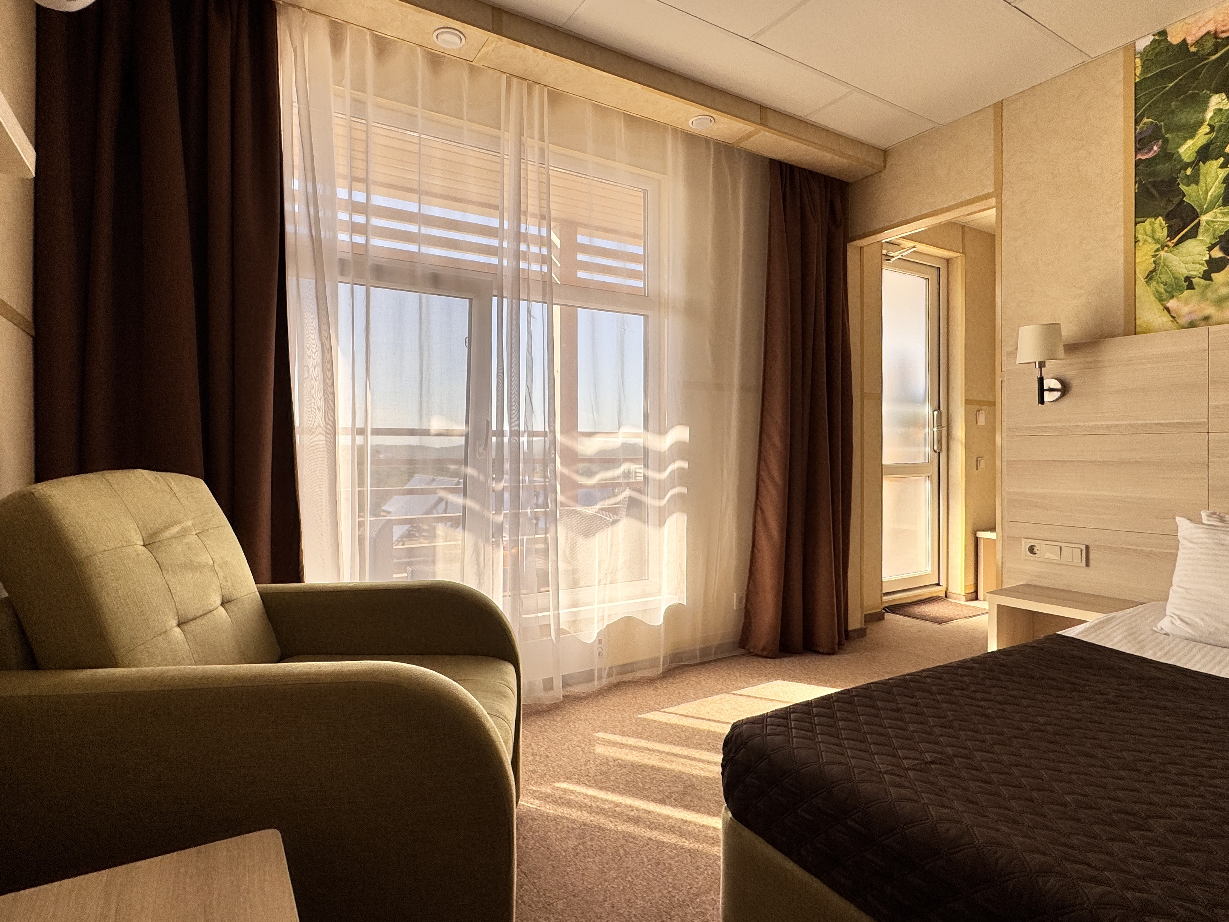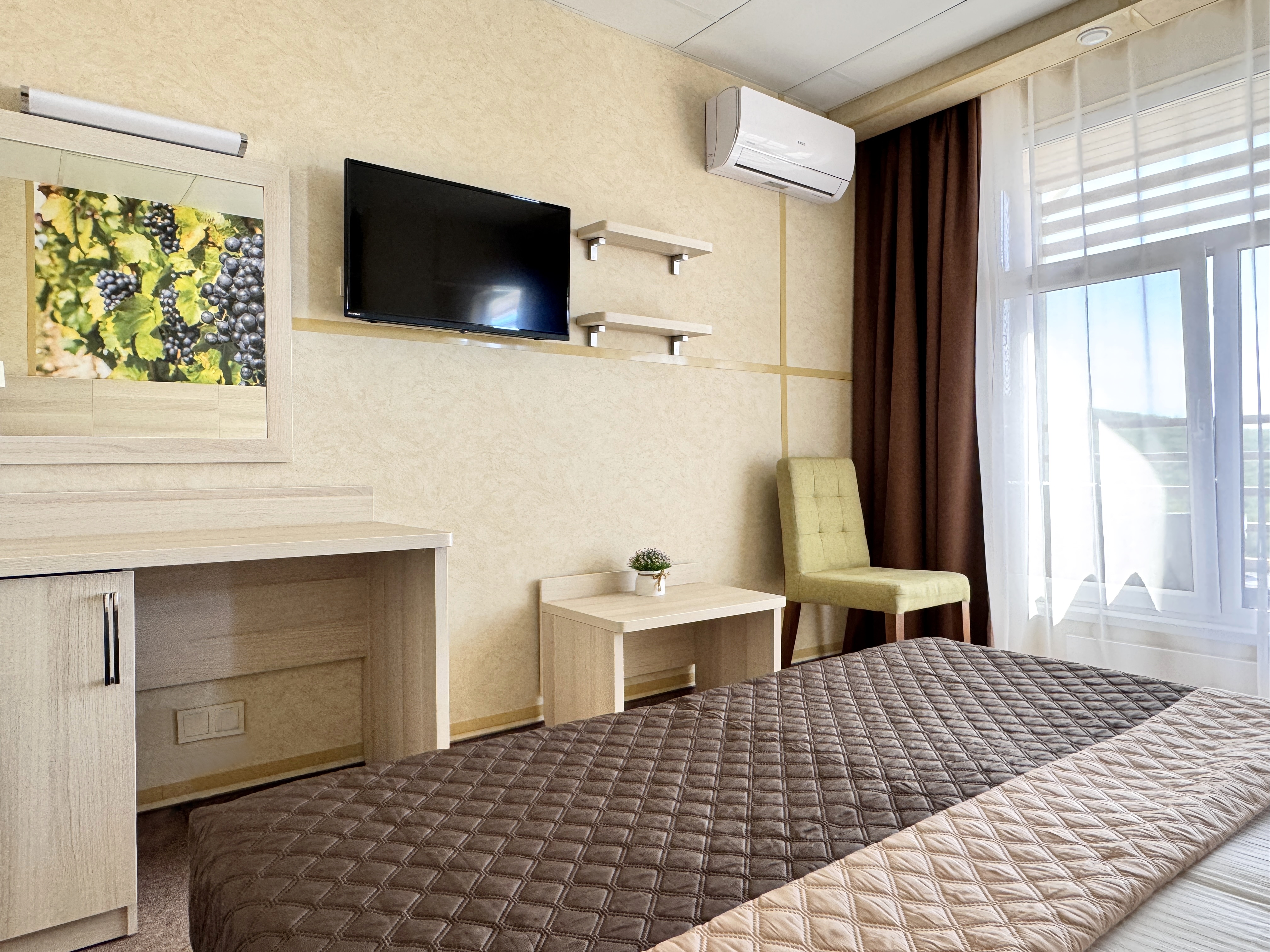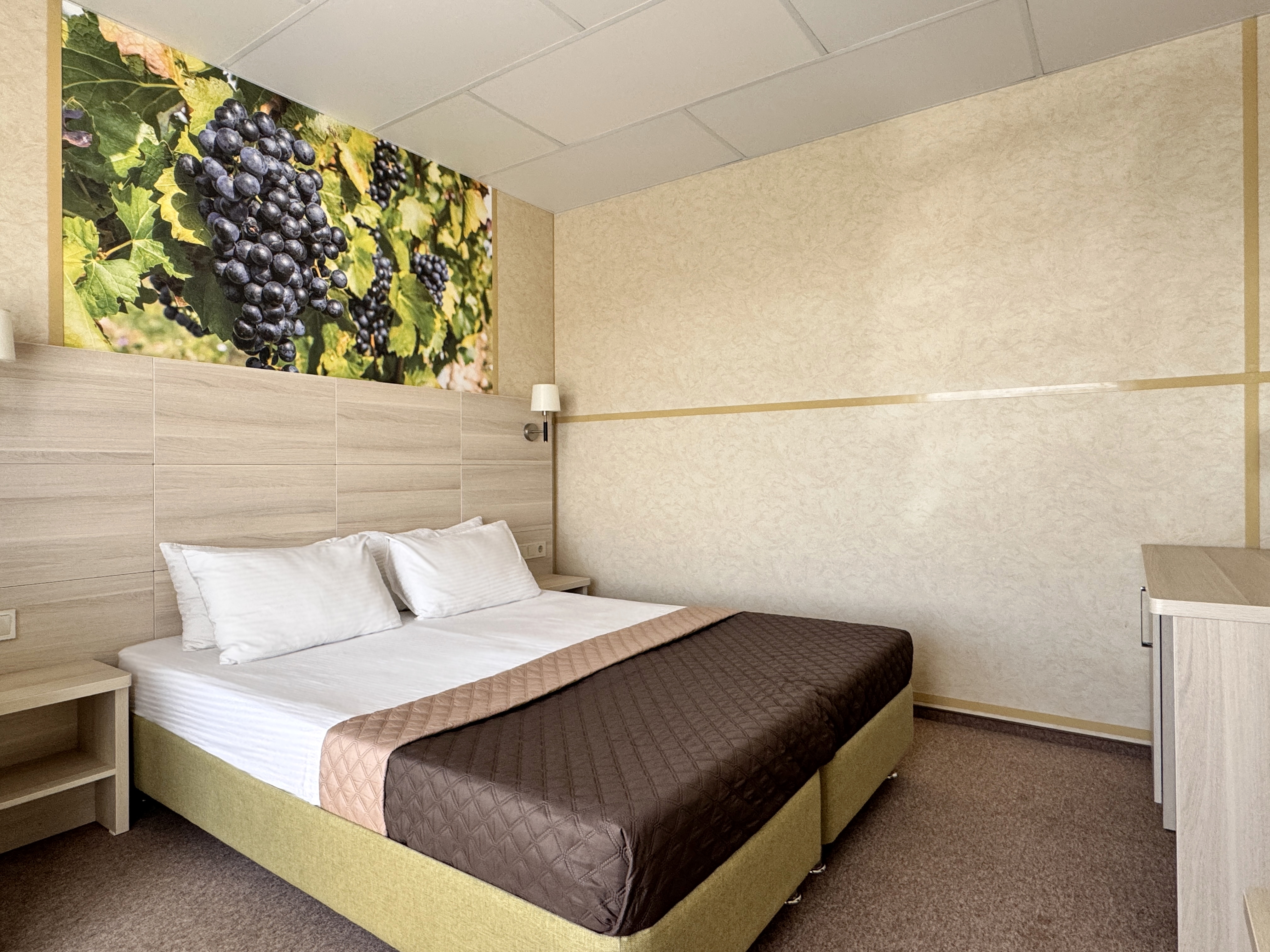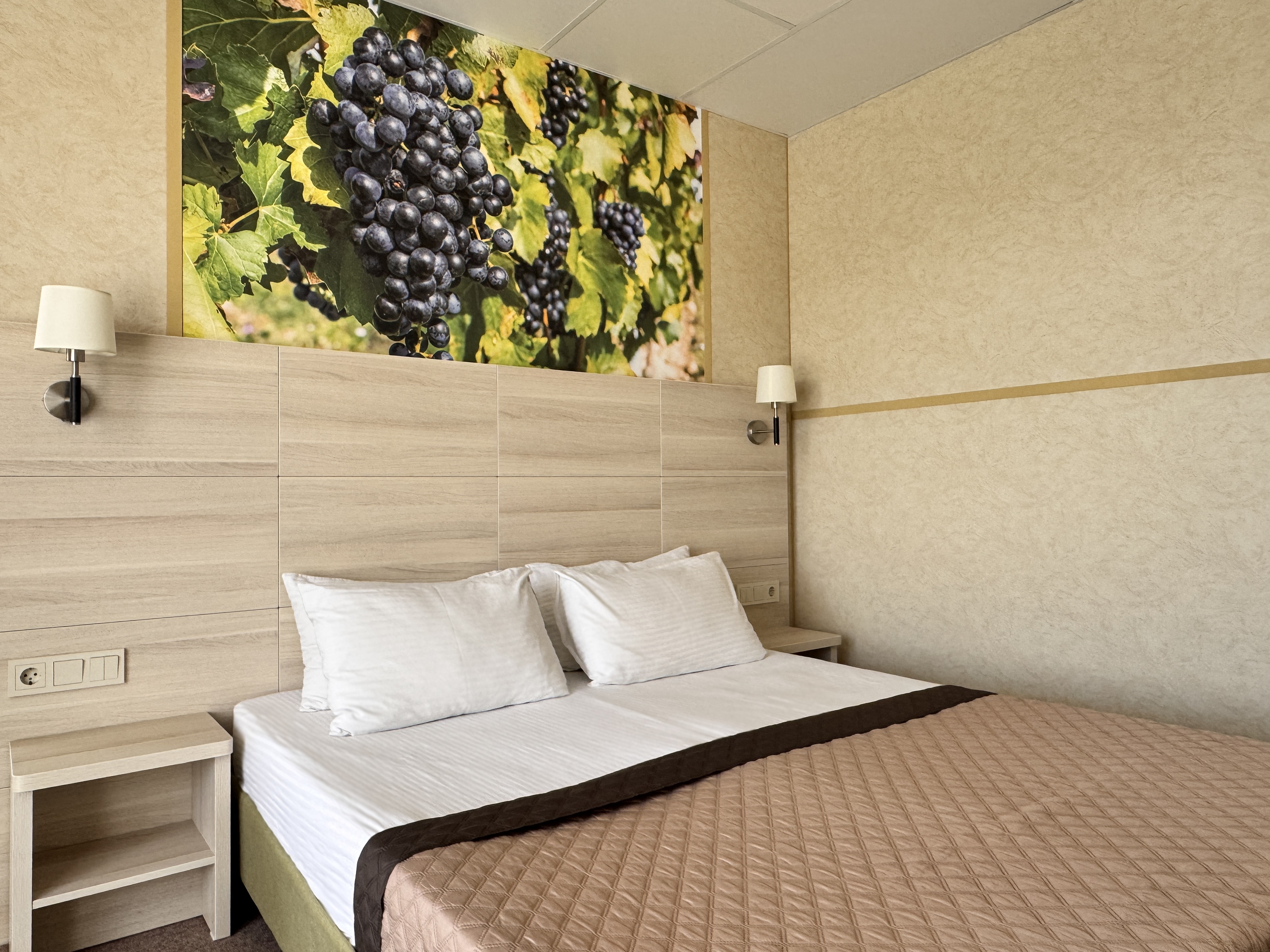 Построенный из натуральных материалов и гармонично вписанный в окружающий ландшафт, отель представляет собой комплекс уютных, комфортабельных корпусов. Каждый номер имеет определённое название одного из сорта винограда и оборудован всем необходимым для комфортного проживания – удобными кроватями, кондиционером, феном, электрочайником, мини-холодильником, телевизором, феном и собственной ванной комнатой.