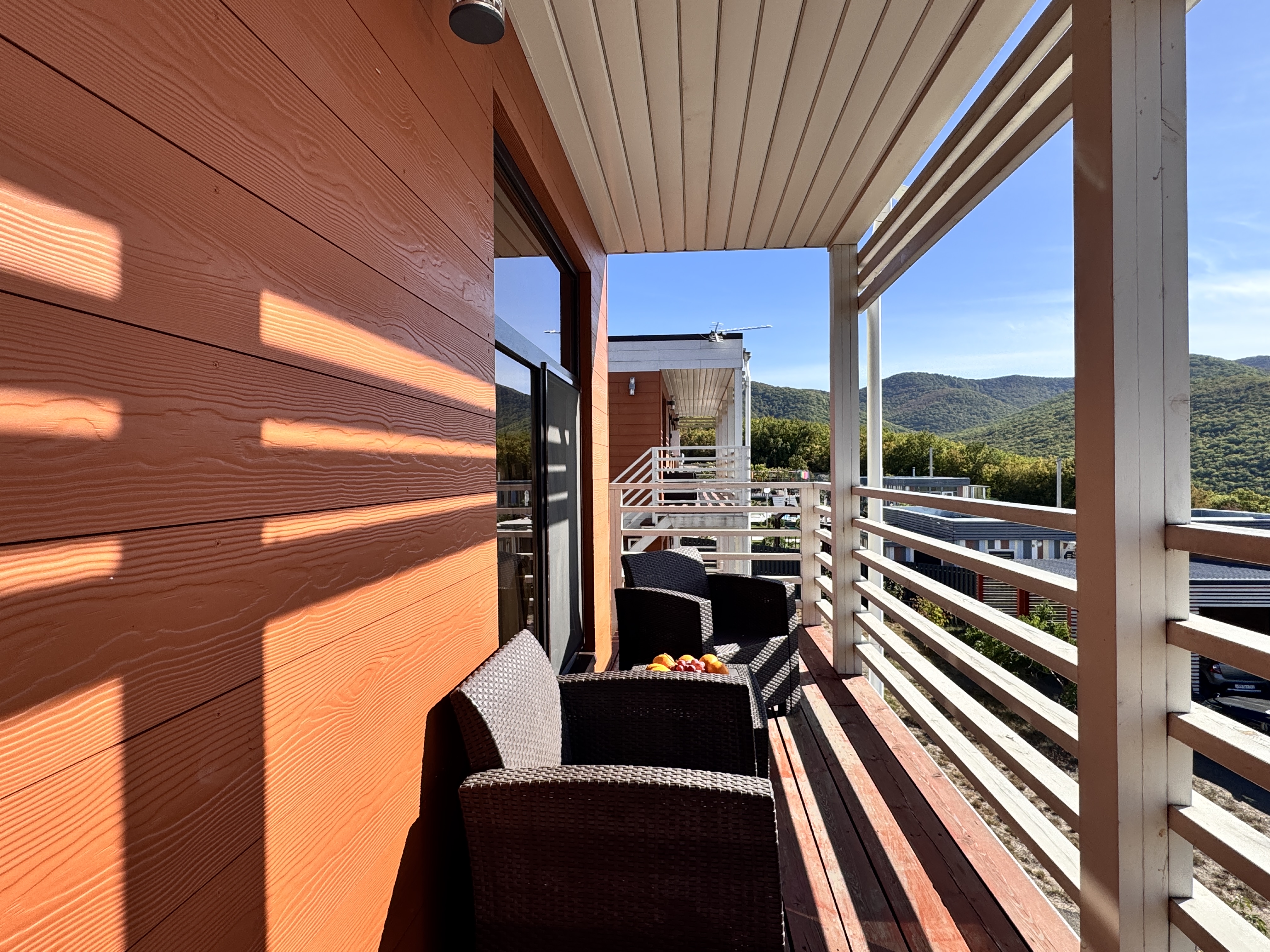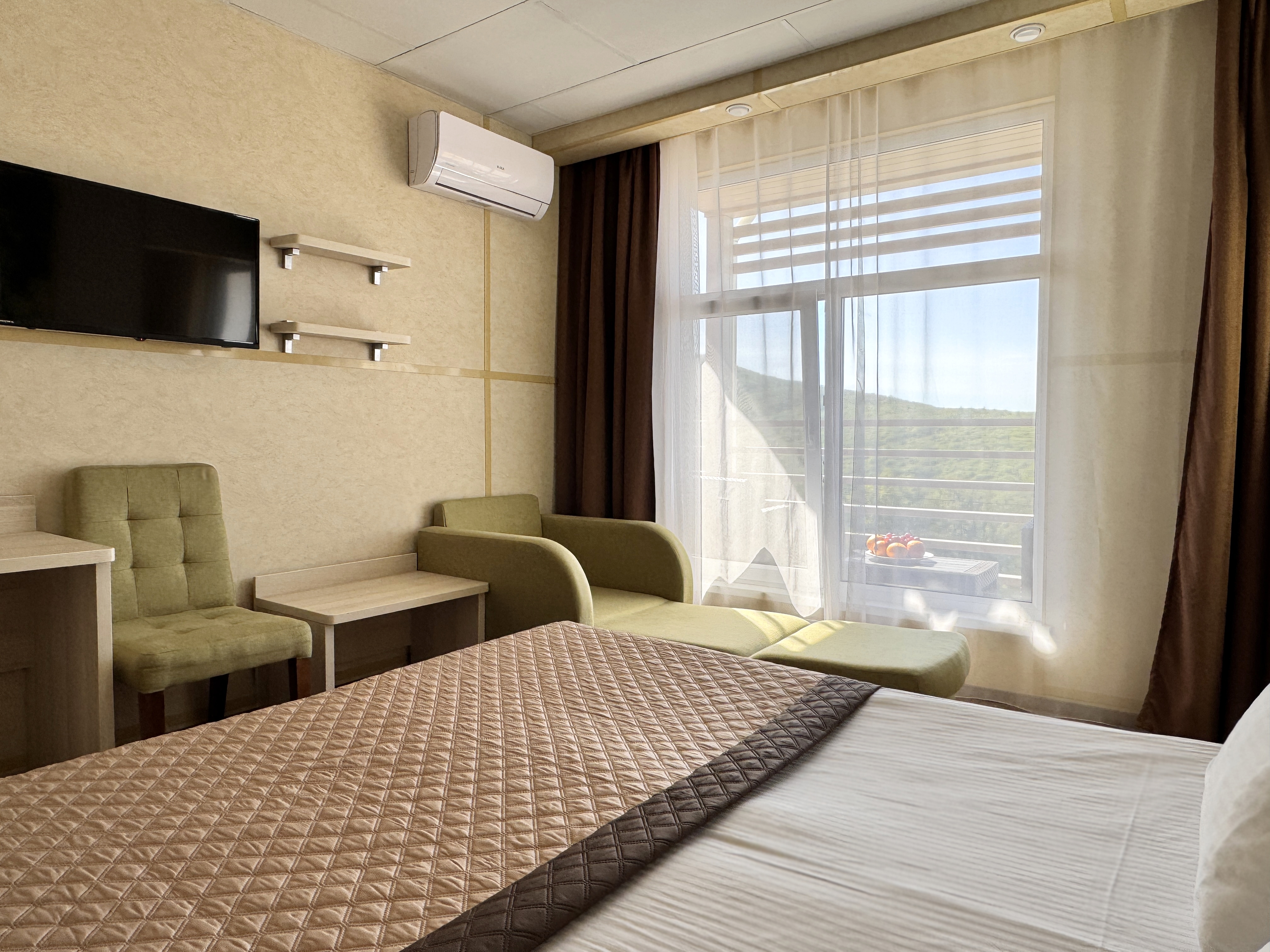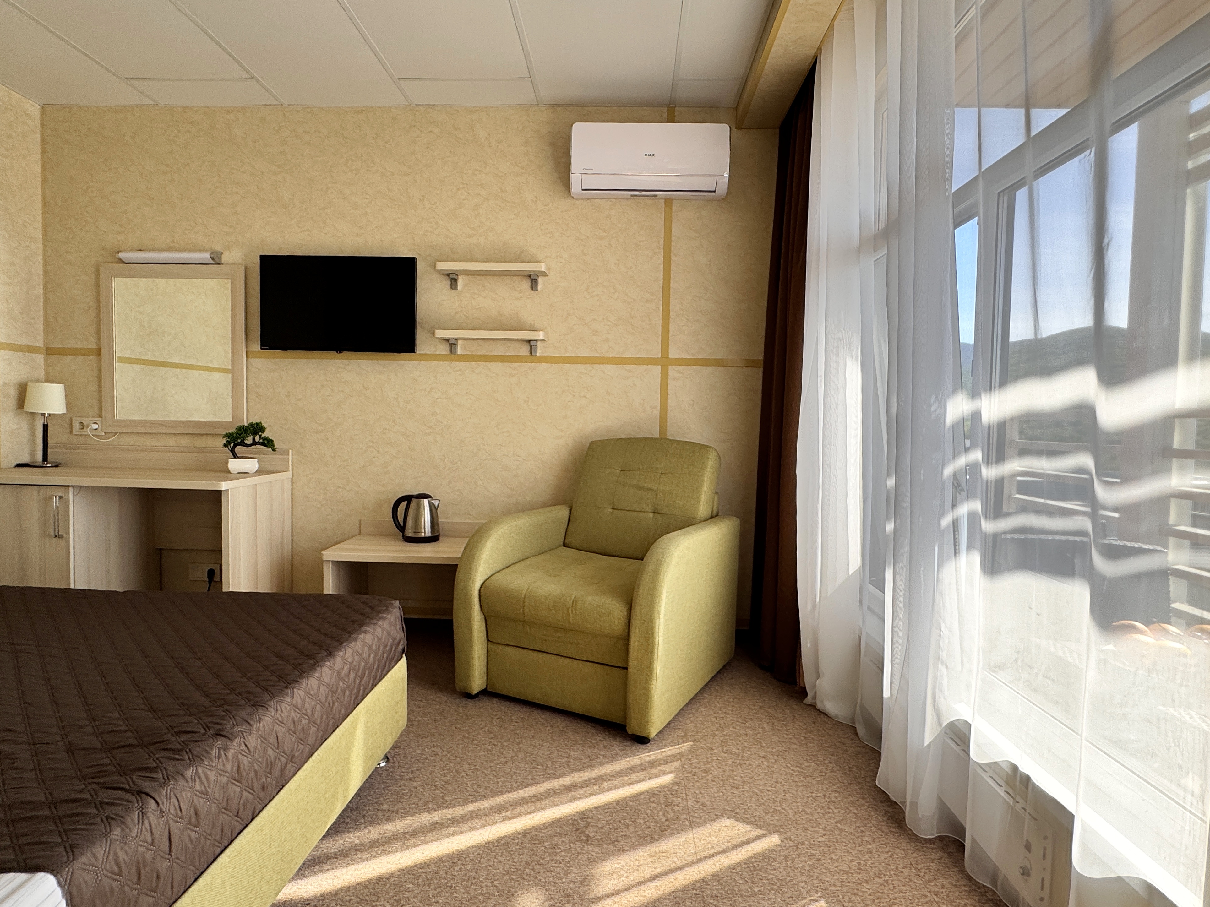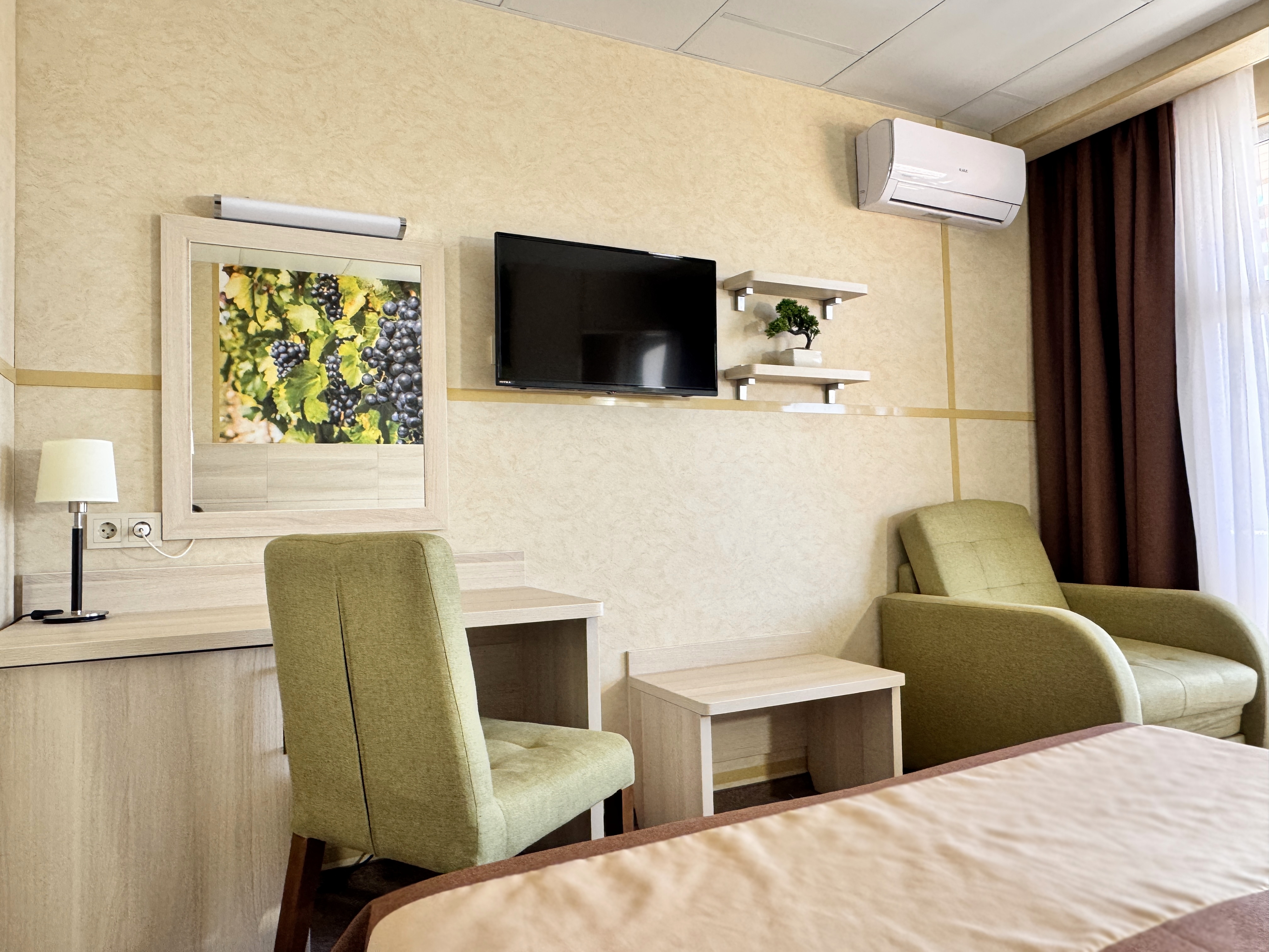 Построенный из натуральных материалов и гармонично вписанный в окружающий ландшафт, отель представляет собой комплекс уютных, комфортабельных корпусов. Каждый номер имеет определённое название одного из сорта винограда и оборудован всем необходимым для комфортного проживания – удобными кроватями, кондиционером, феном, электрочайником, мини-холодильником, телевизором, феном и собственной ванной комнатой.
