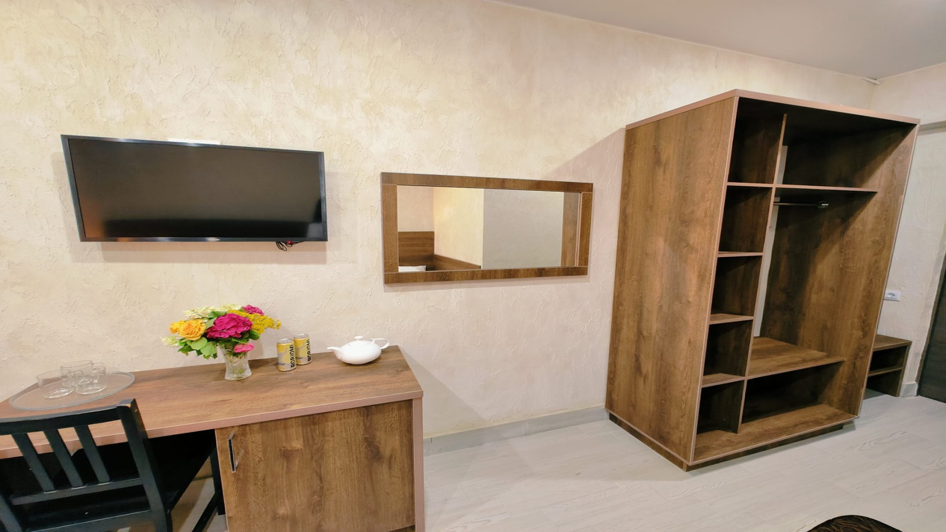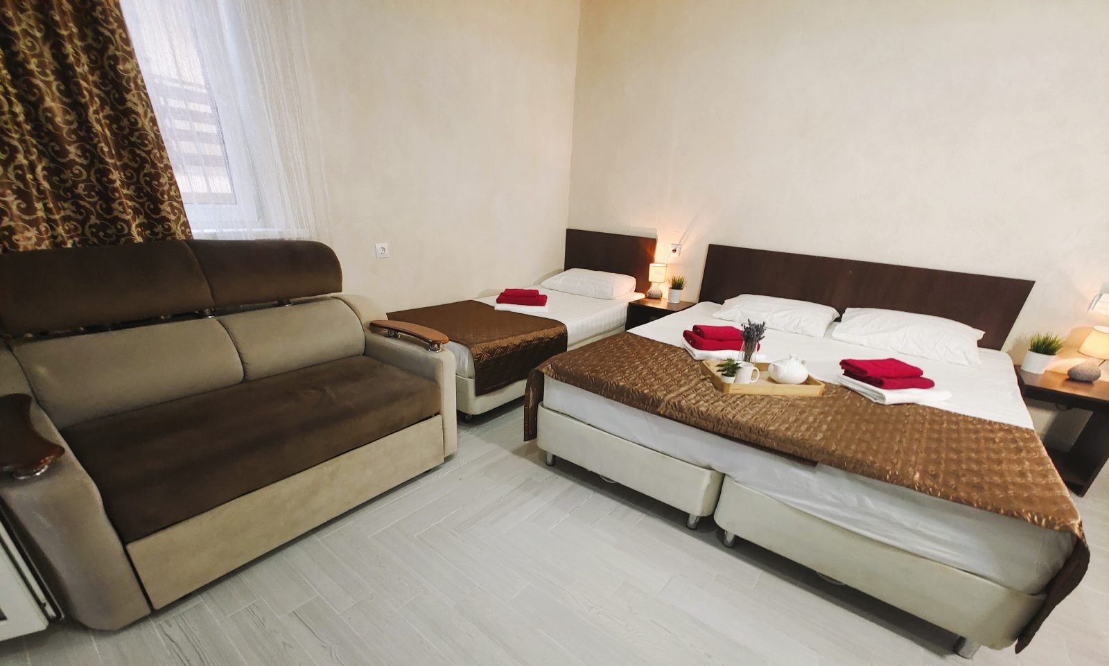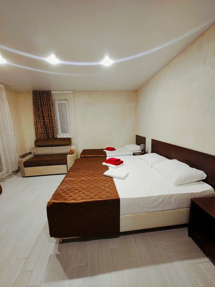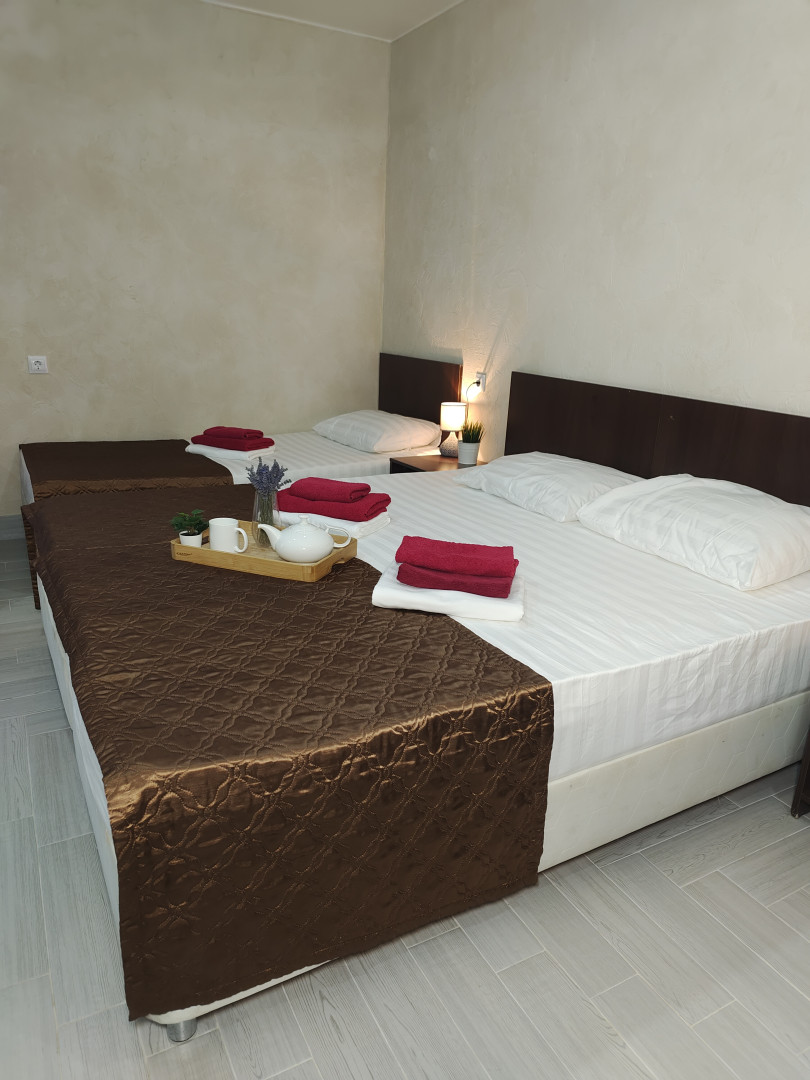 - В номере: душ, туалет, ТВ, холодильник, кондиционер, фен, односпальная кровать, двуспальная кровать, диван (1.20)