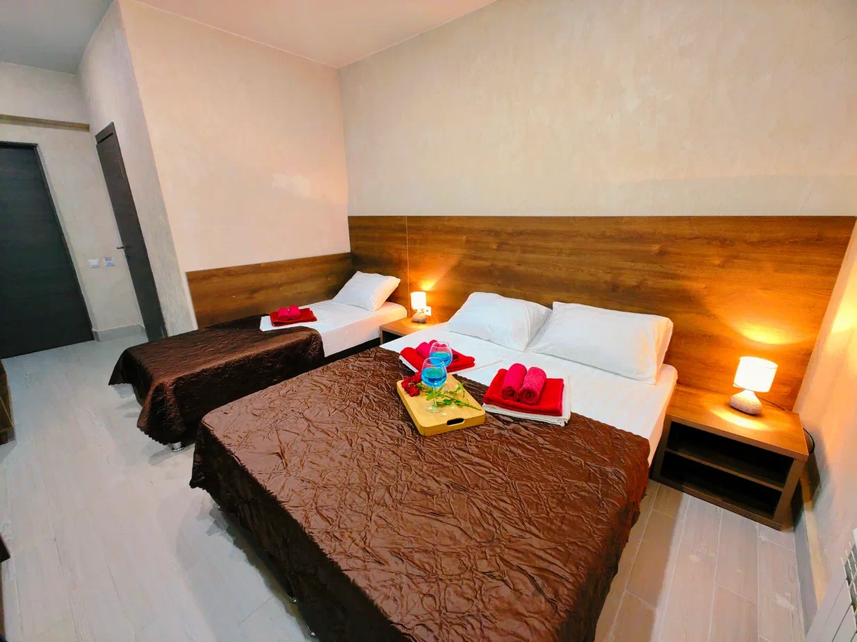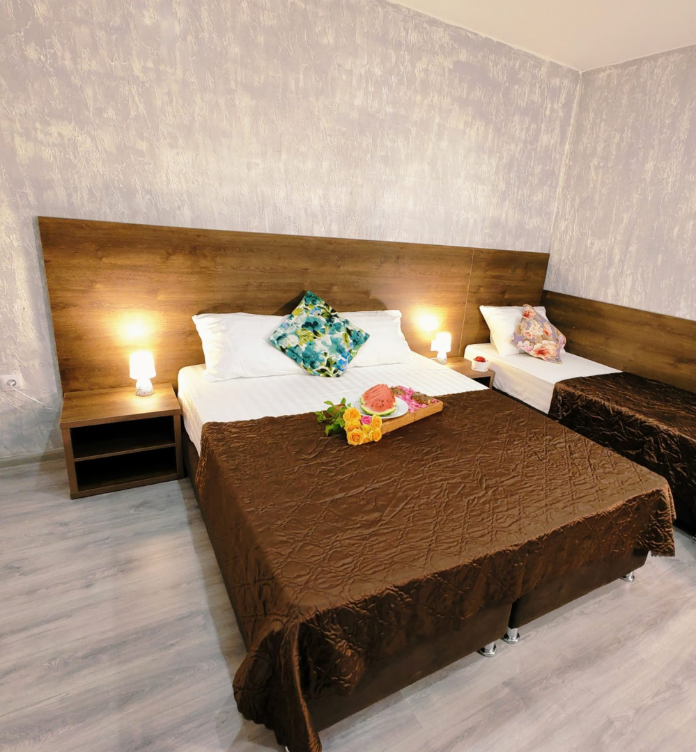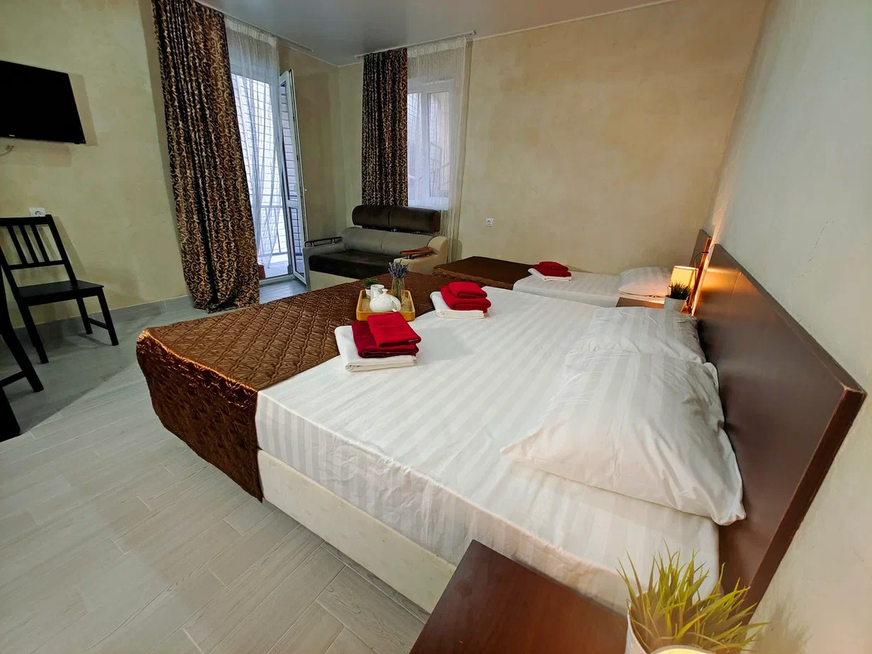 - В номере: душ, туалет, ТВ, холодильник, кондиционер, двуспальная кровать (две кровати), диван (раскладной), балкон