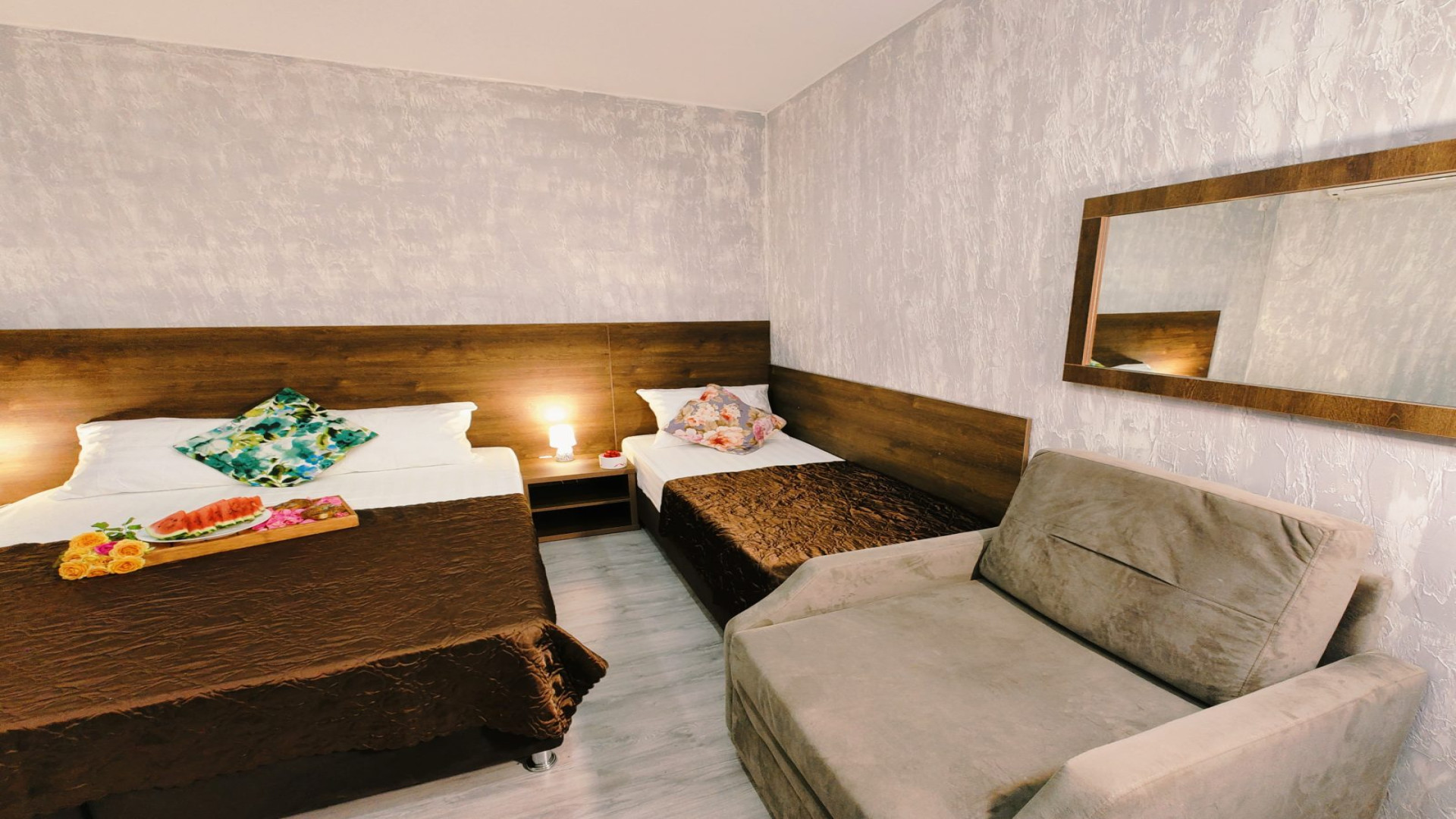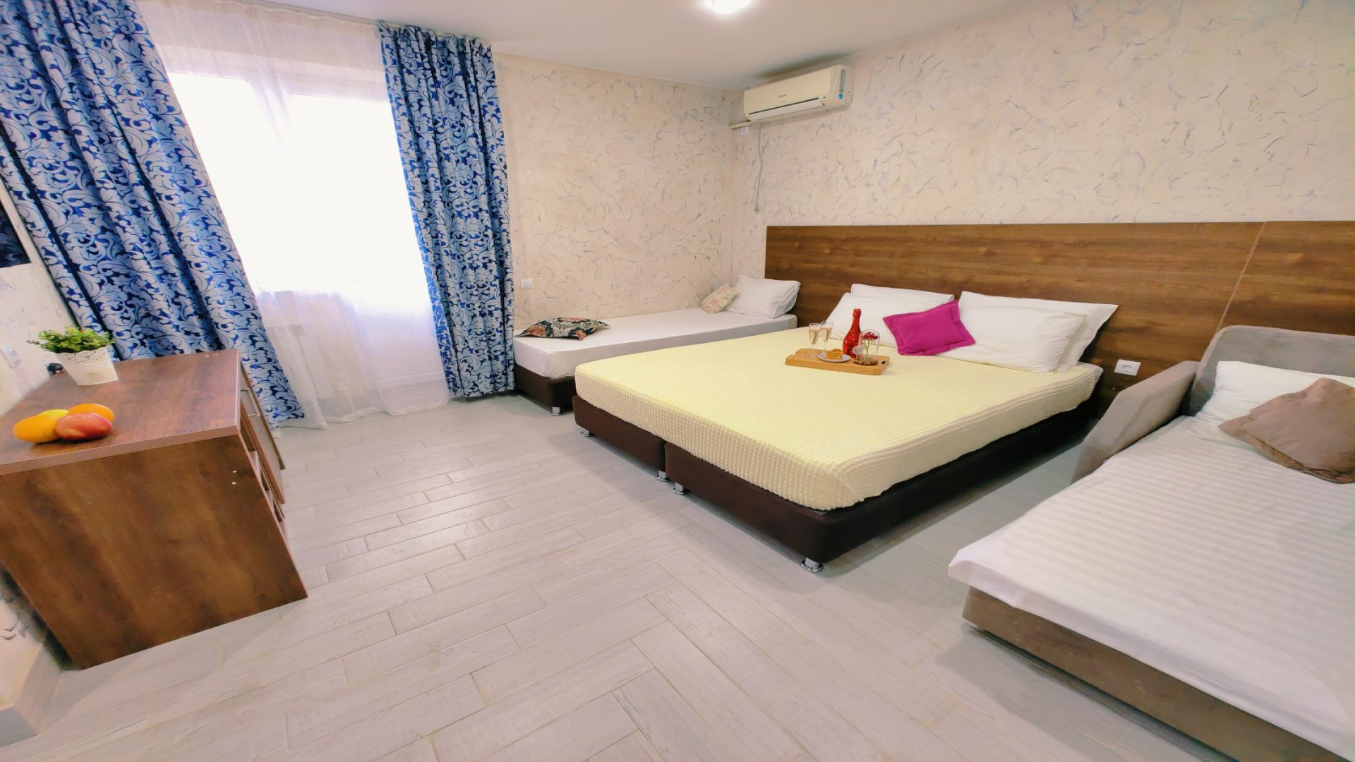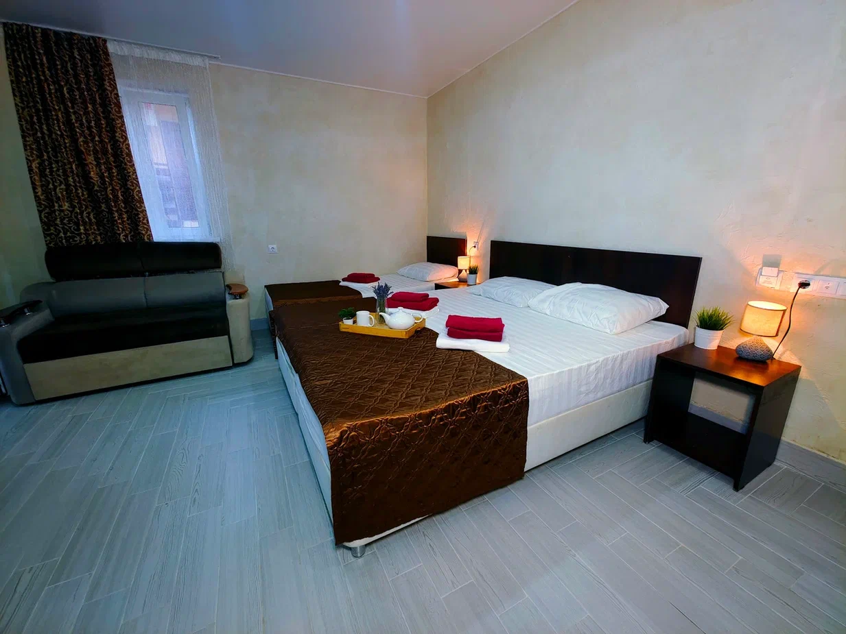 - В номере: душ, туалет, ТВ, холодильник, кондиционер, двуспальная кровать (две кровати), диван (раскладной), балкон