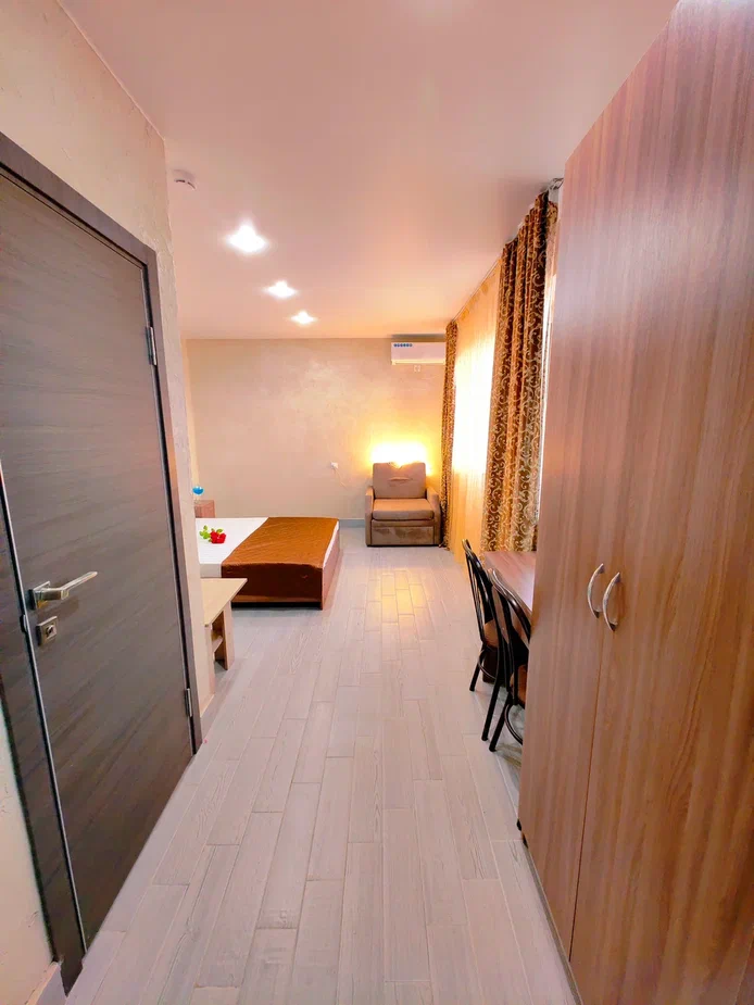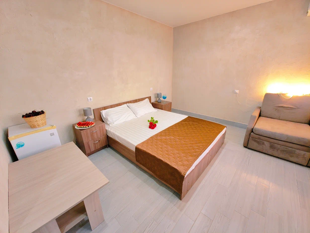- В номере: душ, туалет, ТВ, холодильник, кондиционер, двуспальная кровать, кресло (раскладное)