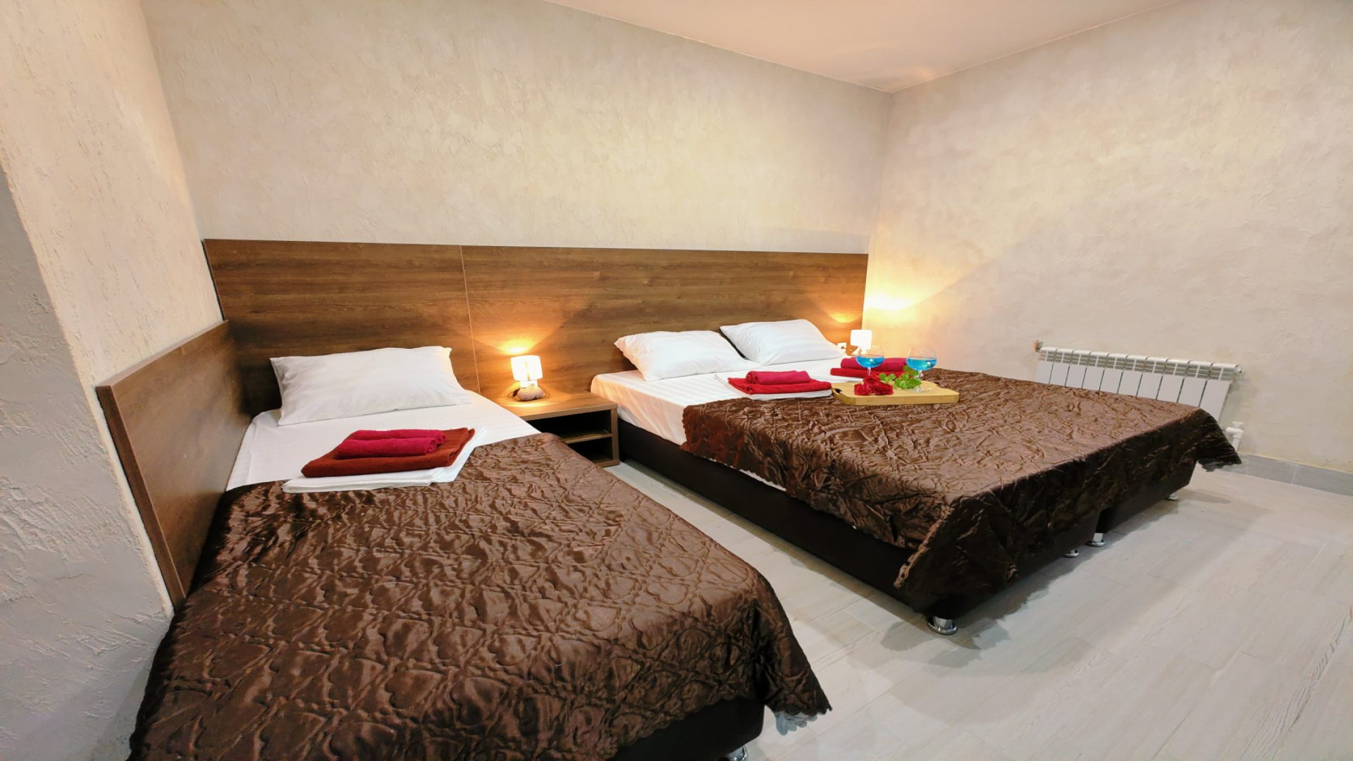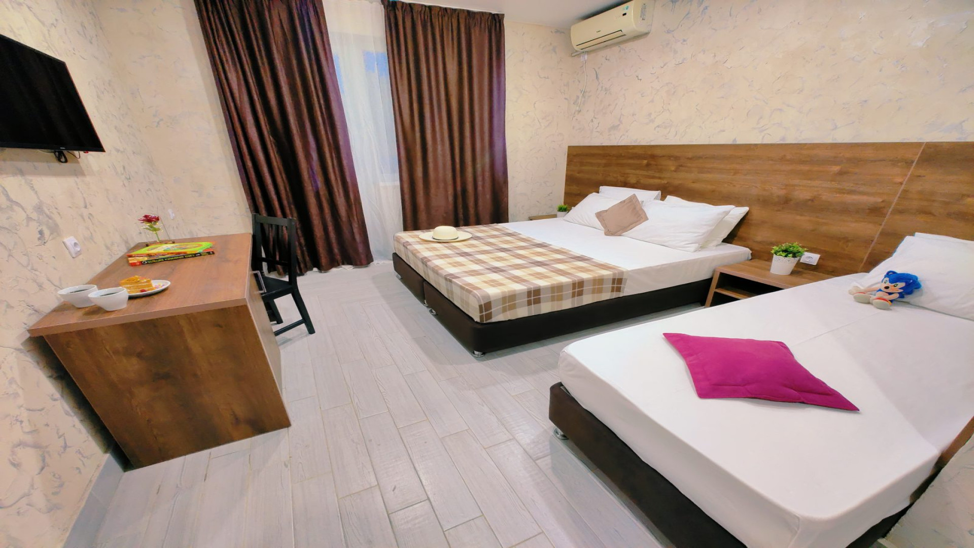 - В номере: душ, туалет, ТВ, холодильник, кондиционер, односпальная кровать, двуспальная кровать