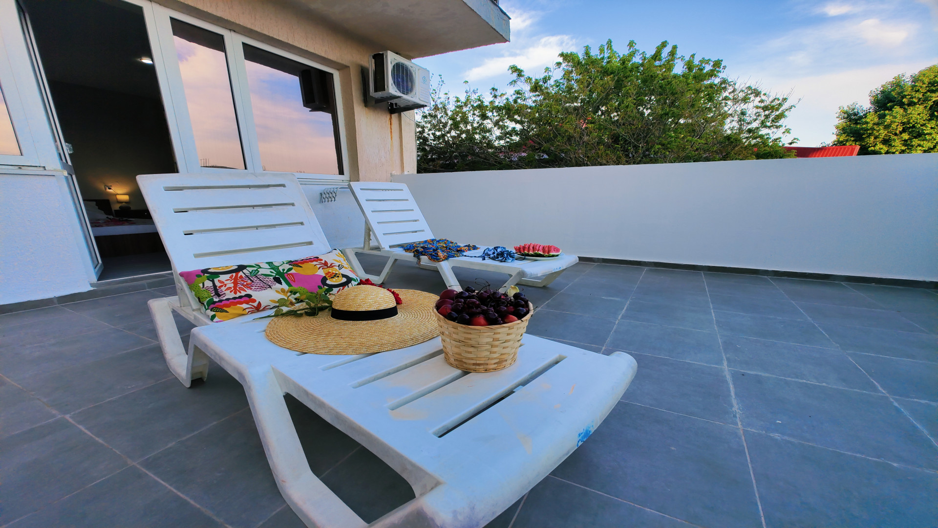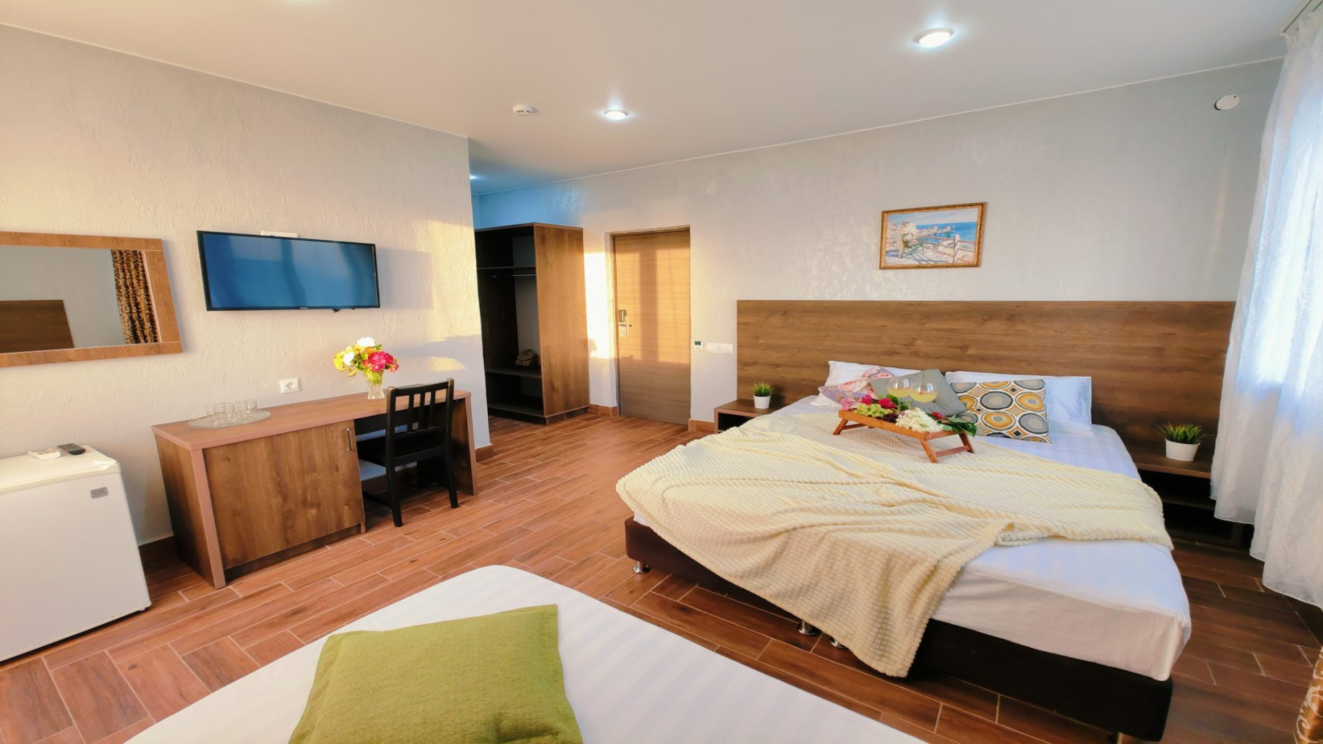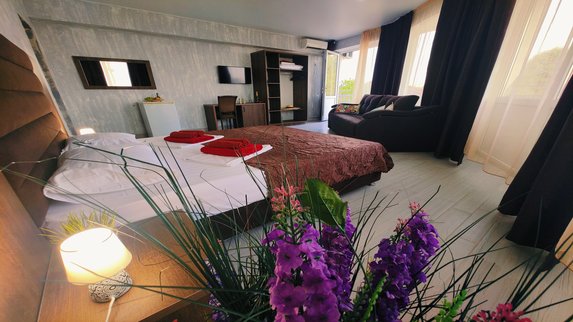 - В номере: душ, туалет, ТВ, холодильник, кондиционер, двуспальная кровать, балкон