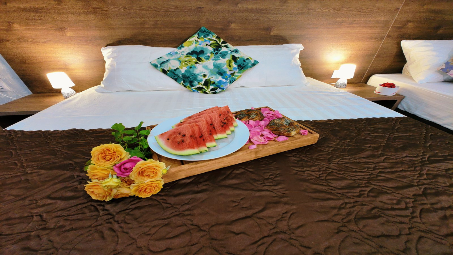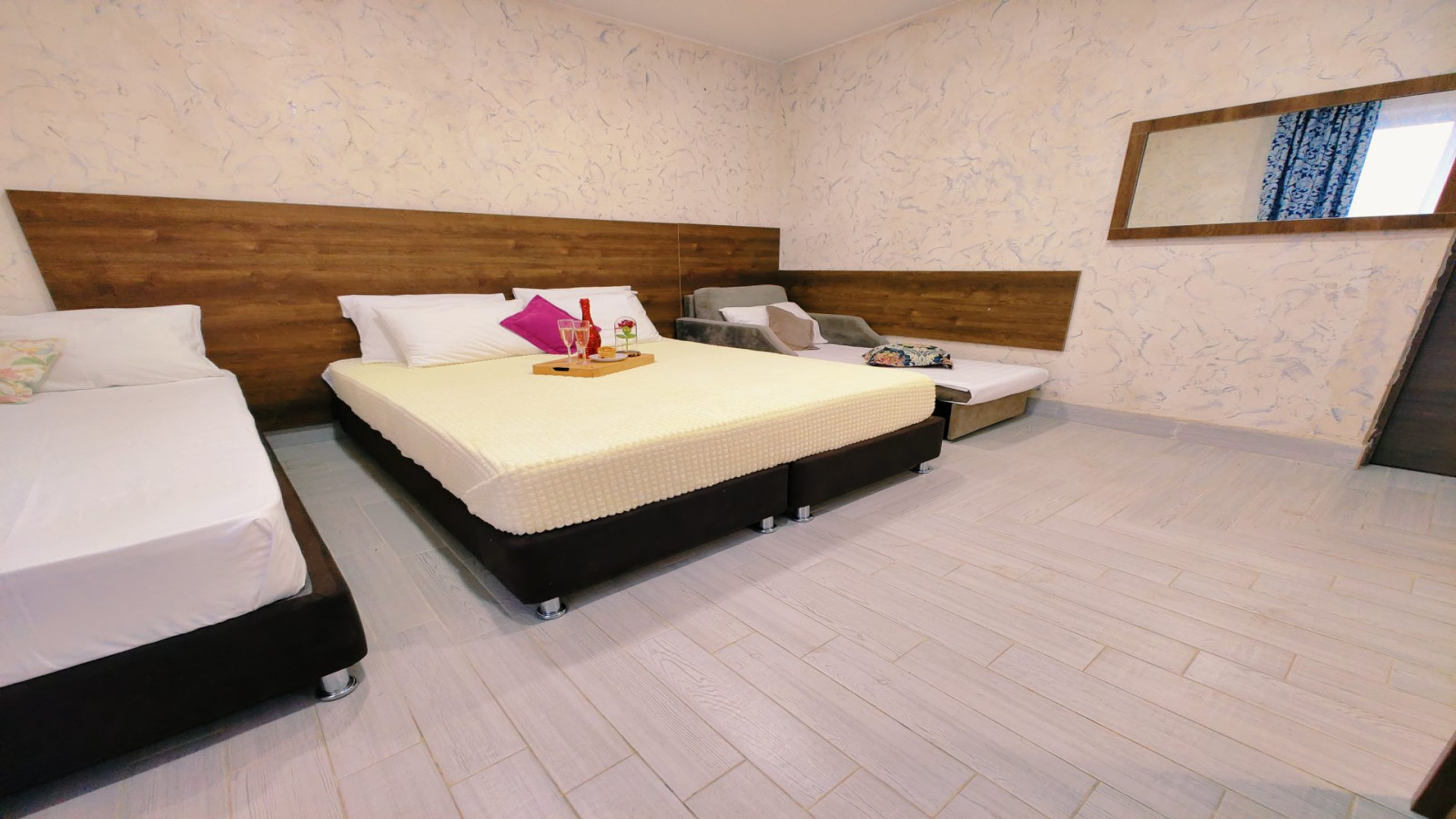- В номере: душ, туалет, ТВ, холодильник, кондиционер, двуспальная кровать (две), кресло