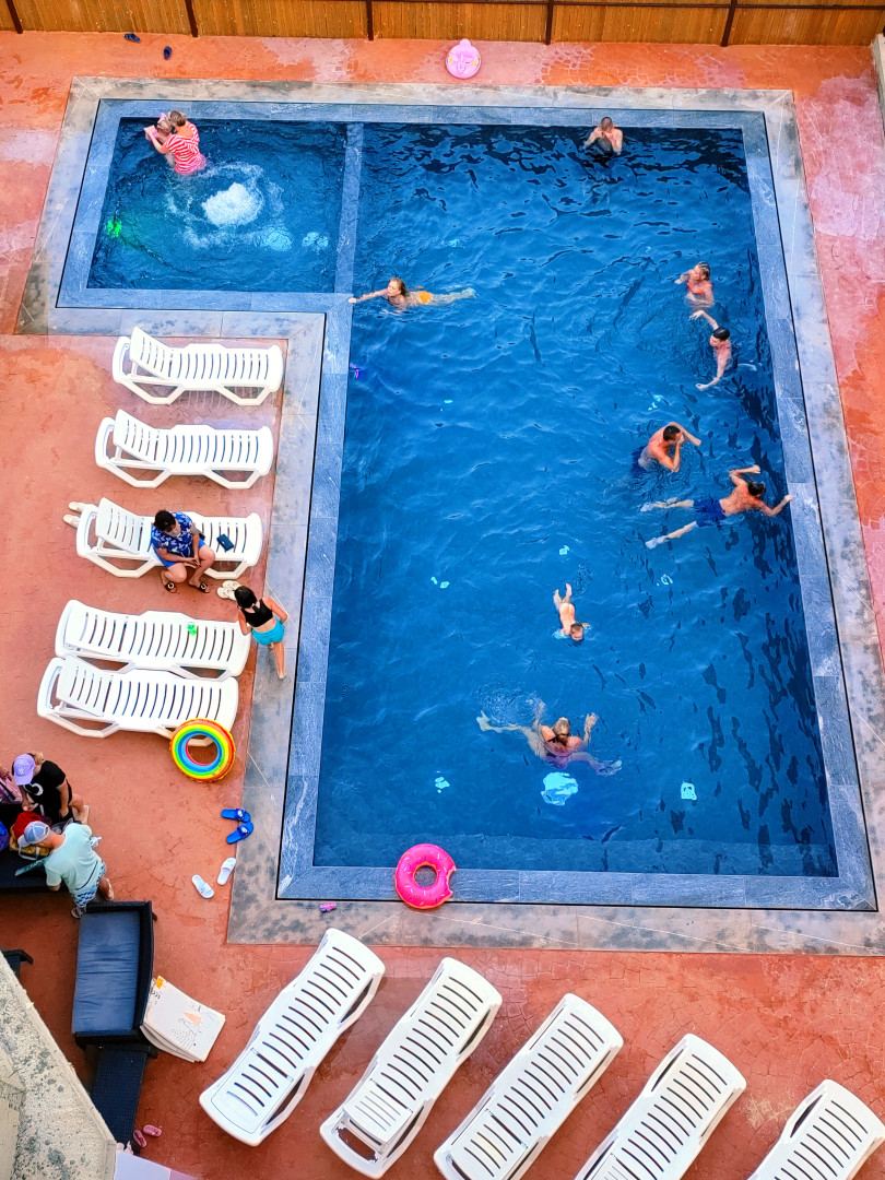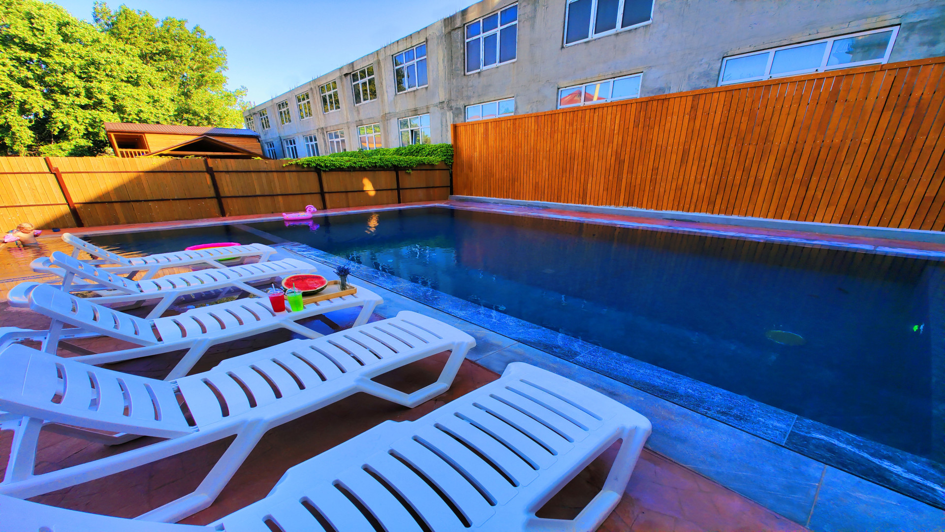 На территории расположен большой открытый бассейн с зонами для взрослых и детей. Для маленьких гостей работает детский клуб, где они смогут весело и безопасно провести время.