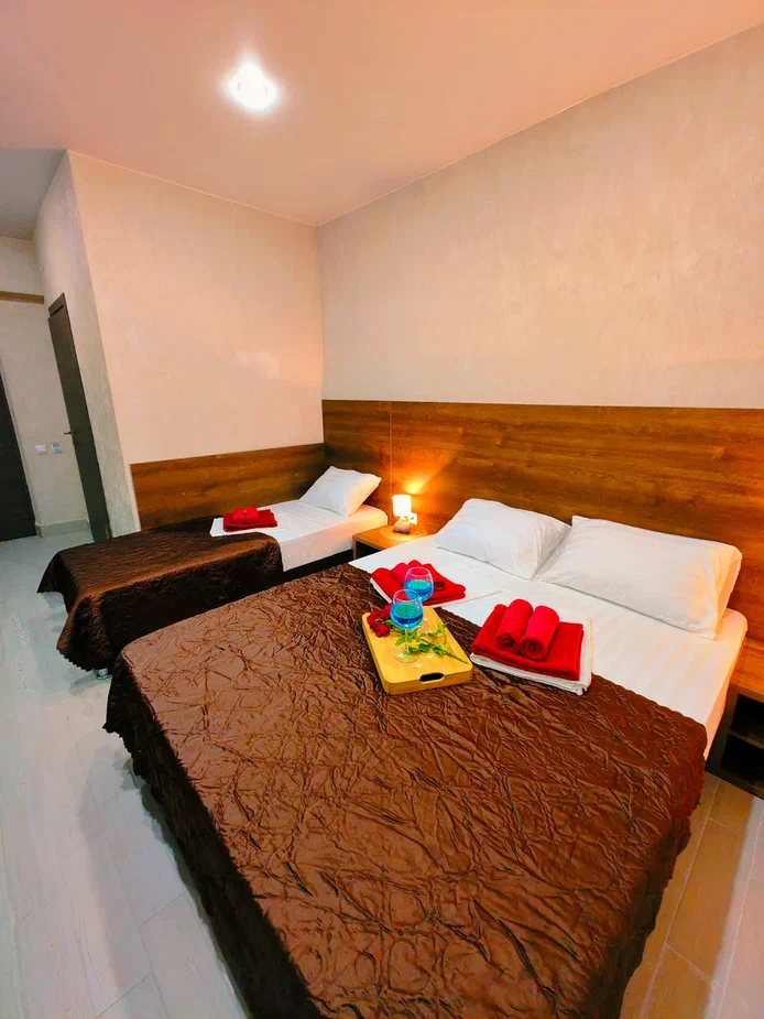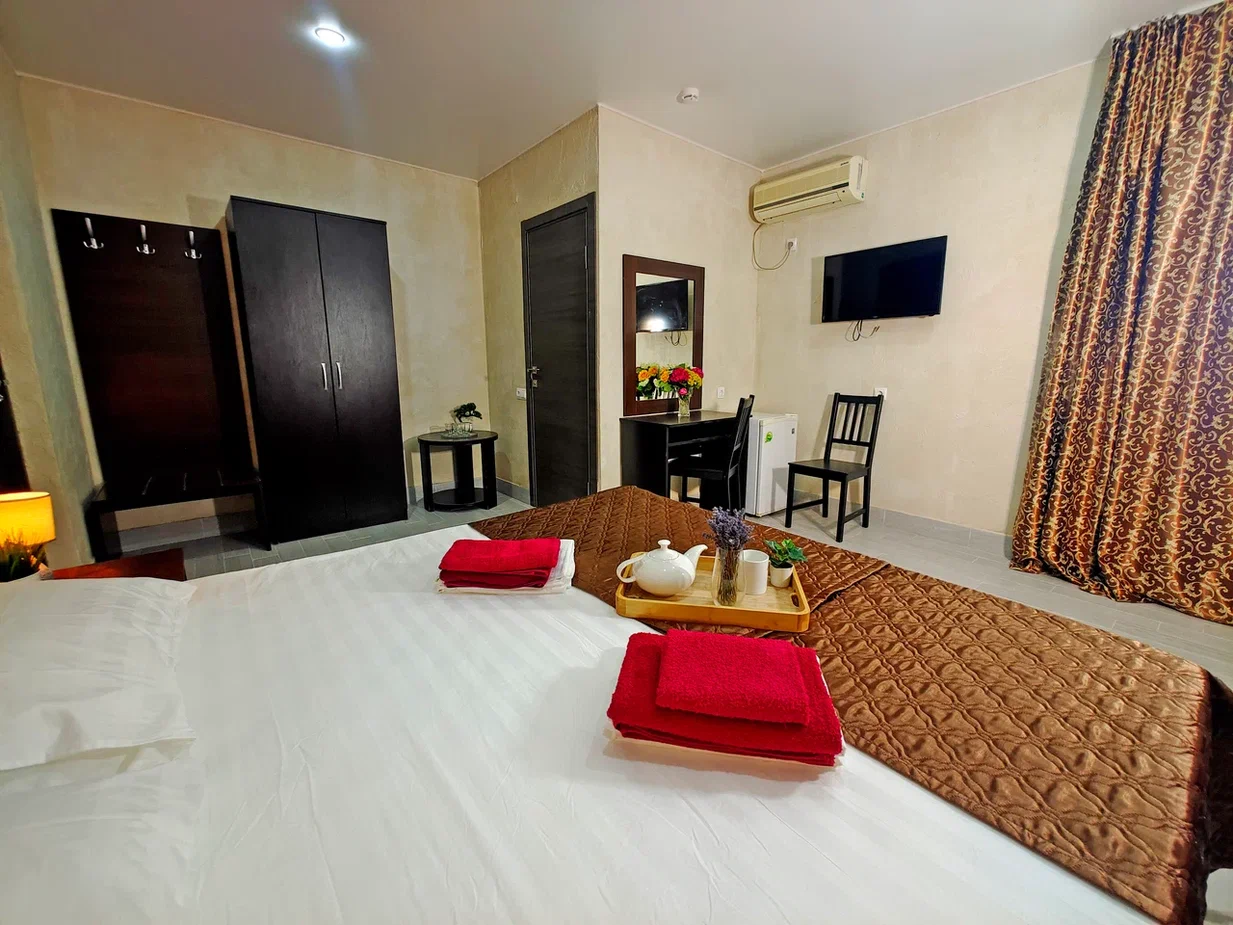 - В номере: душ, туалет, ТВ, холодильник, кондиционер, фен, односпальная кровать, двуспальная кровать