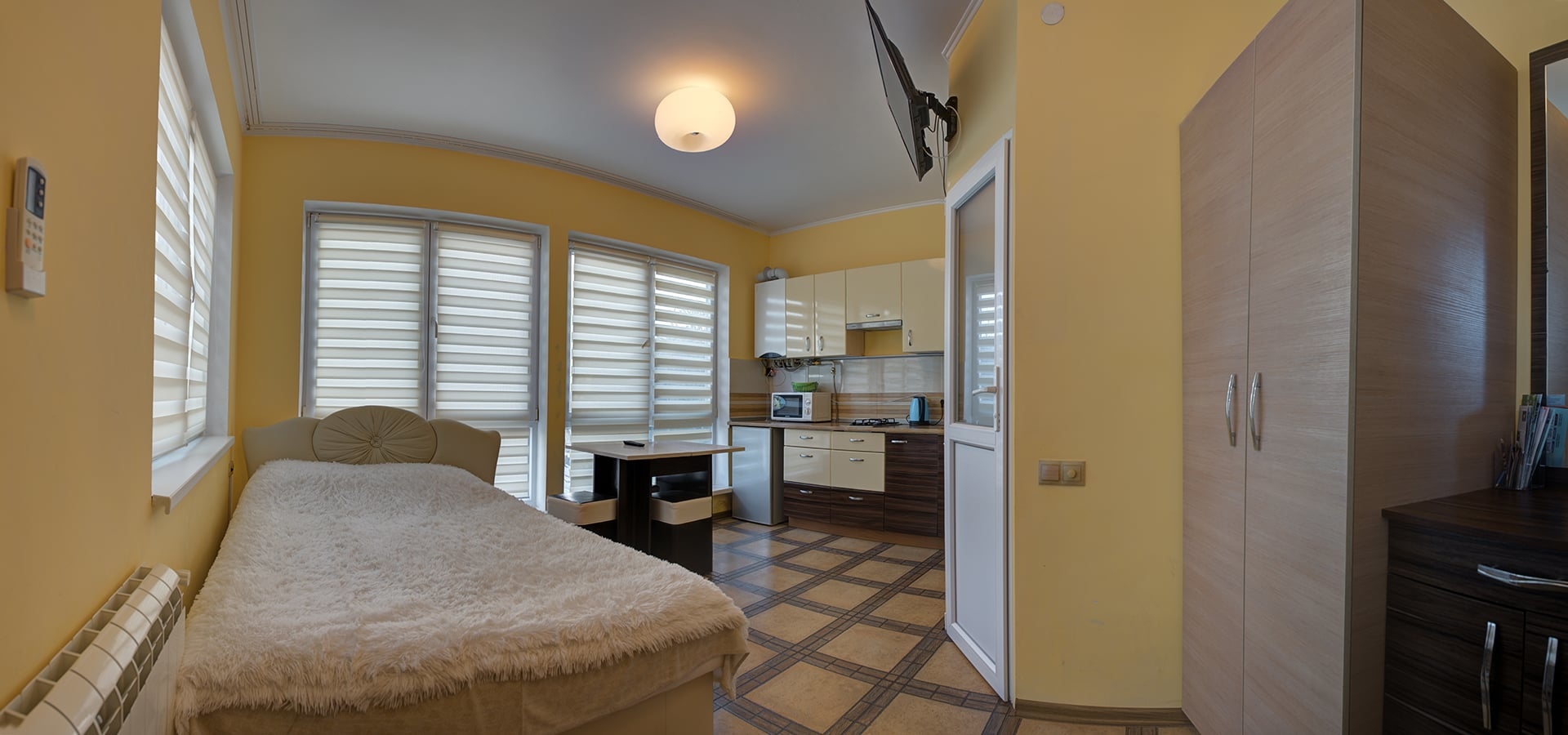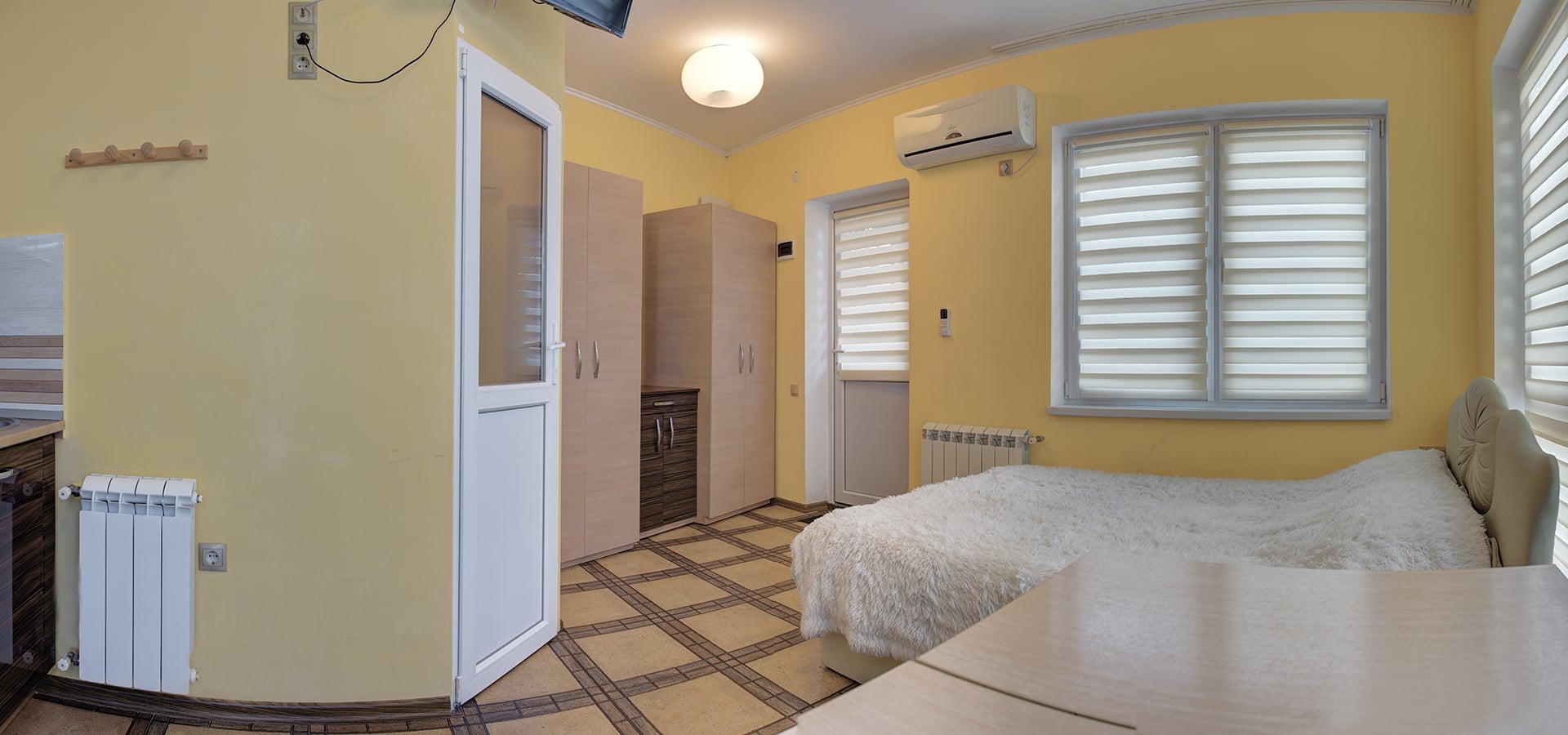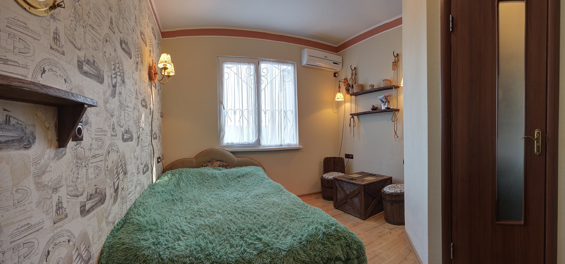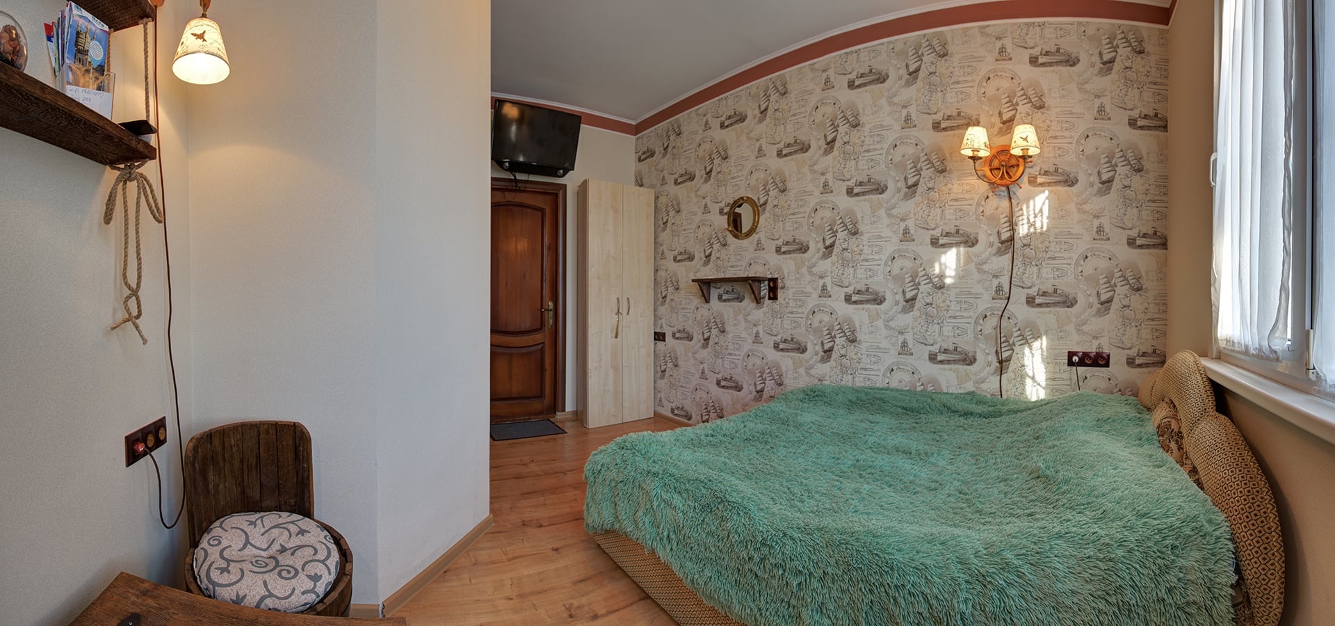 Первый этаж занят тремя номерами: двумя трехместными и одним двухместным, оформленным в стиле морской каюты. "Гнездышко" - небольшой двухместный номер на втором этаже, оснащен личной кухней и предлагает частичные виды на море и город.