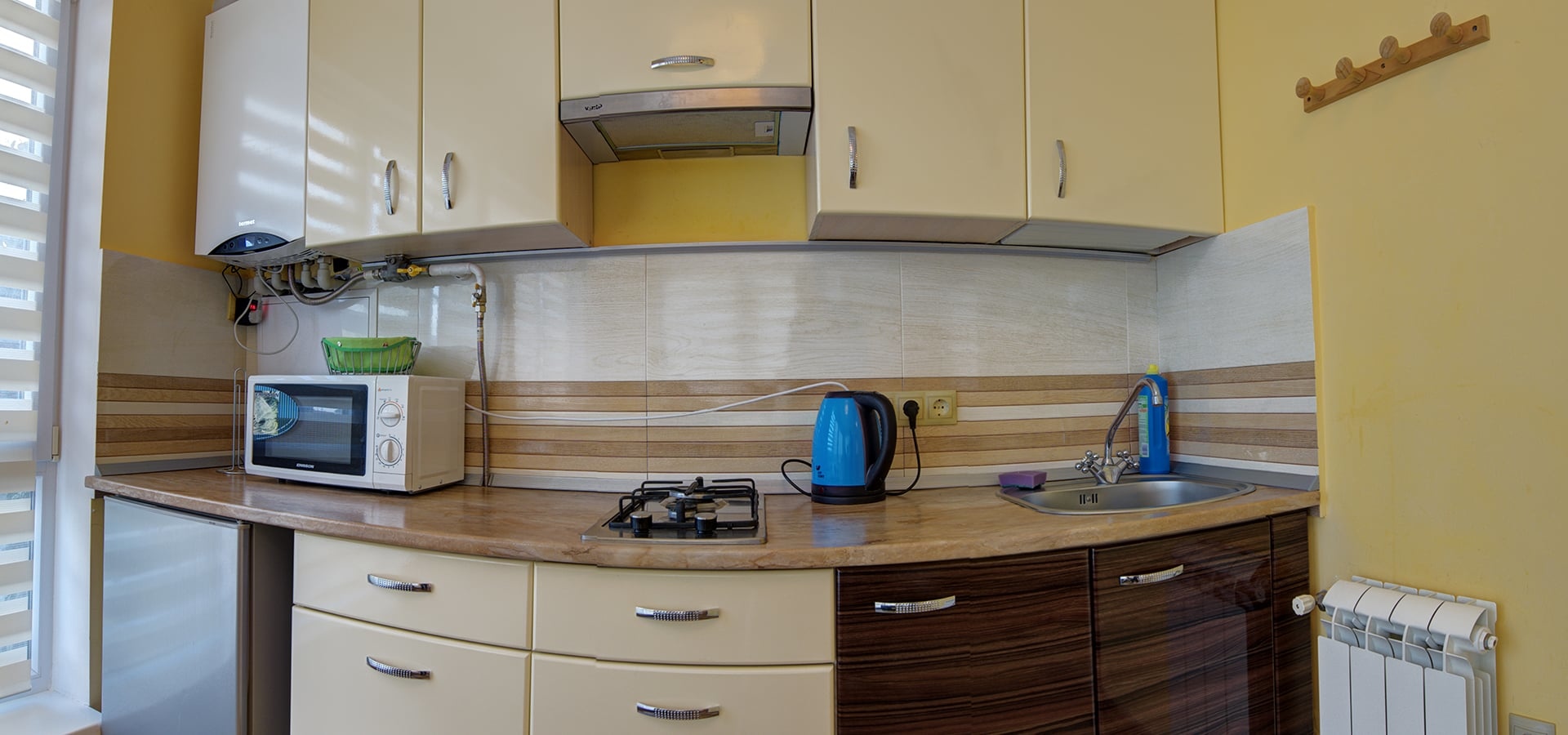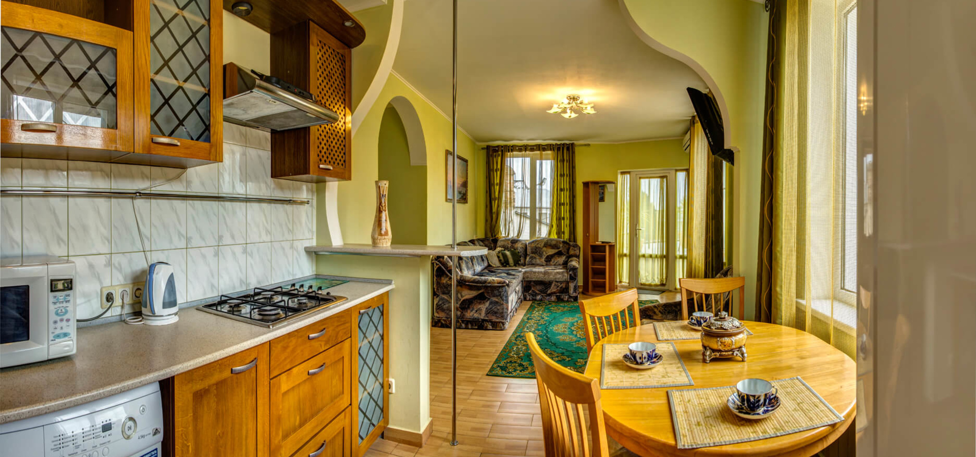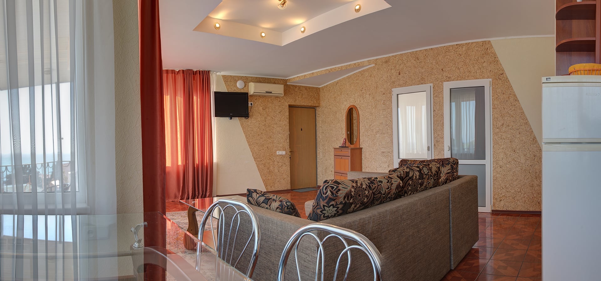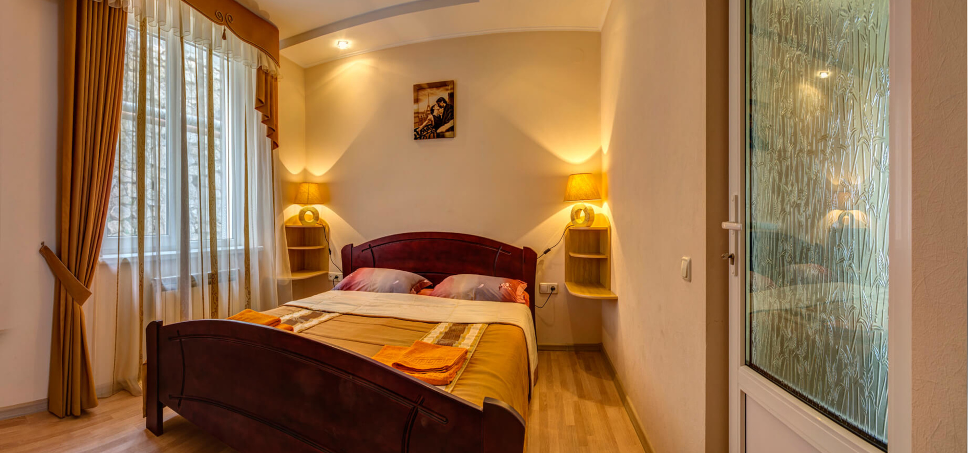 Первый этаж занят тремя номерами: двумя трехместными и одним двухместным, оформленным в стиле морской каюты. "Гнездышко" - небольшой двухместный номер на втором этаже, оснащен личной кухней и предлагает частичные виды на море и город.
