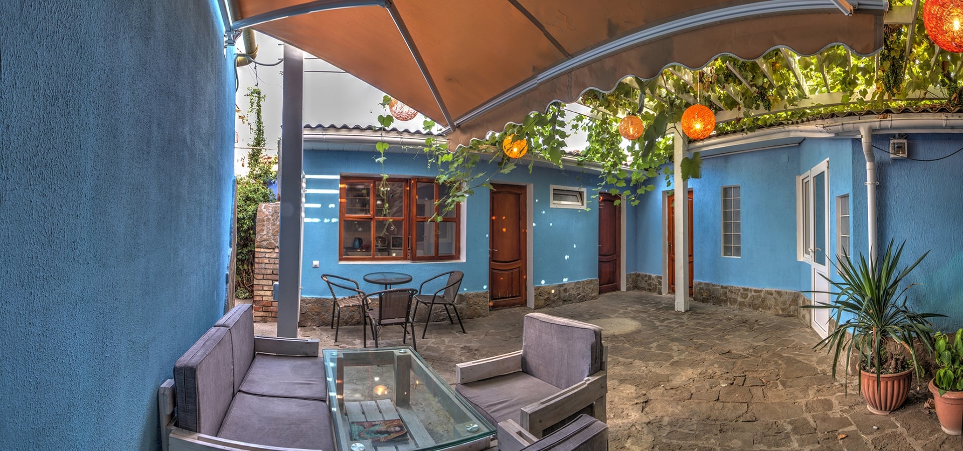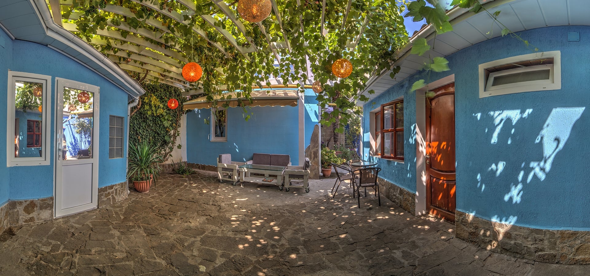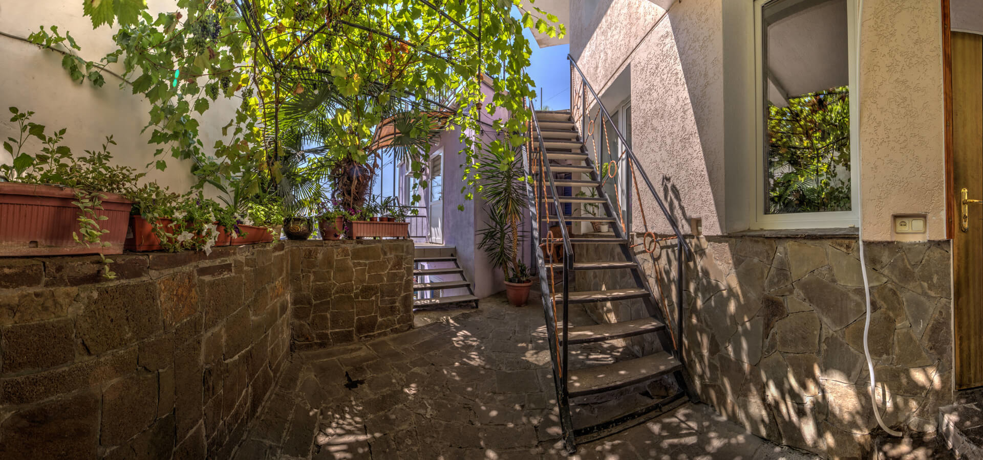 Дом скрыт от городской суеты в уединенном переулке и имеет собственный уютный дворик под тенью винограда.