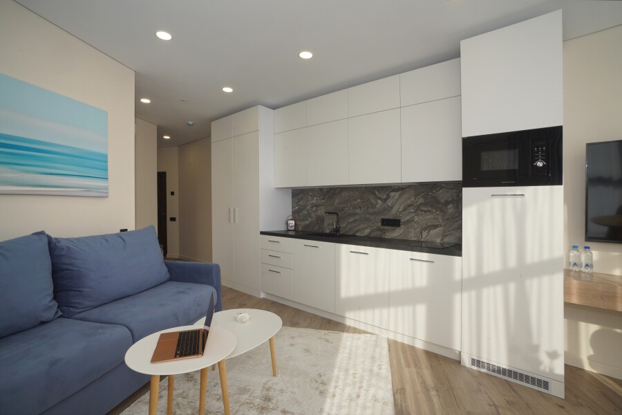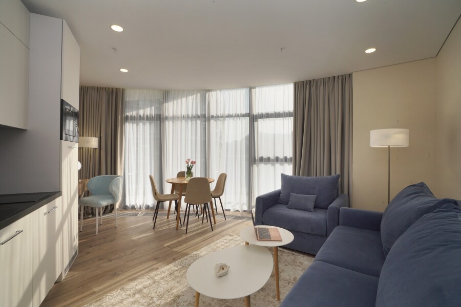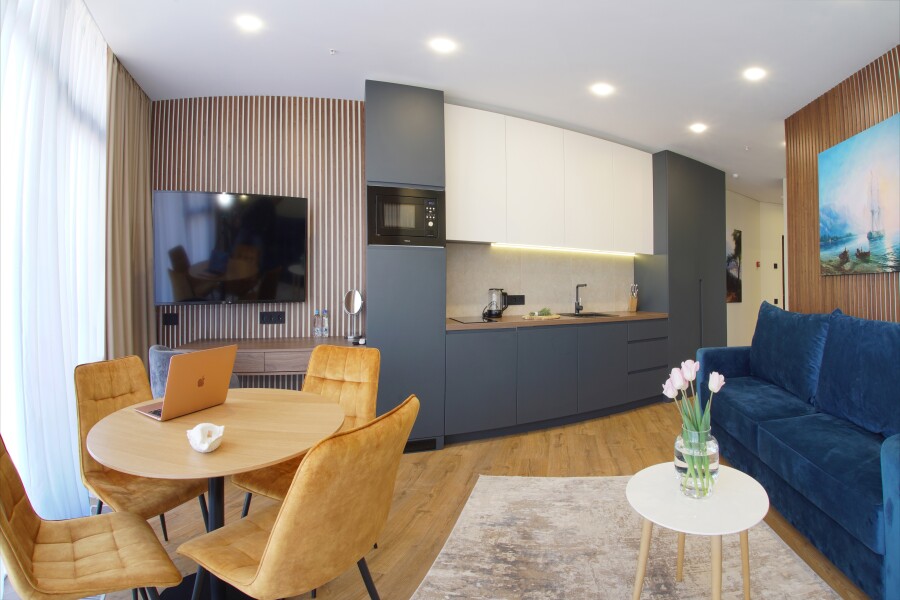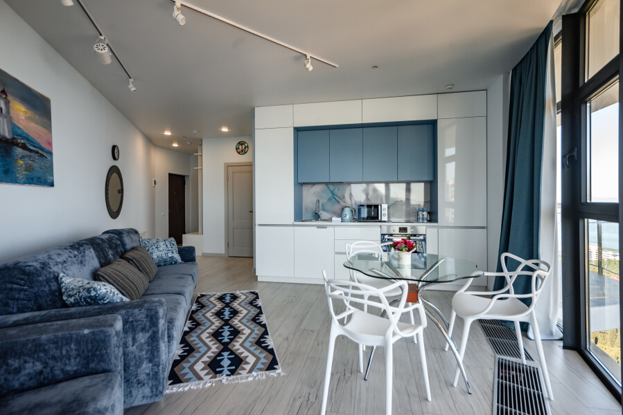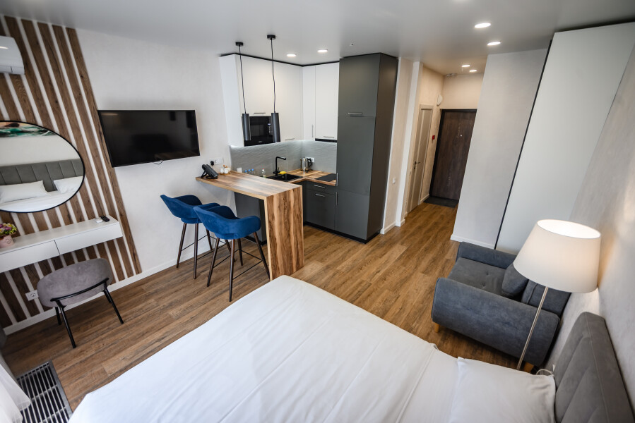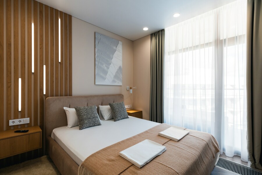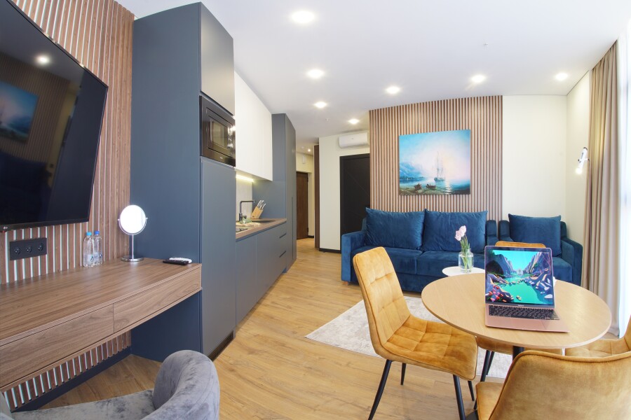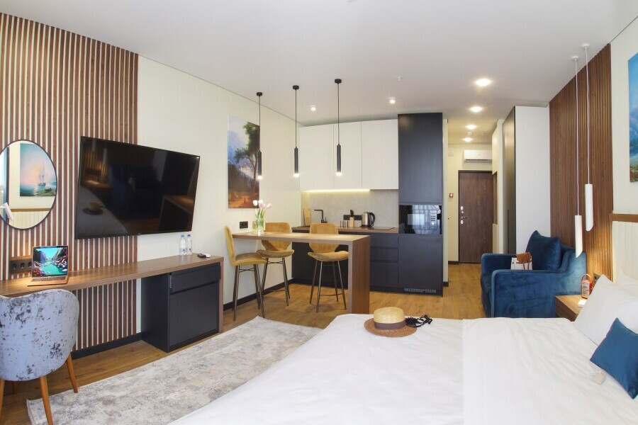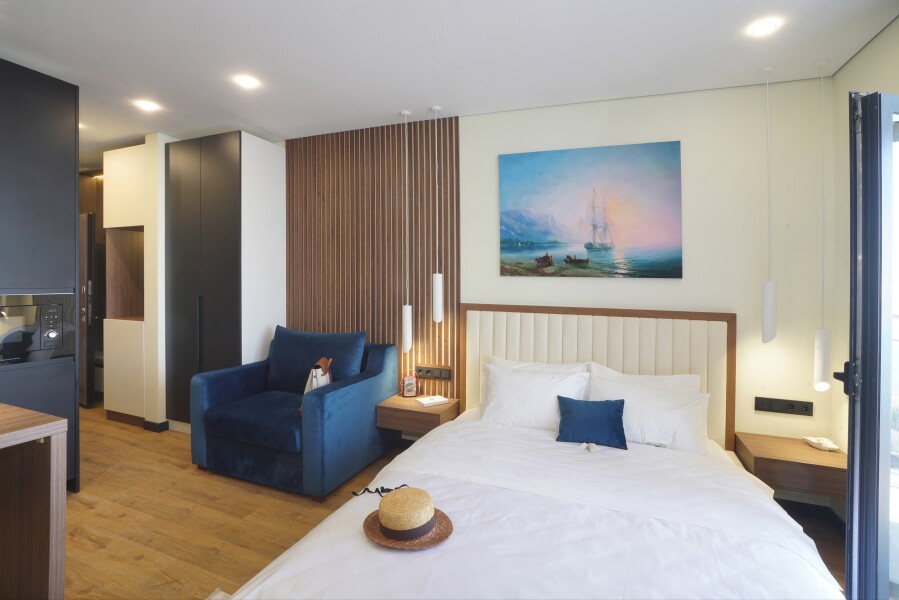 Апарт-отель "Крымская Резиденция" удобно расположился в престижном районе Алушты – Профессорском уголке. Эта местность славится приятным климатом, просторными пляжами и умиротворенной обстановкой. Здесь также выгодно сочетаются расположение и транспортная развязка: неподалеку есть кафе, магазины первой необходимости, музей Ивана Шмелева, живописная Миндалевая роща, до центра города можно добраться за пять минут, а до основных достопримечательностей Южного берега Крыма – до дворцов Воронцова и Ливадии, знаменитого «Ласточкиного гнезда», Массандровского парка и Никитского ботанического сада – всего за час езды. Отель занимает современное здание, являющееся частью элитного апарт-комплекса "Крымская Резиденция". Гостям предлагаются элегантные и уютные апартаменты, каждый из которых имеет собственную террасу с захватывающими видами на горы, море и зелень окрестностей. В каждой квартире есть мини-кухня, оснащенная холодильником, чайником, микроволновой печью и посудой, ванная комната с душевой кабиной, стиральной машиной, феном, а также предоставлены косметические принадлежности. Для комфортного отдыха предусмотрена зона для барбекю и подземный паркинг.
