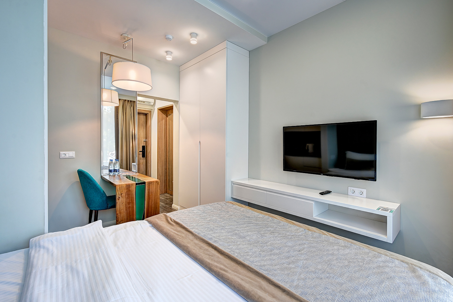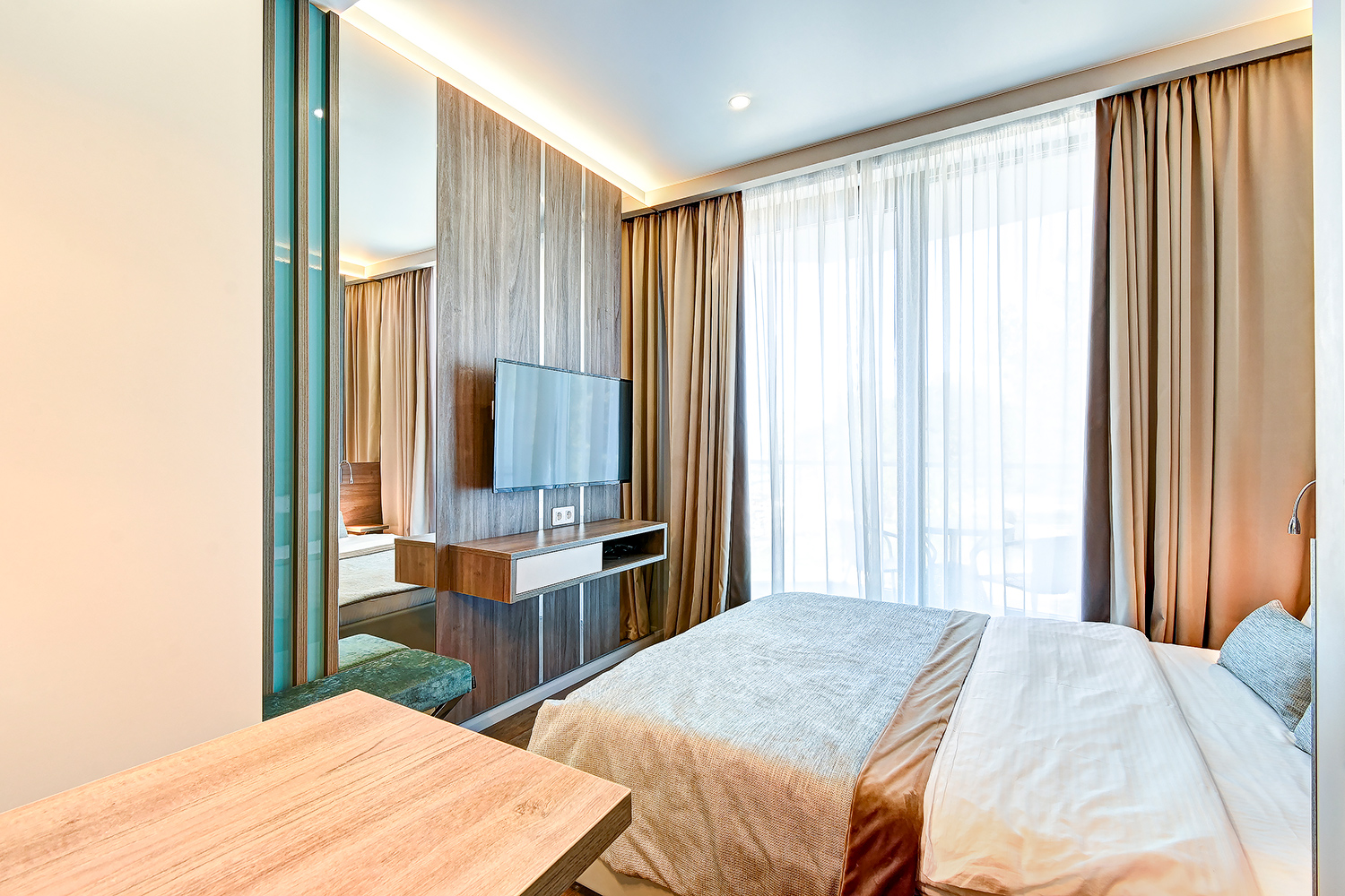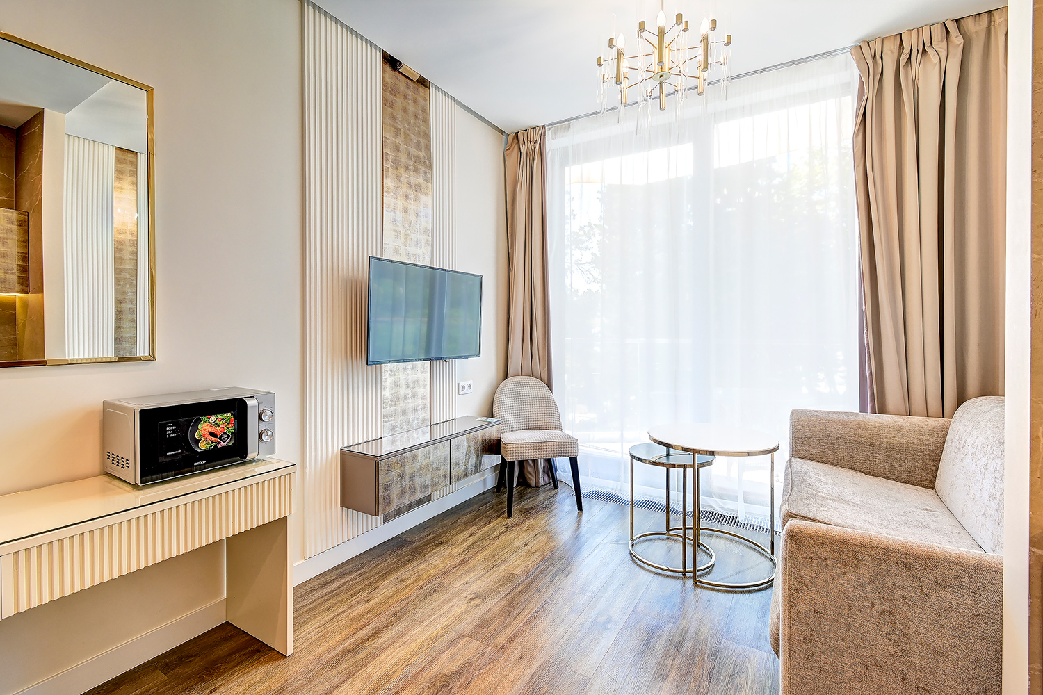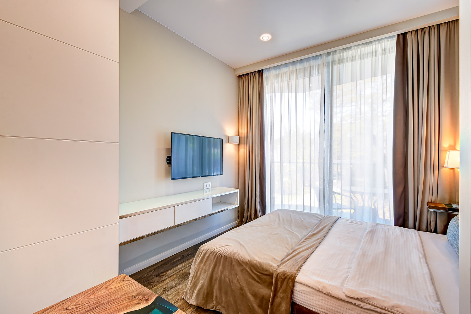 - В номере: душ, ванна, туалет, ТВ, кондиционер, мини-кухня, электрочайник, СВЧ-печь, двуспальная кровать, диван, балкон