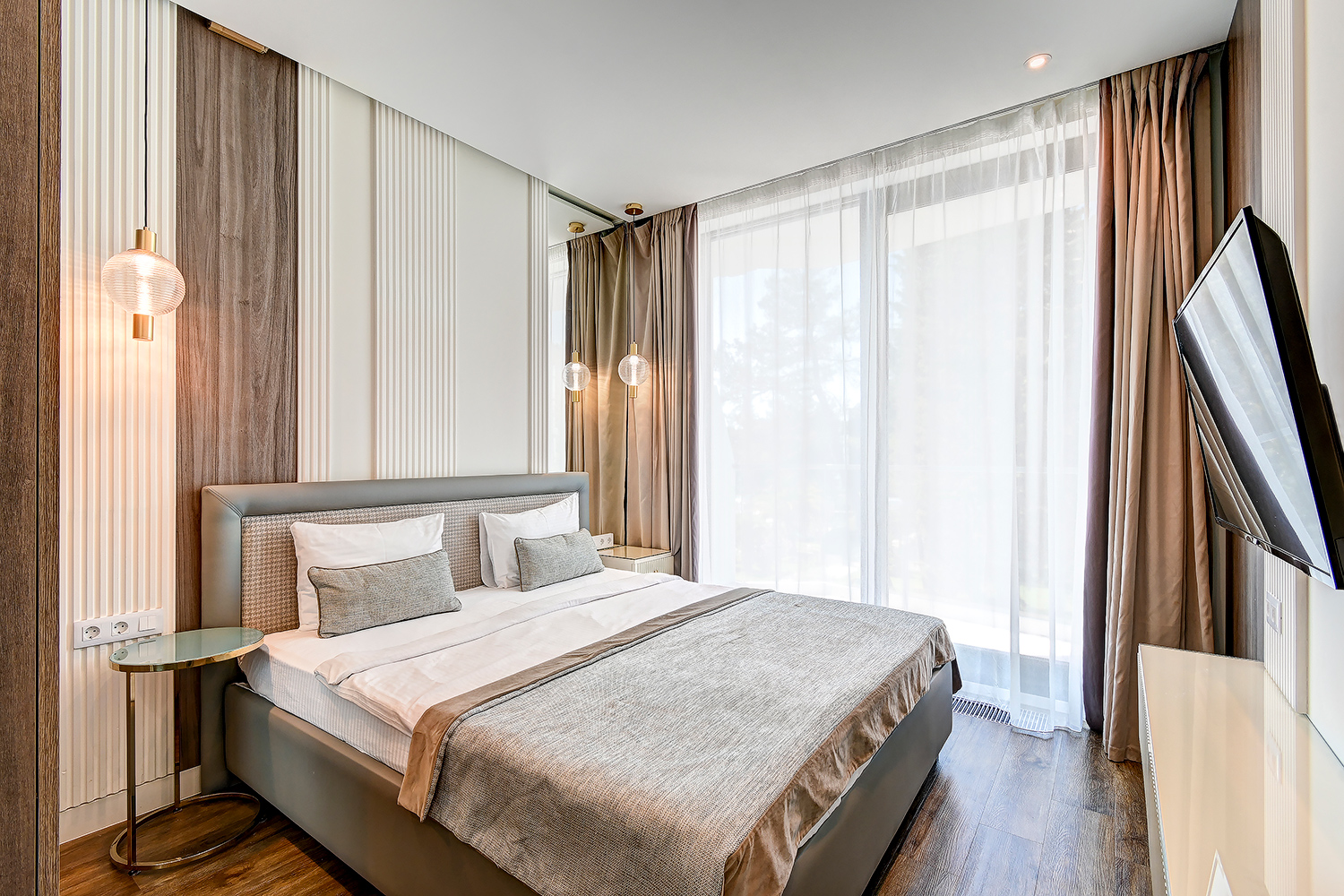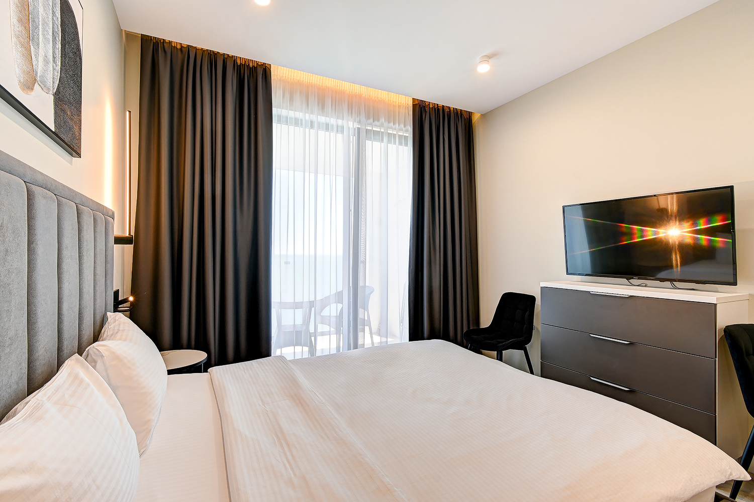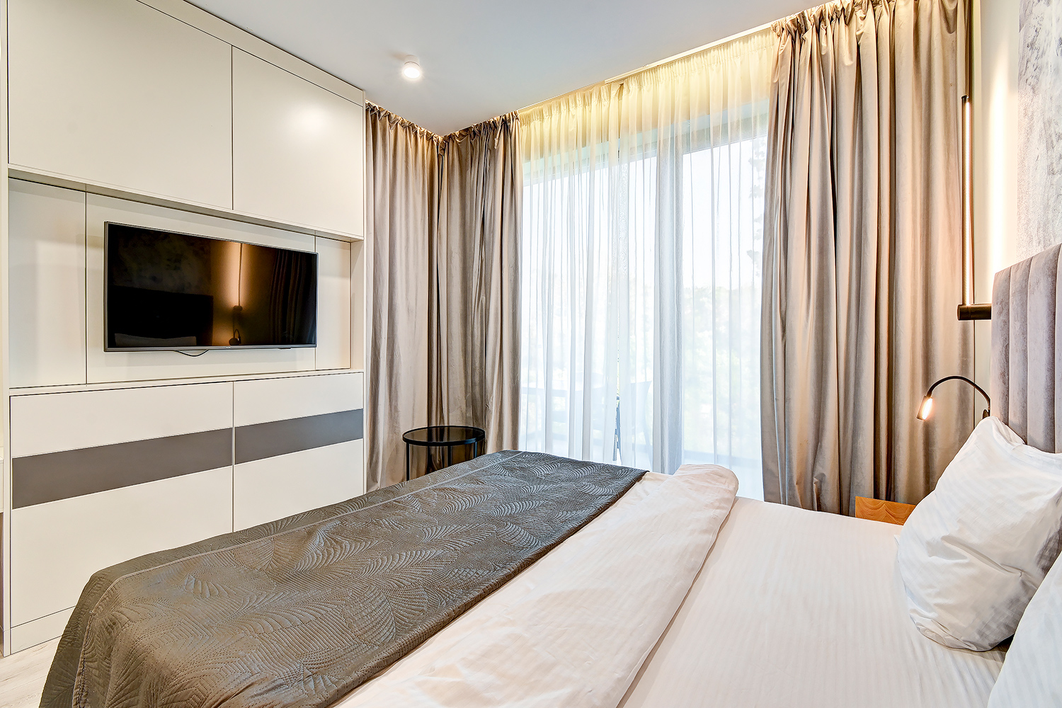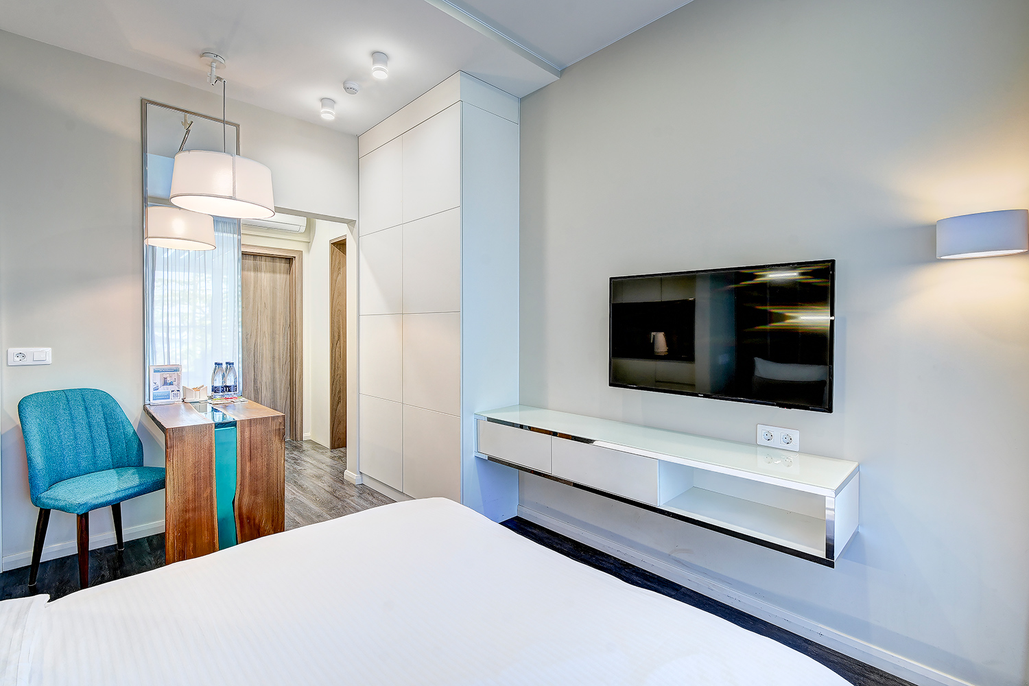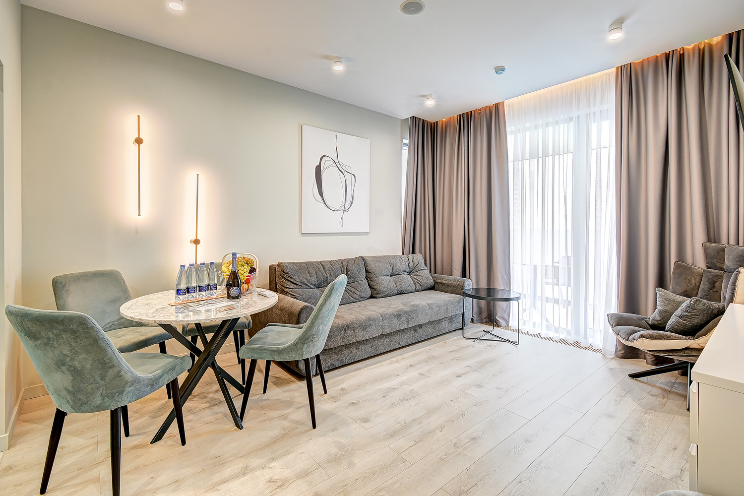 - В номере: душ, ванна, туалет, ТВ, кондиционер, мини-кухня, электрочайник, СВЧ-печь, двуспальная кровать, диван, балкон
