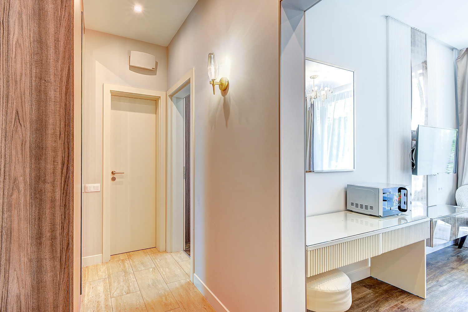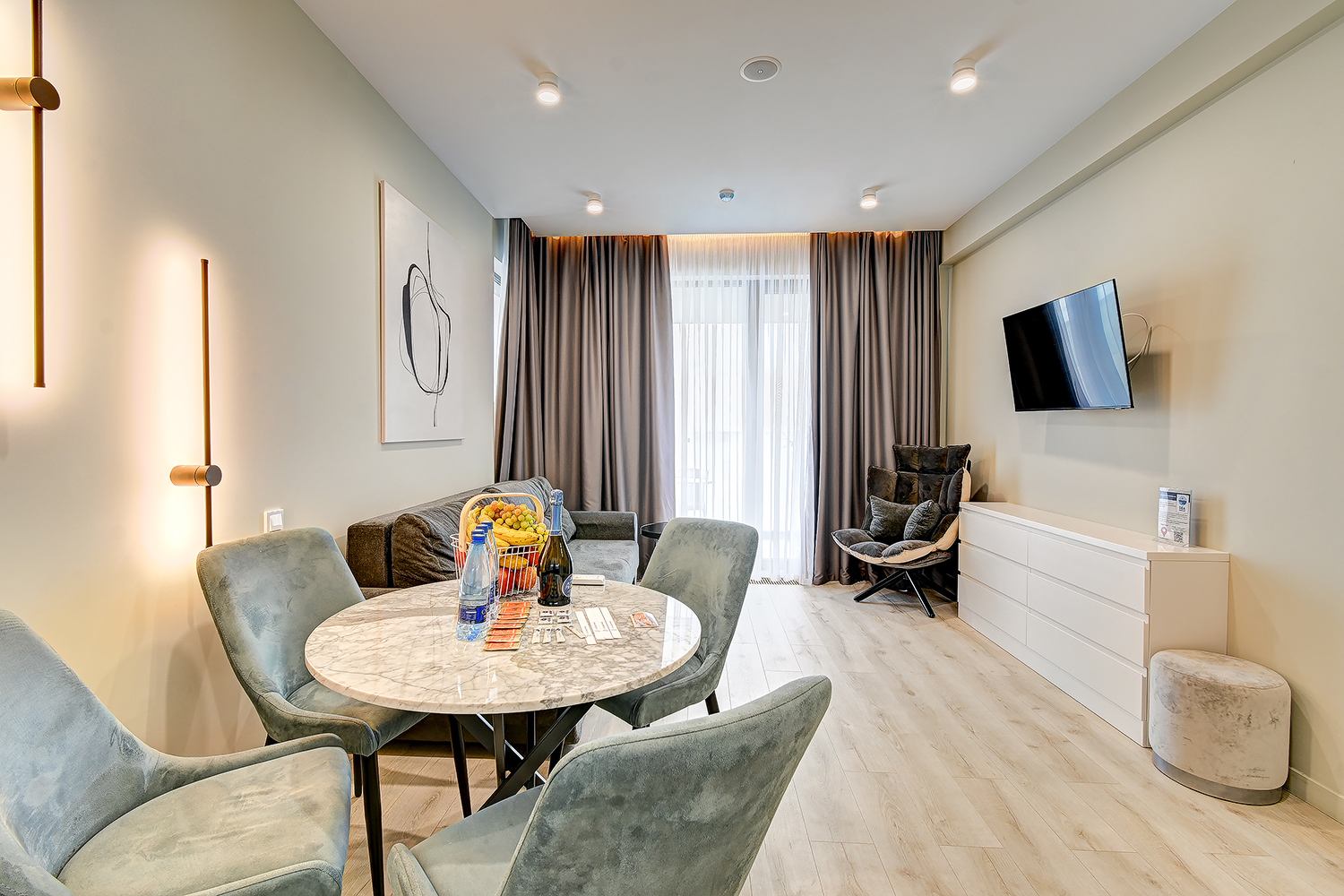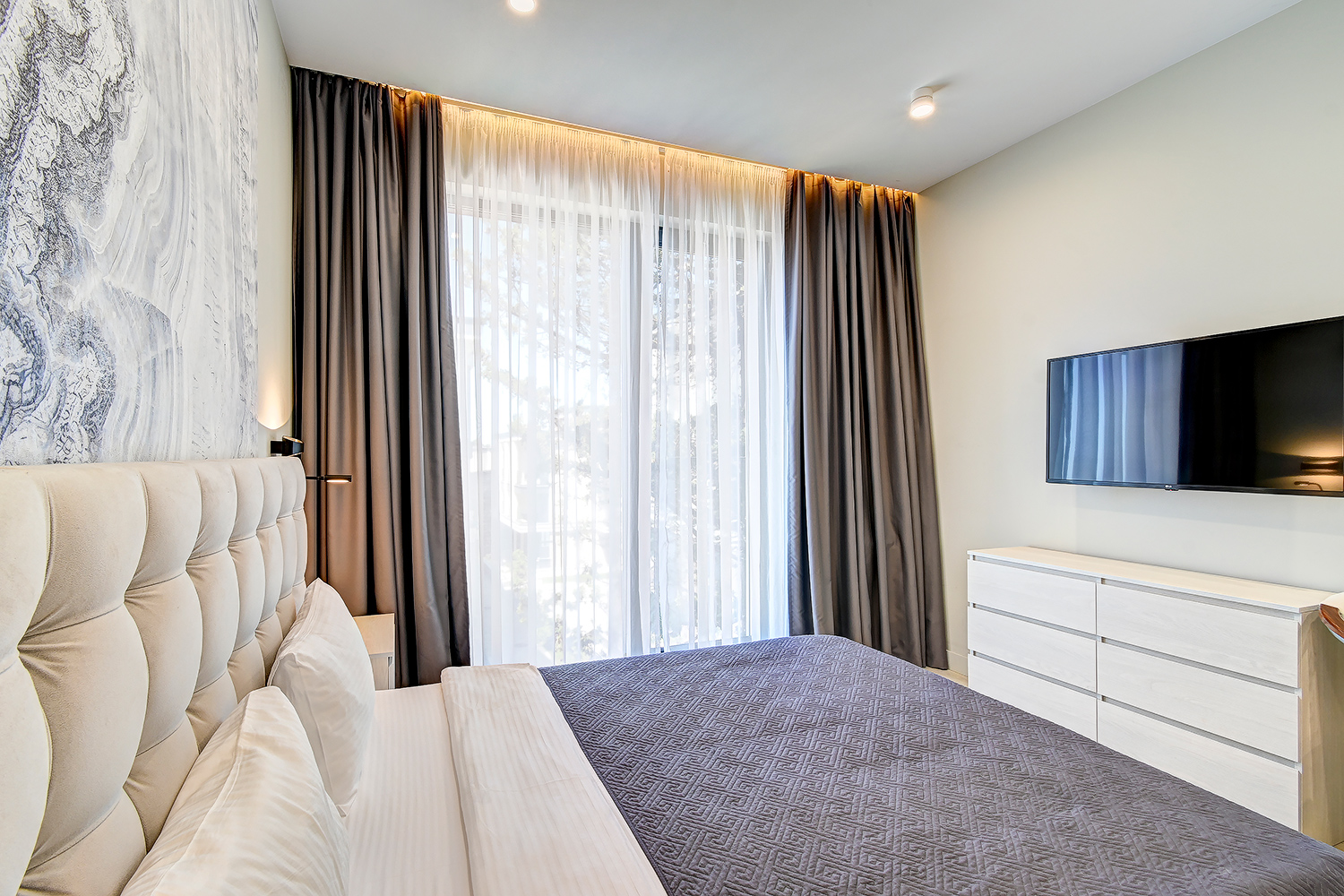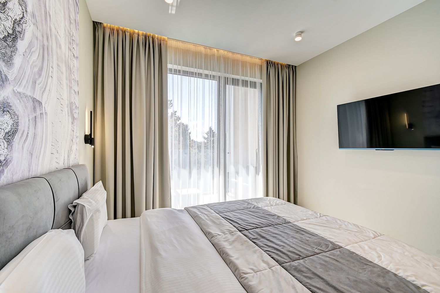 - В номере: душ, ванна, туалет, ТВ, кондиционер, мини-кухня, электрочайник, СВЧ-печь, двуспальная кровать, диван, балкон