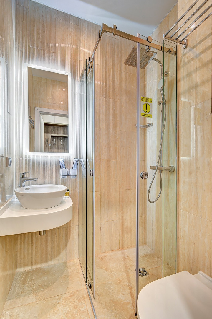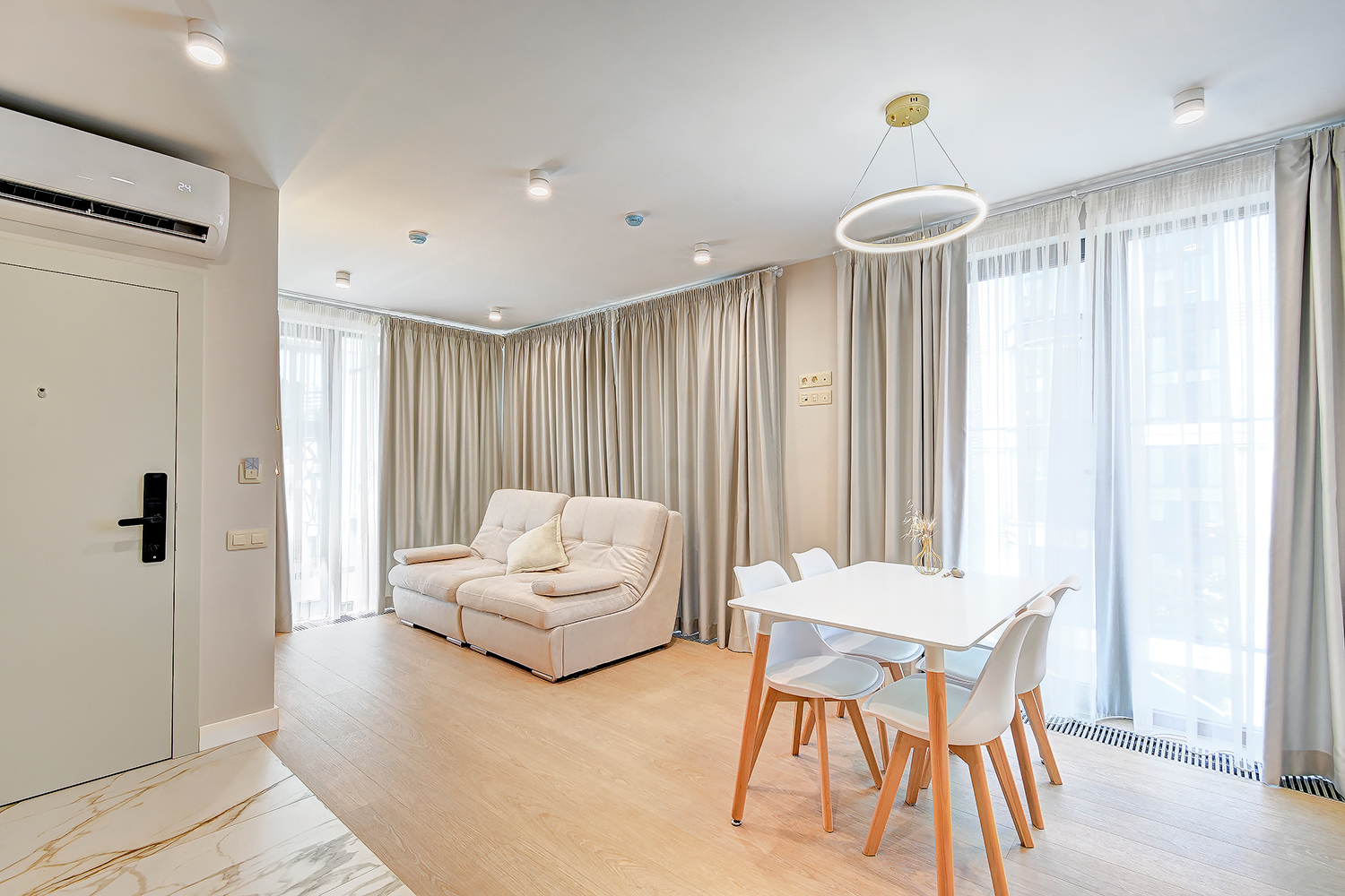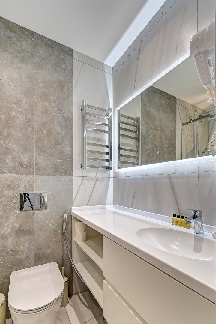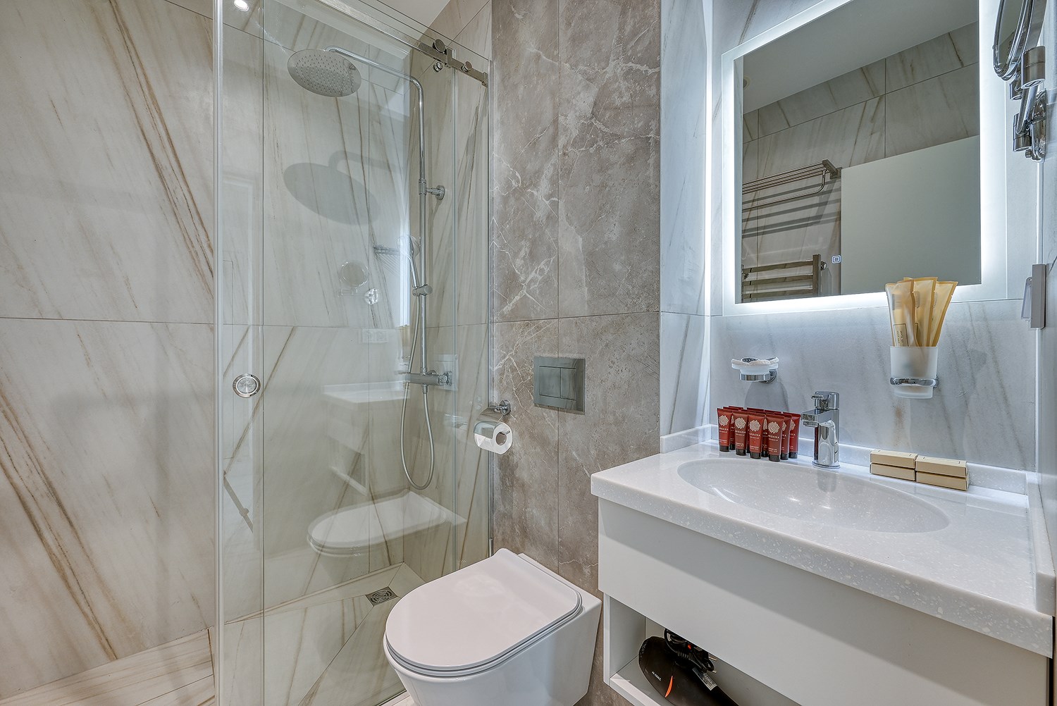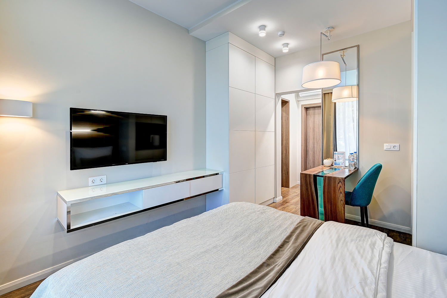 - В номере: душ, ванна, туалет, ТВ, кондиционер, мини-кухня, электрочайник, СВЧ-печь, двуспальная кровать, диван, балкон