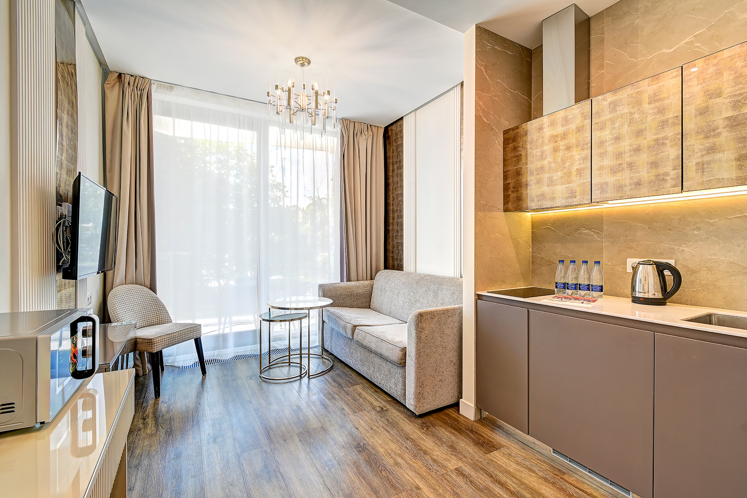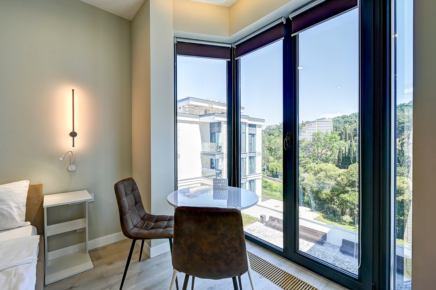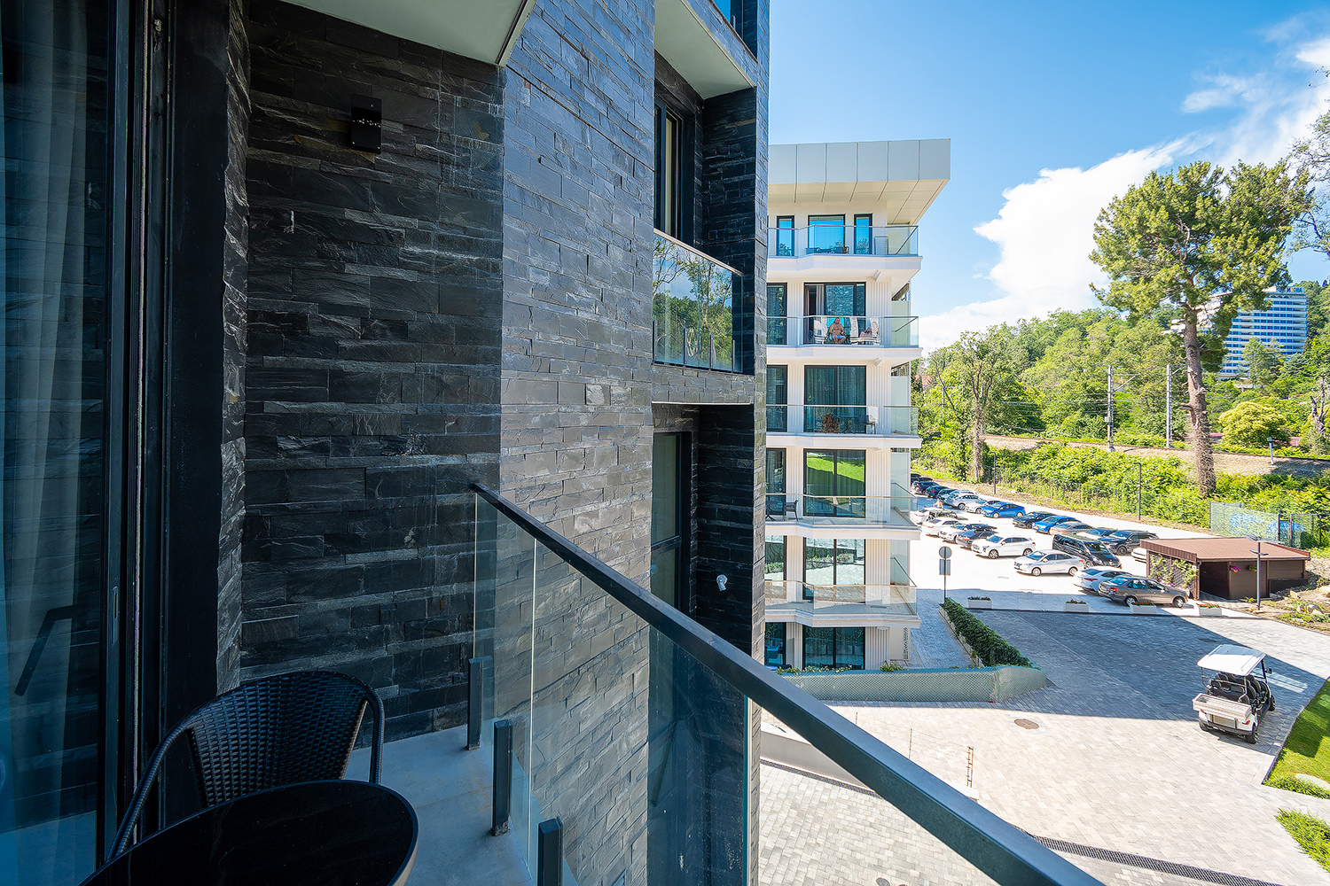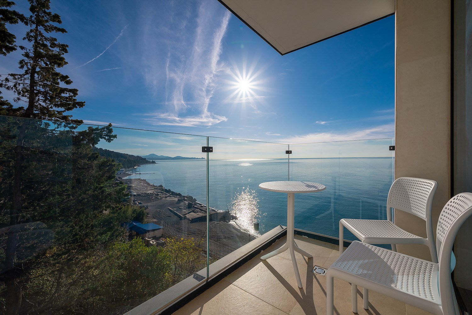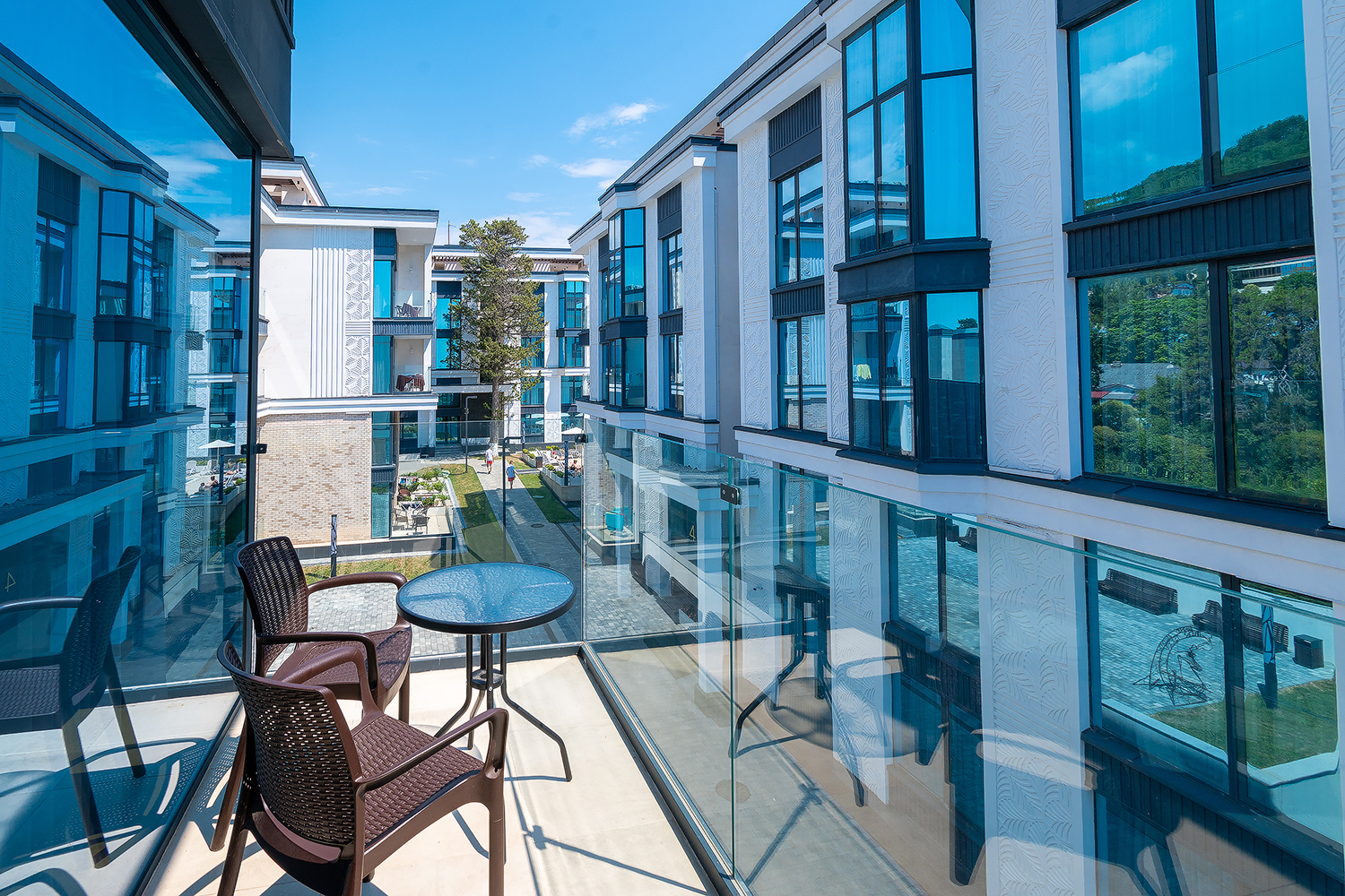 - В номере: душ, туалет, ТВ, кондиционер, мини-кухня, электрочайник, СВЧ-печь, двуспальная кровать, диван, кресло, балкон