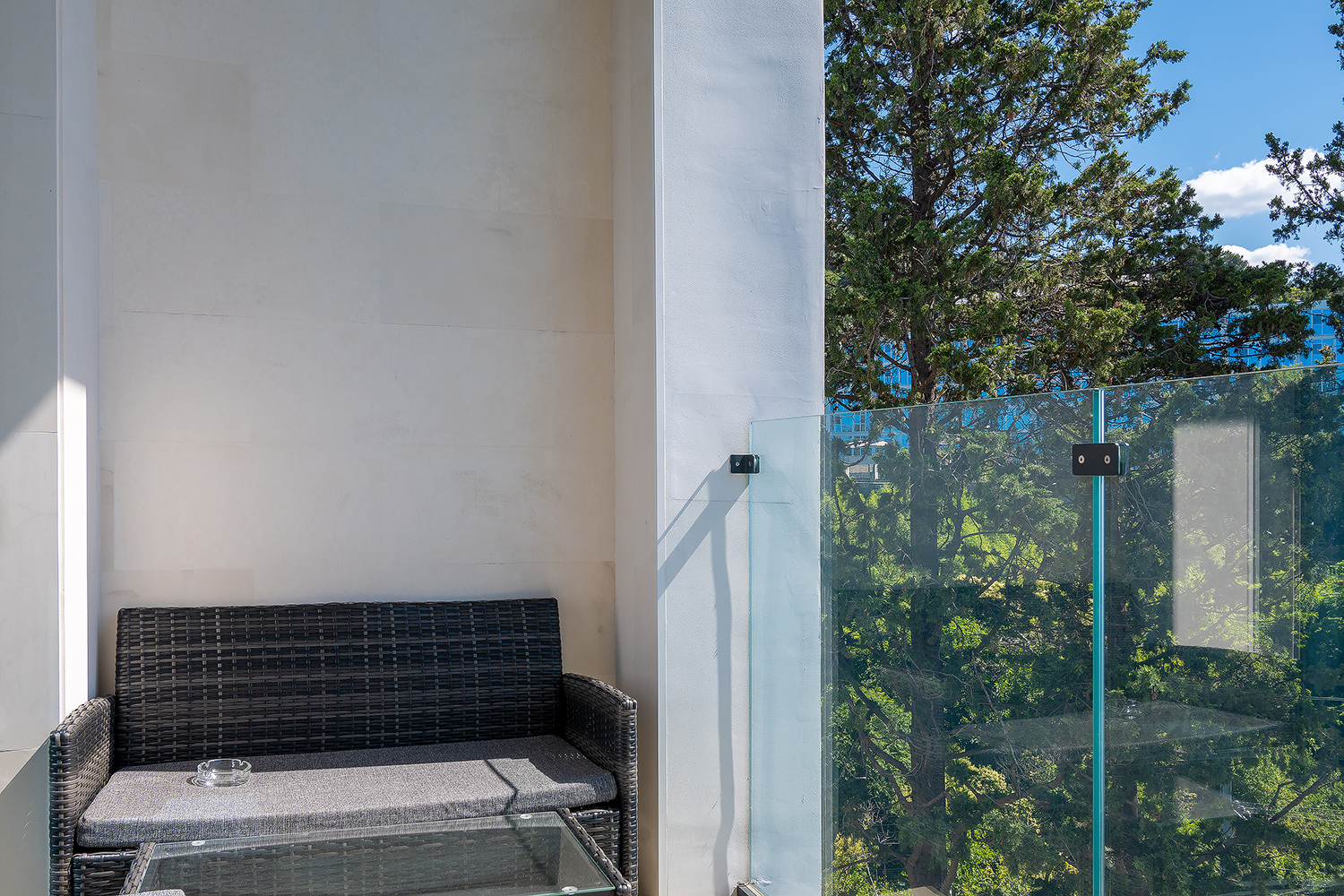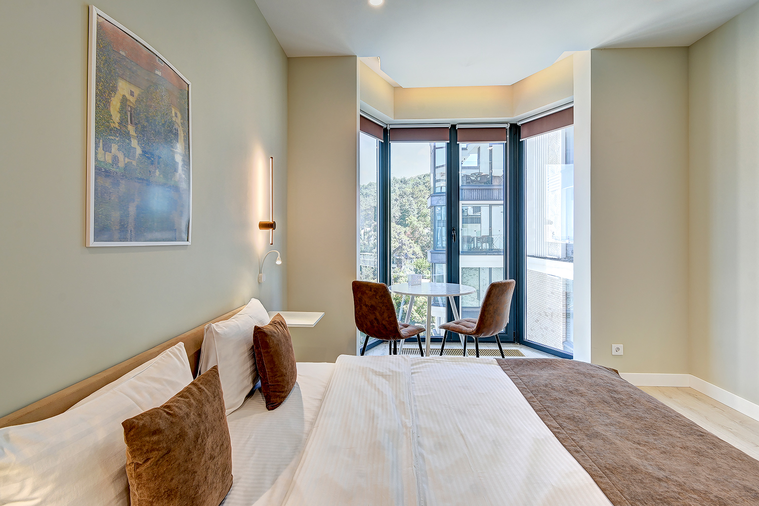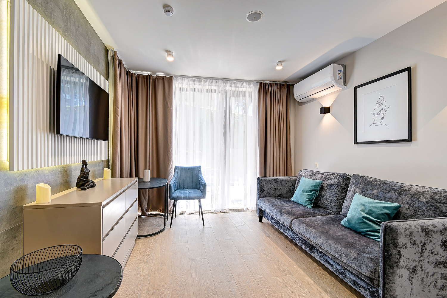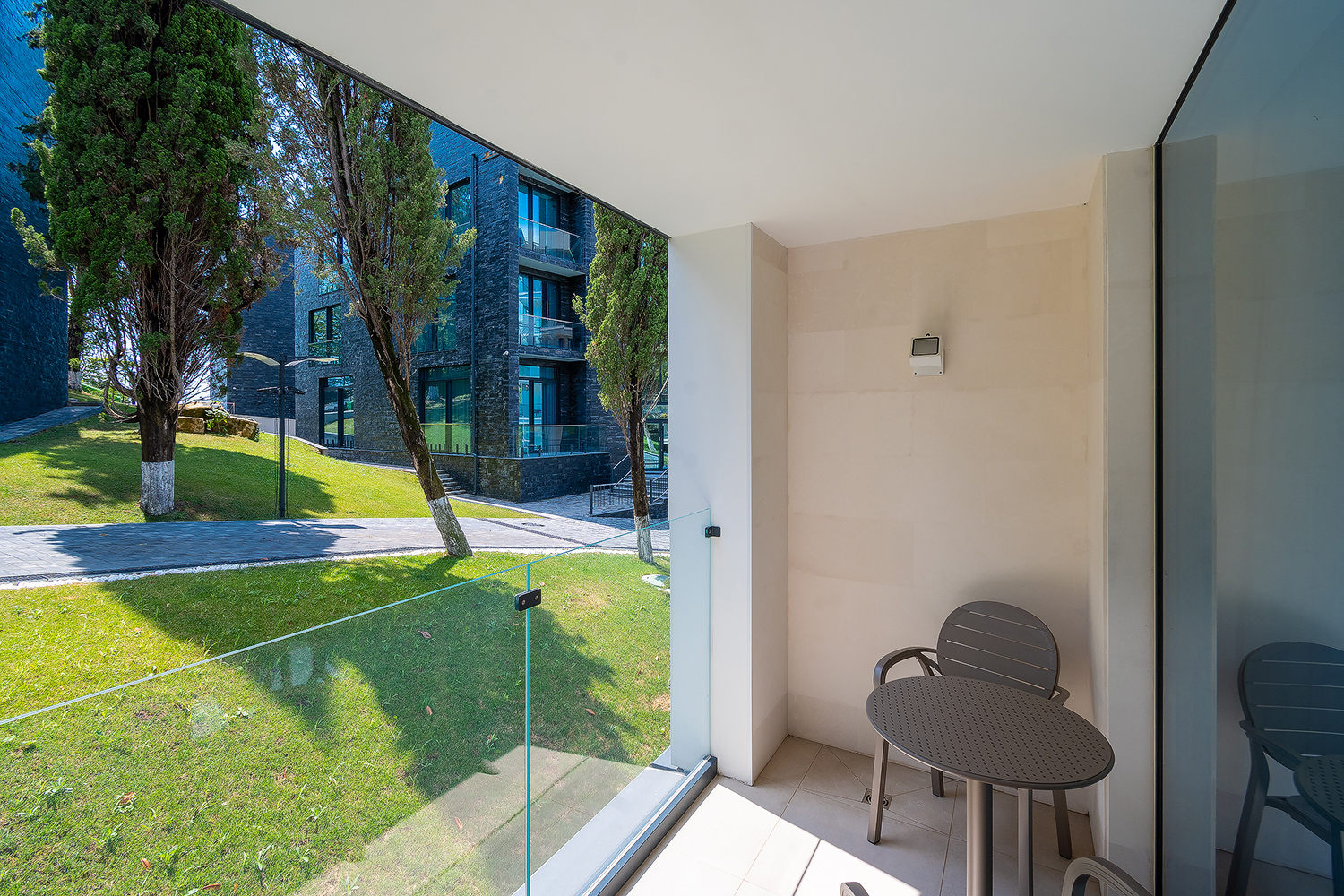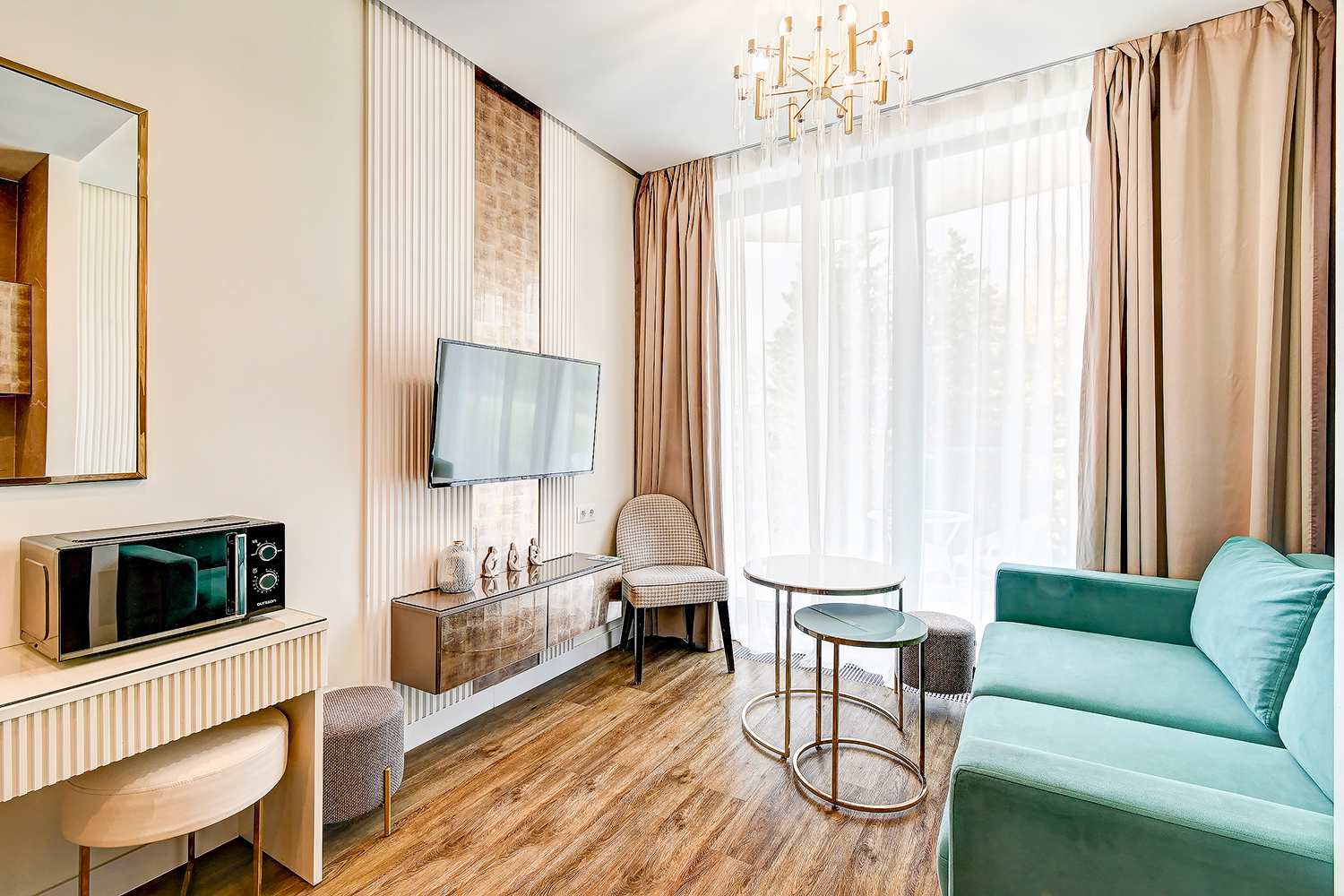 - В номере: душ, туалет, ТВ, кондиционер, мини-кухня, электрочайник, СВЧ-печь, двуспальная кровать, диван, кресло, балкон