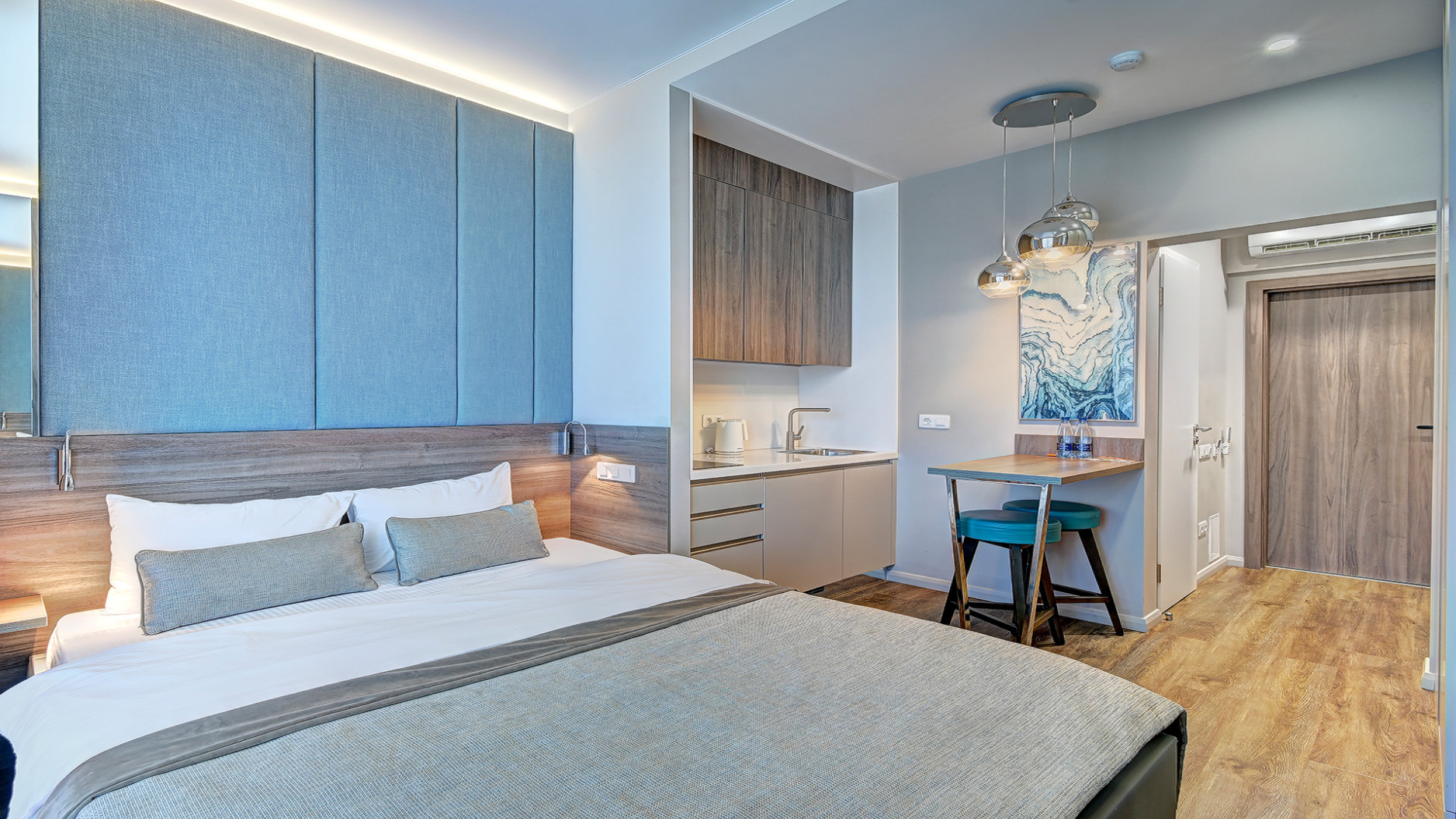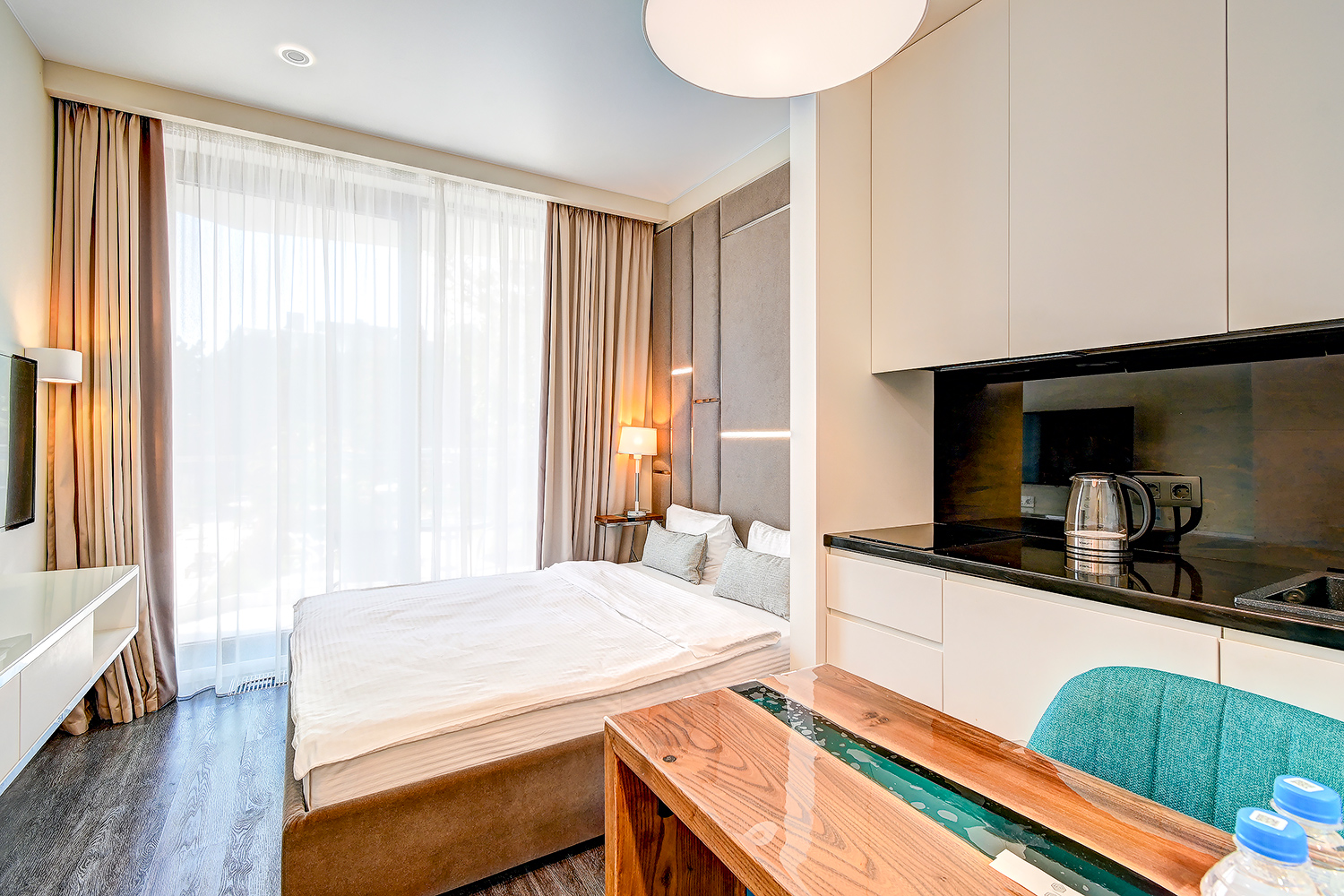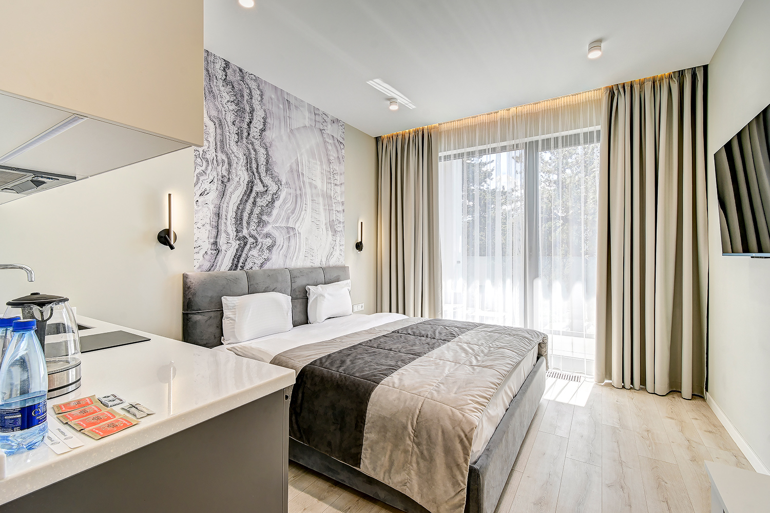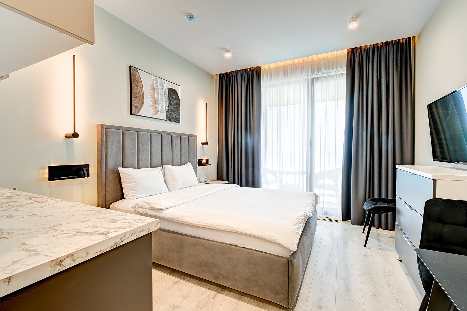 - В номере: душ, туалет, ТВ, кондиционер, мини-кухня, электрочайник, СВЧ-печь, двуспальная кровать, диван, балкон