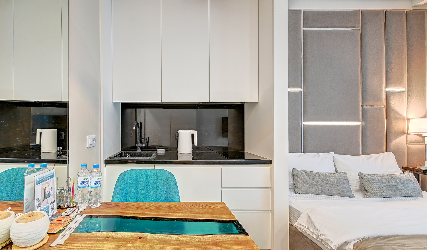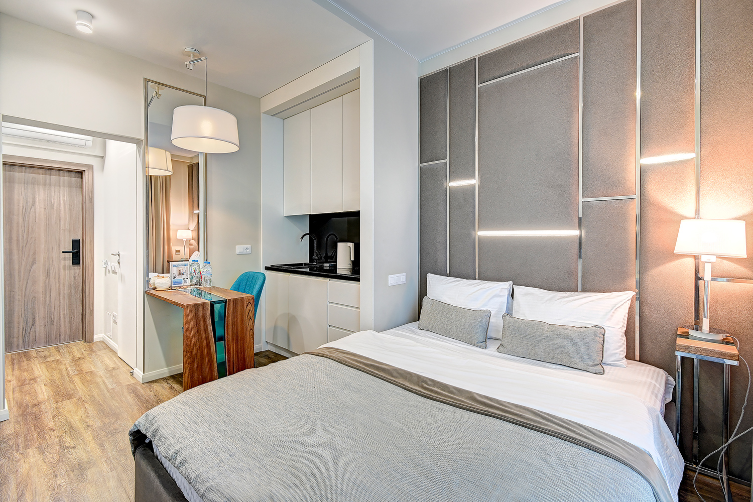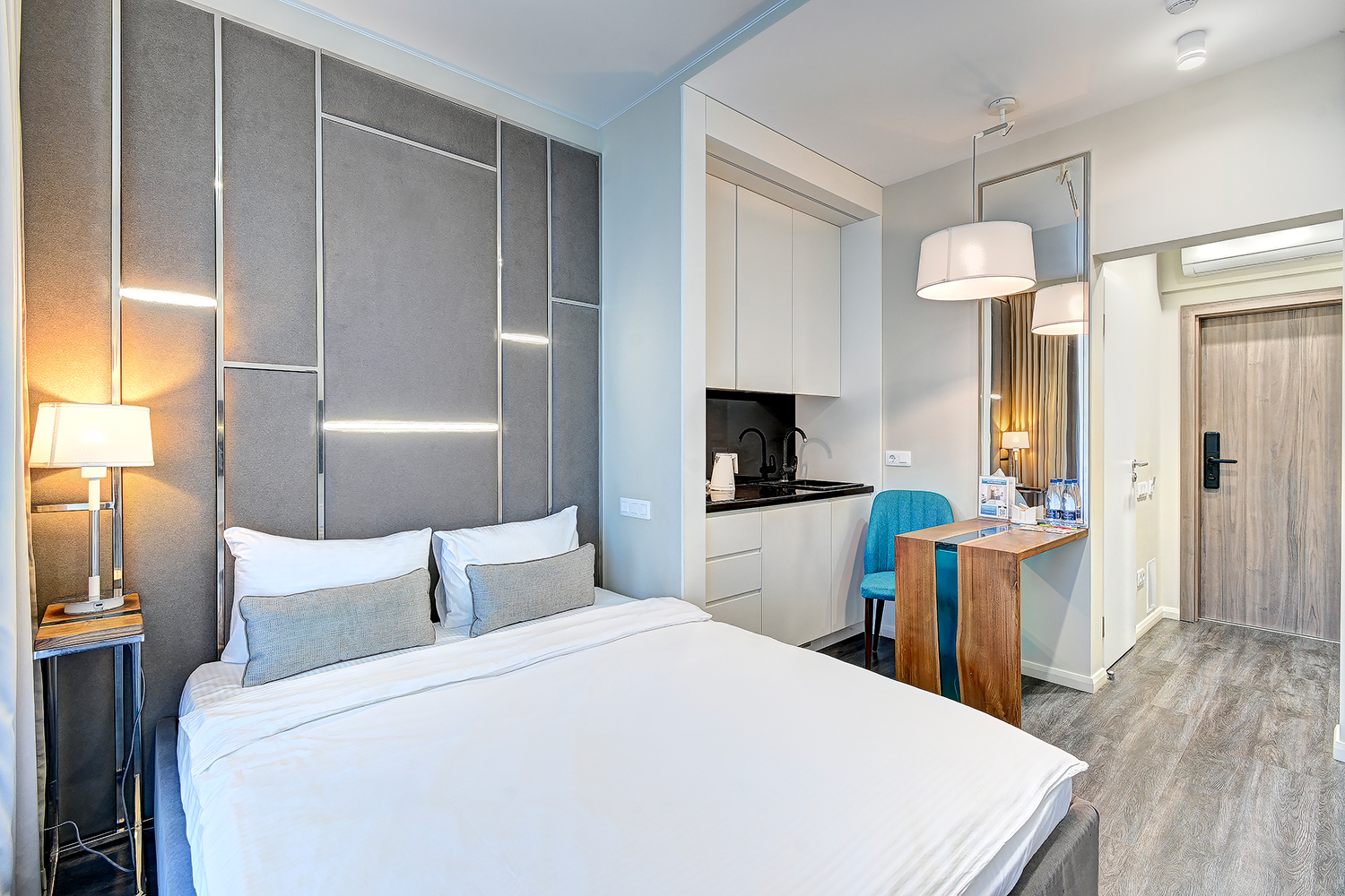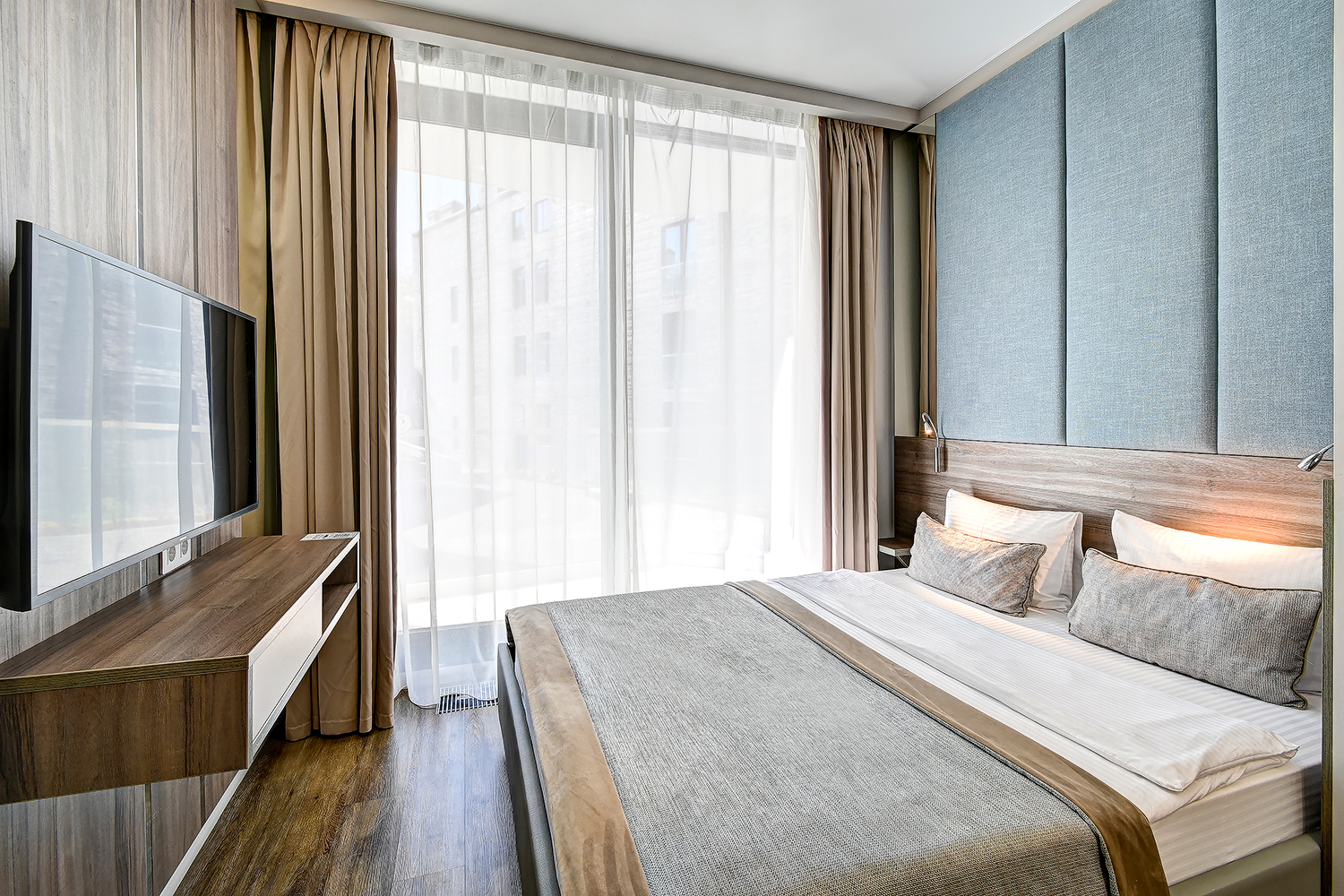 - В номере: душ, туалет, ТВ, кондиционер, мини-кухня, электрочайник, СВЧ-печь, двуспальная кровать, диван, балкон