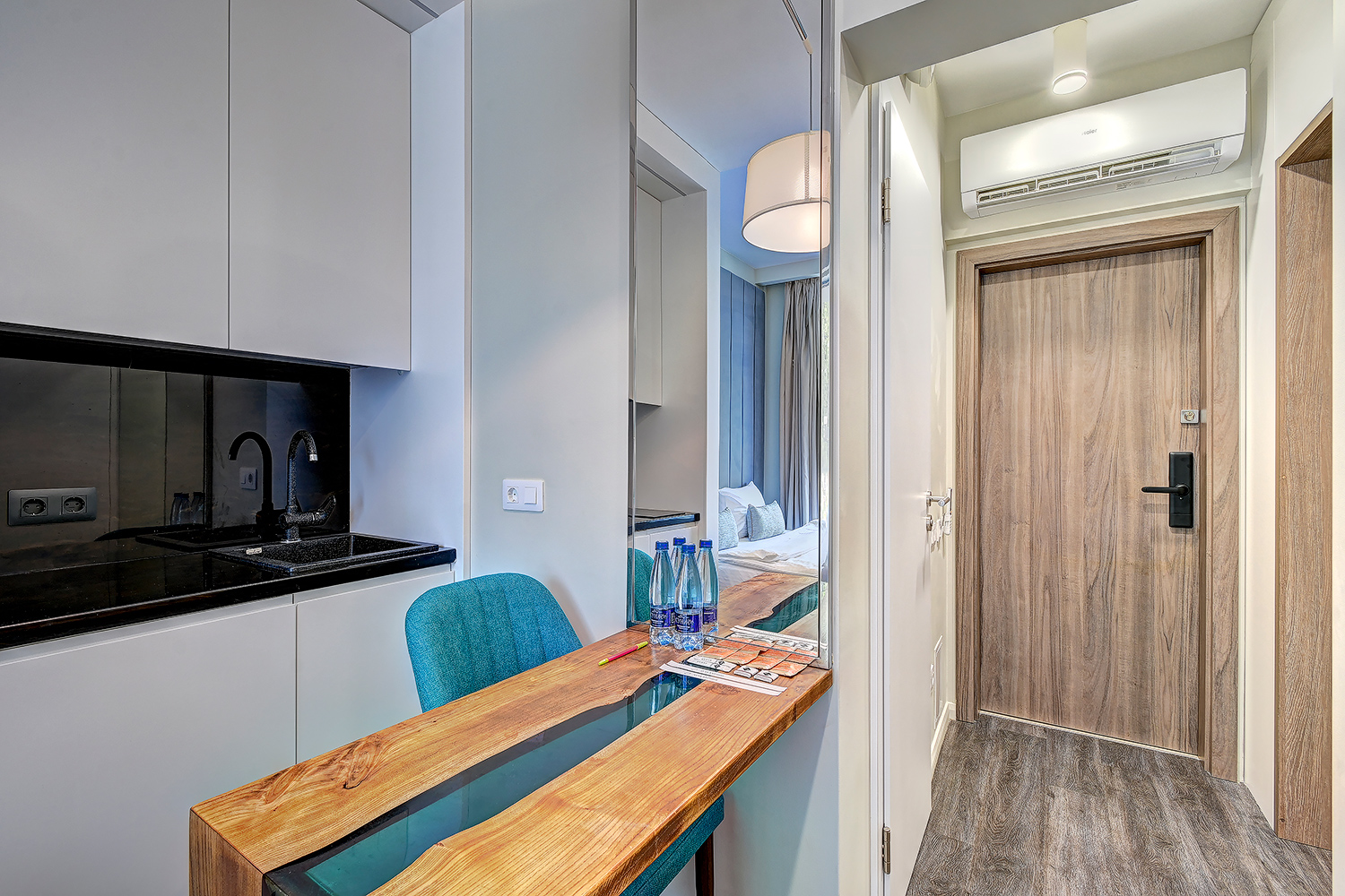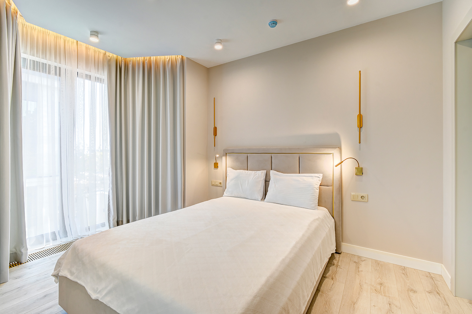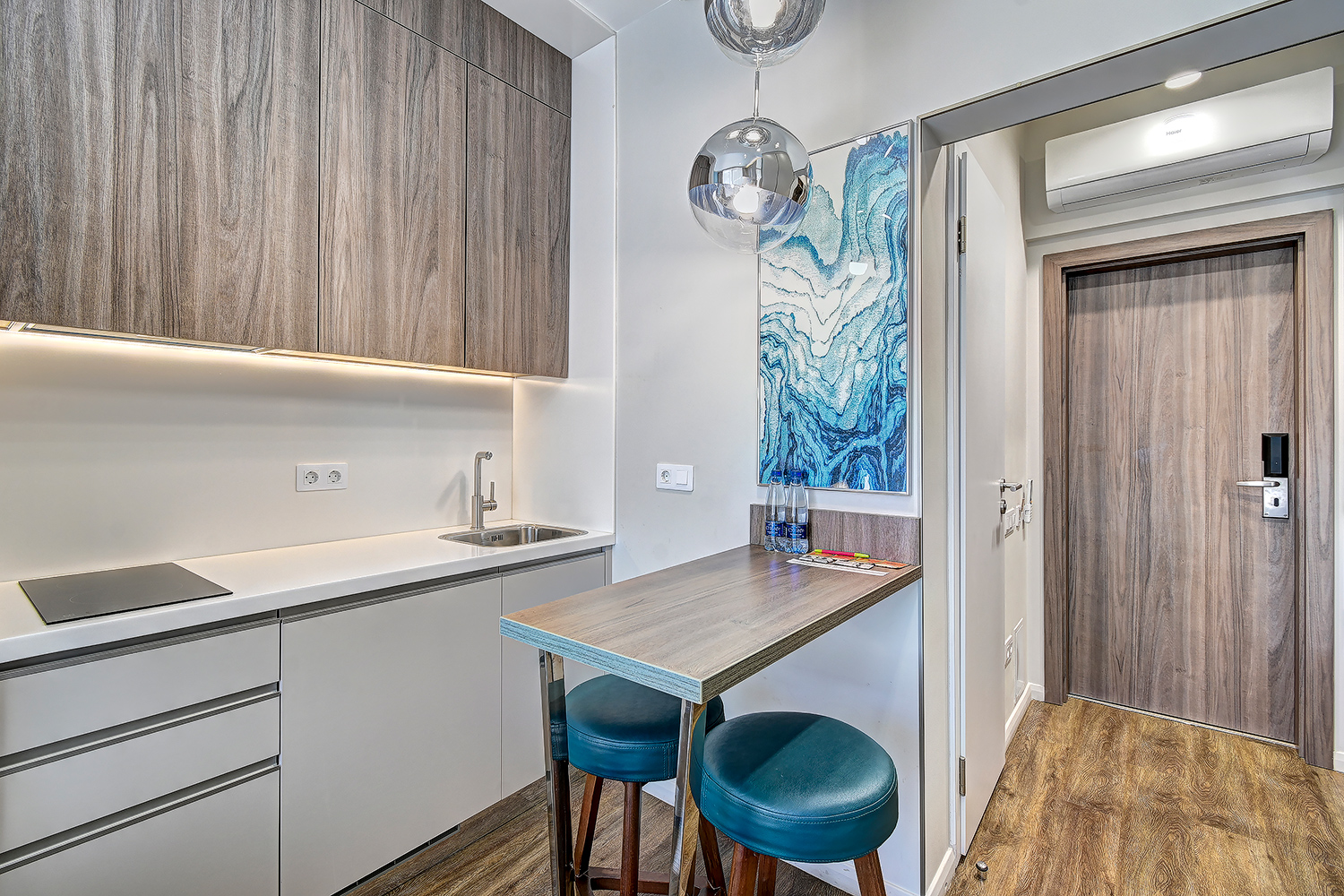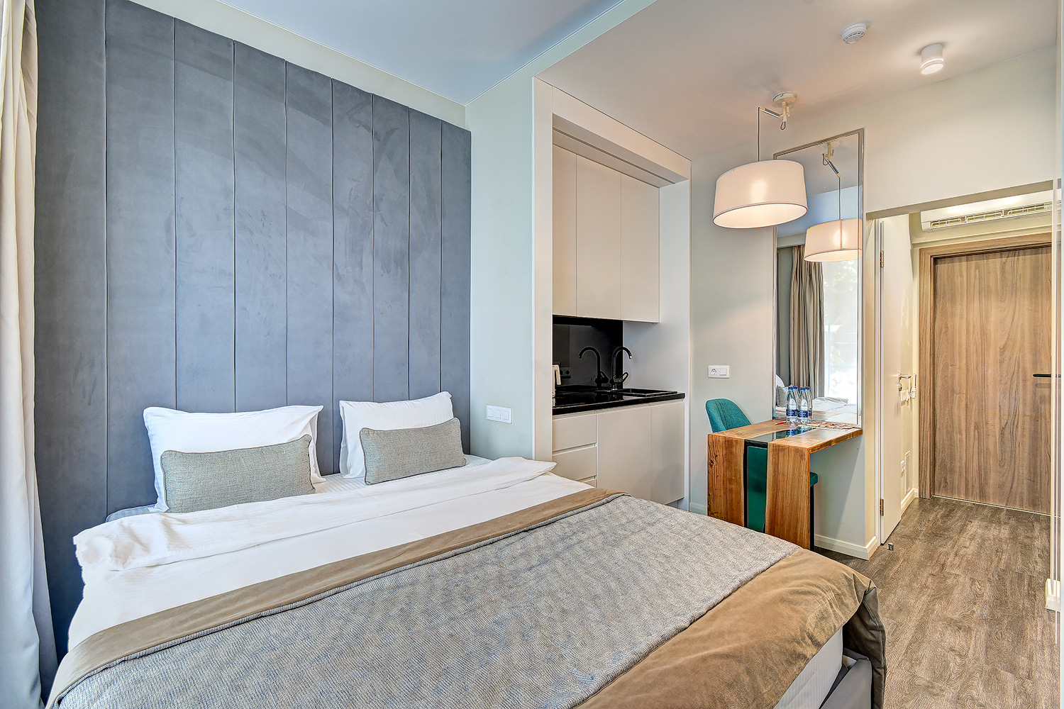 - В номере: душ, туалет, ТВ, кондиционер, мини-кухня, электрочайник, СВЧ-печь, двуспальная кровать, диван, балкон