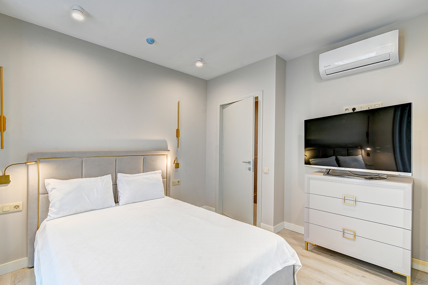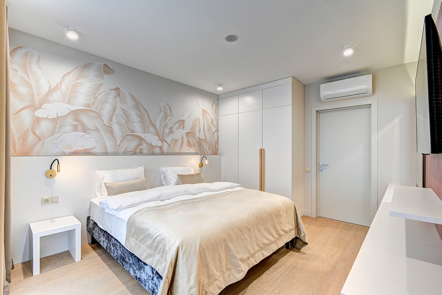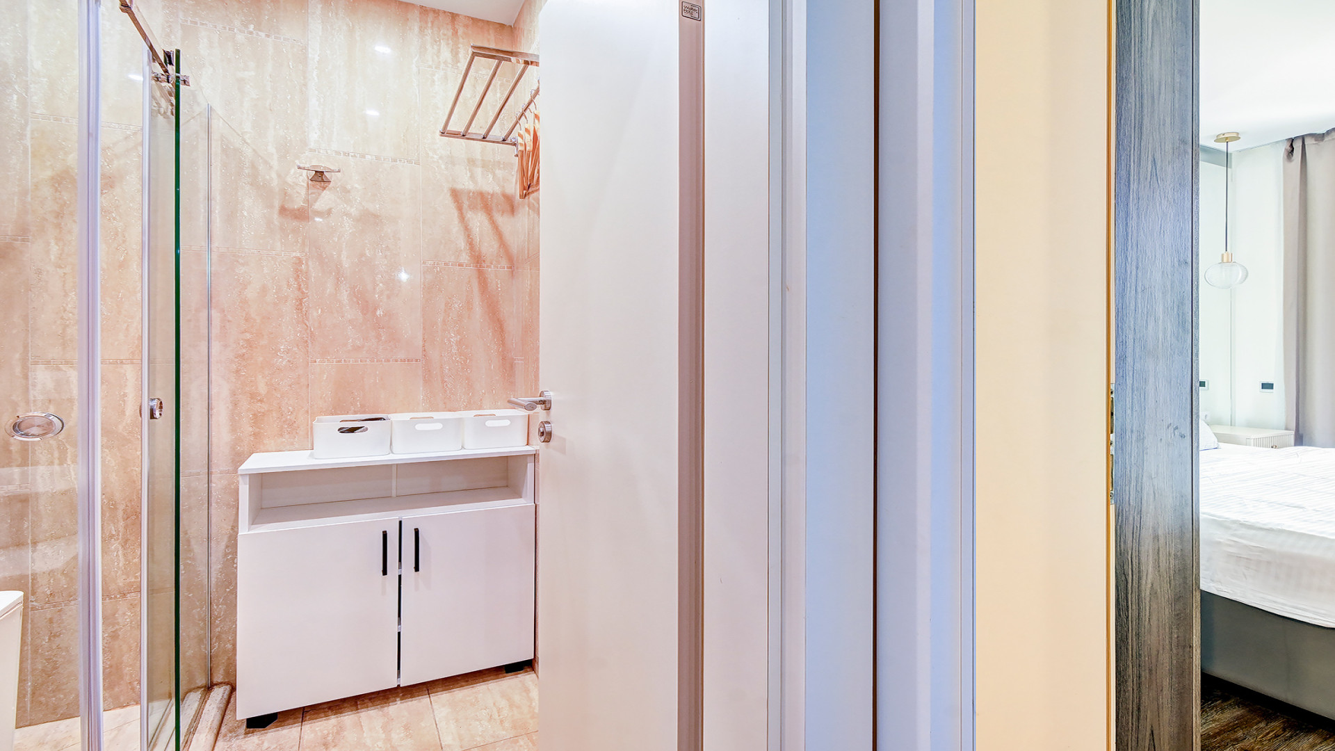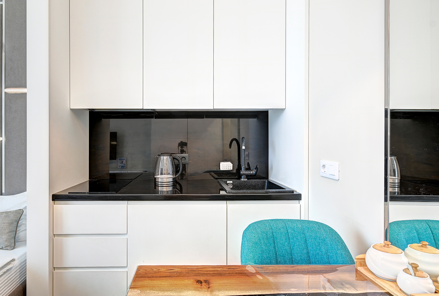 - В номере: душ, туалет, ТВ, кондиционер, мини-кухня, электрочайник, СВЧ-печь, двуспальная кровать, диван, балкон