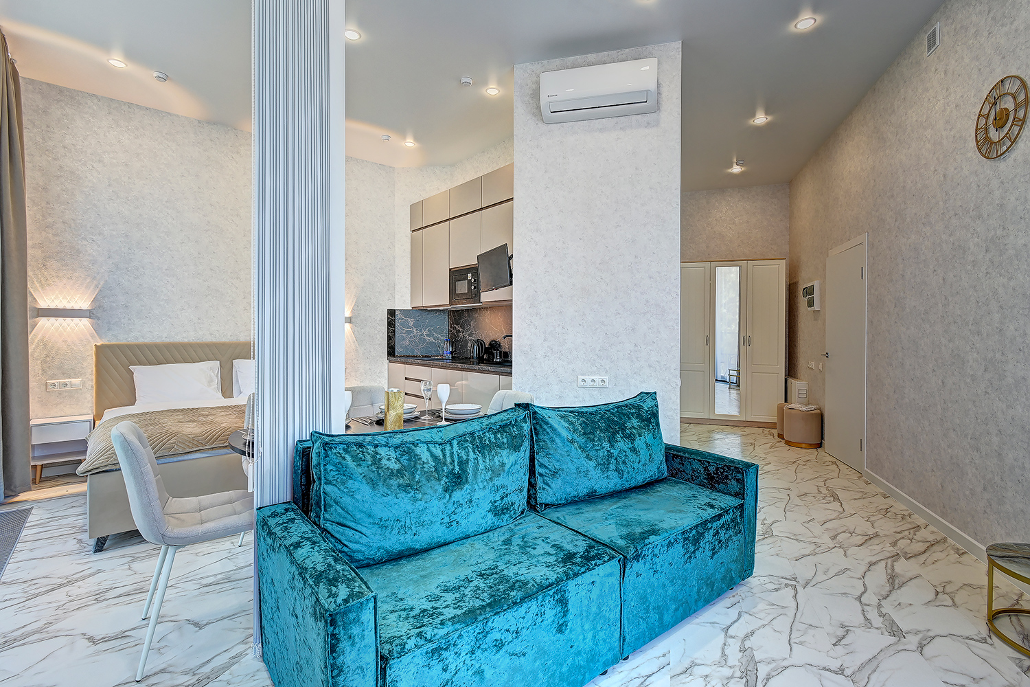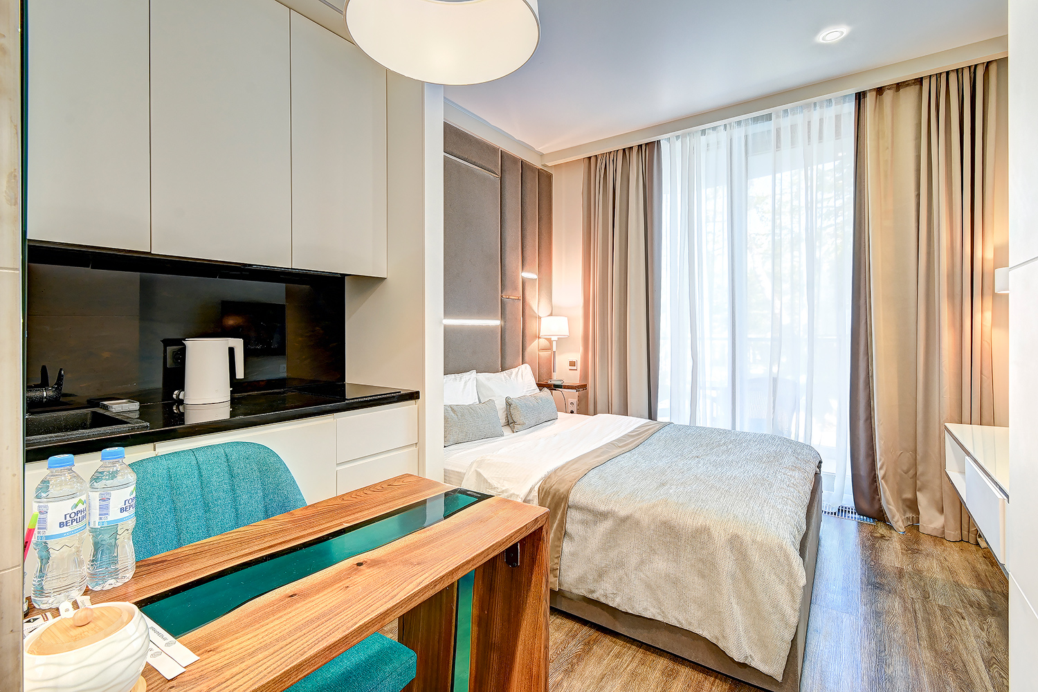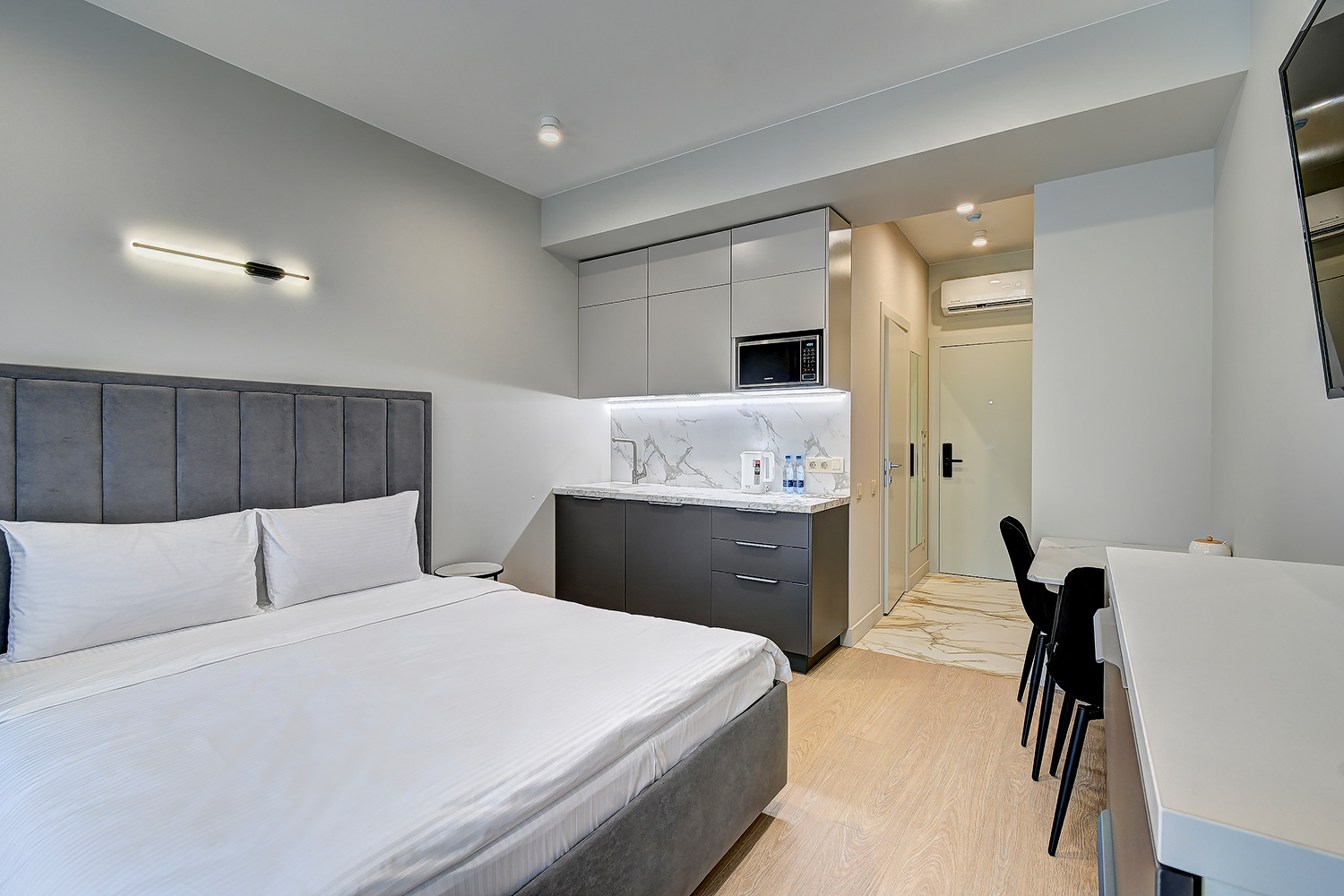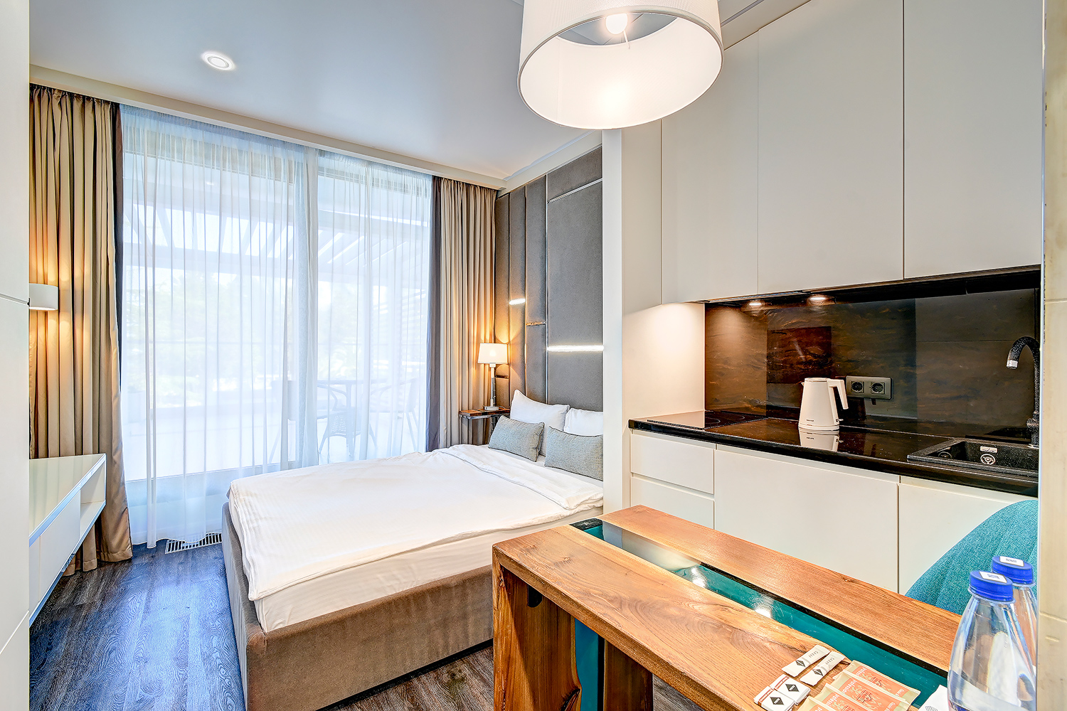 - В номере: душ, туалет, ТВ, кондиционер, мини-кухня, электрочайник, СВЧ-печь, двуспальная кровать, диван