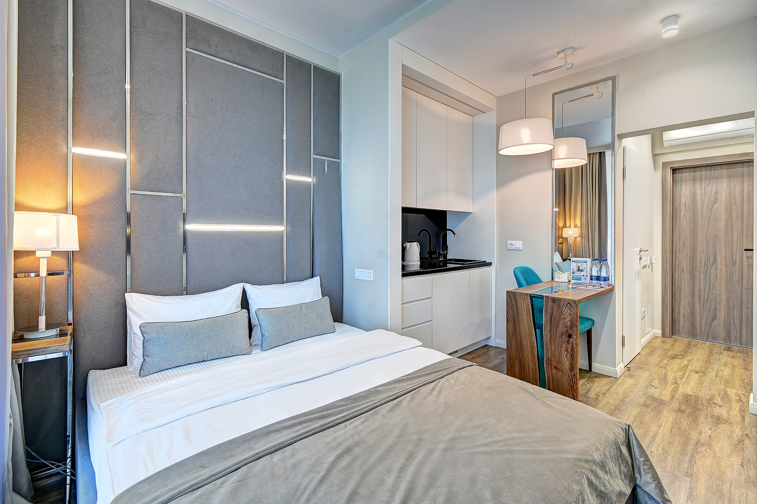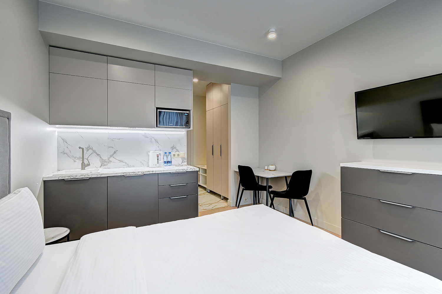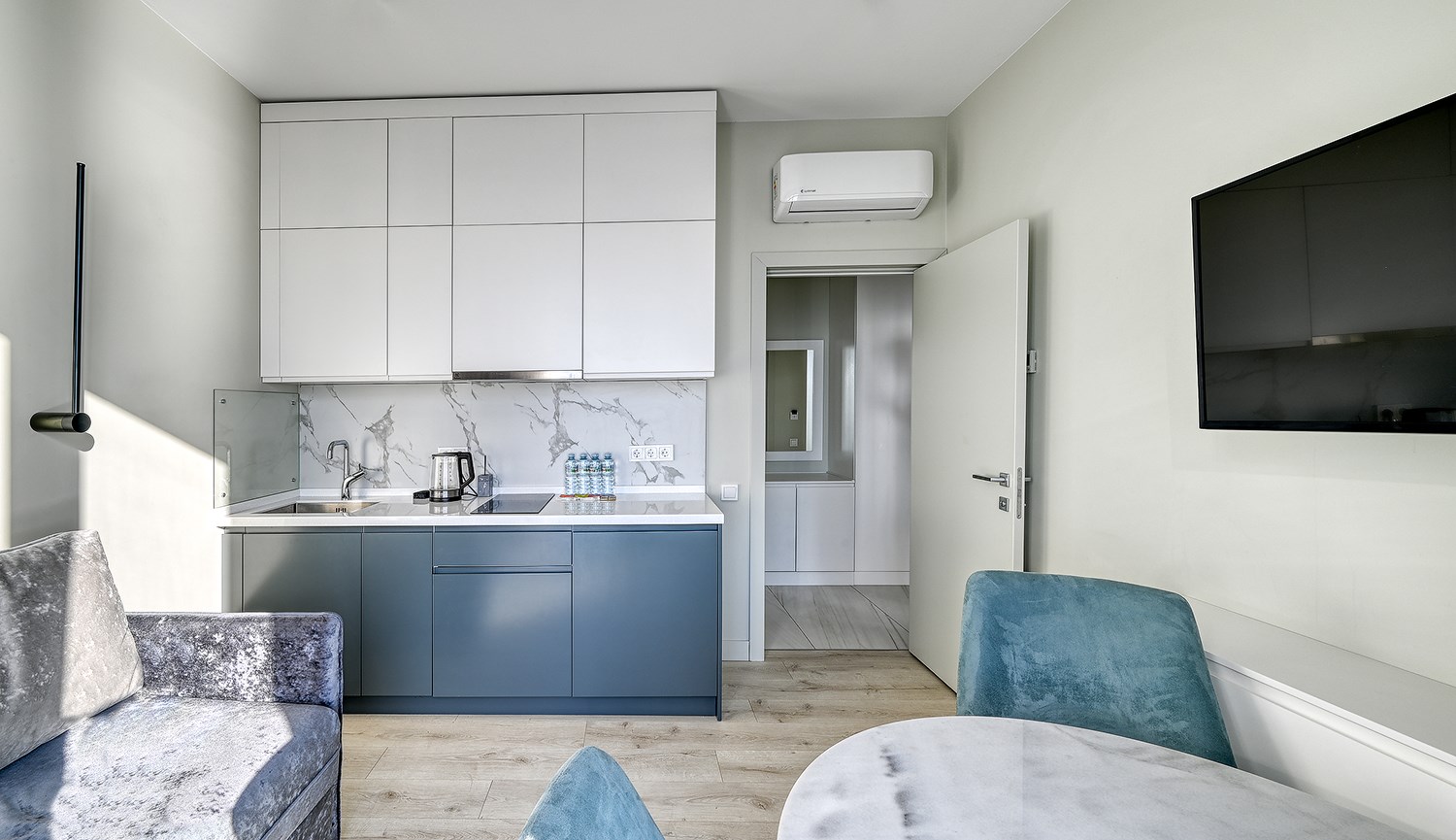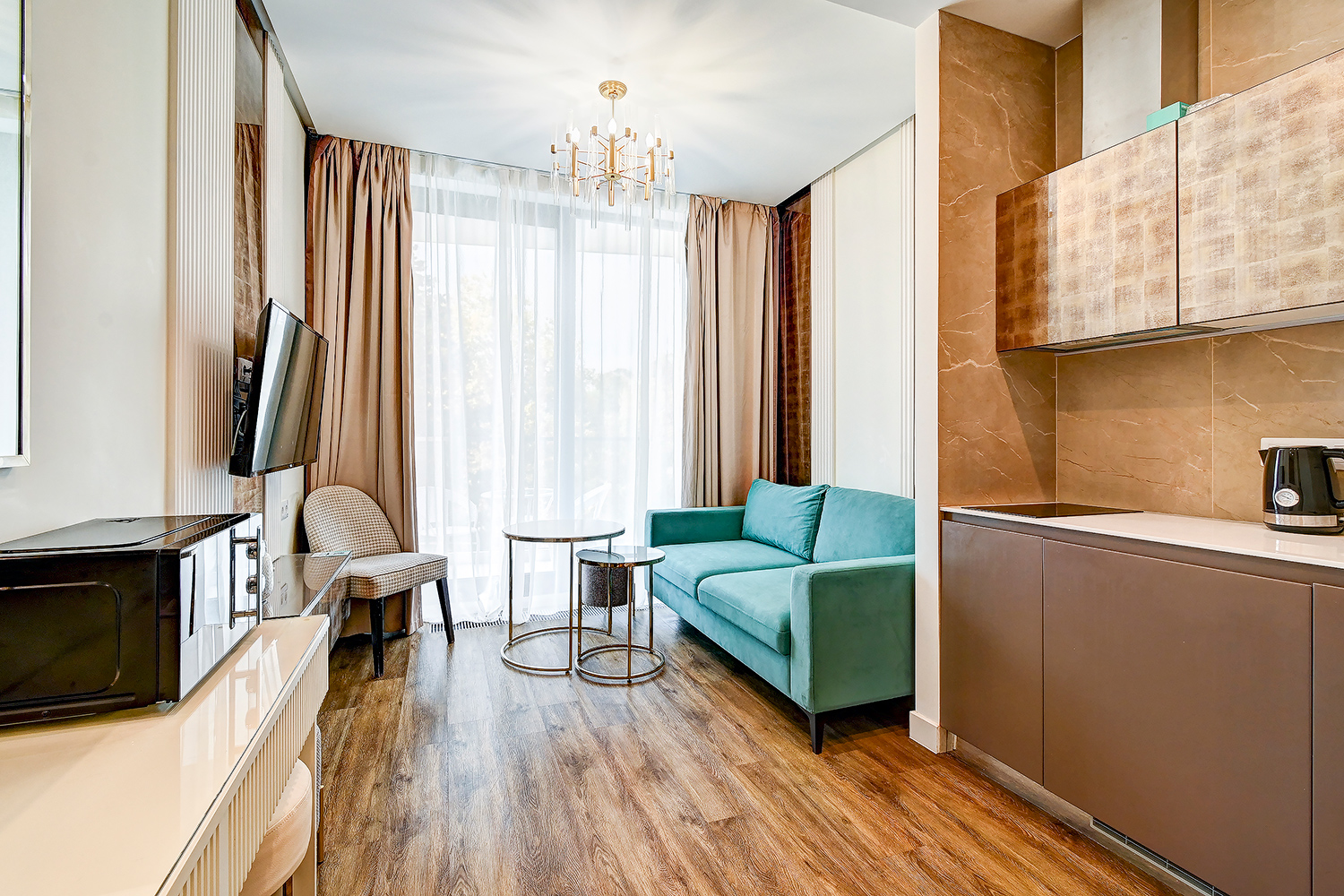 - В номере: душ, туалет, ТВ, кондиционер, мини-кухня, электрочайник, СВЧ-печь, двуспальная кровать, диван