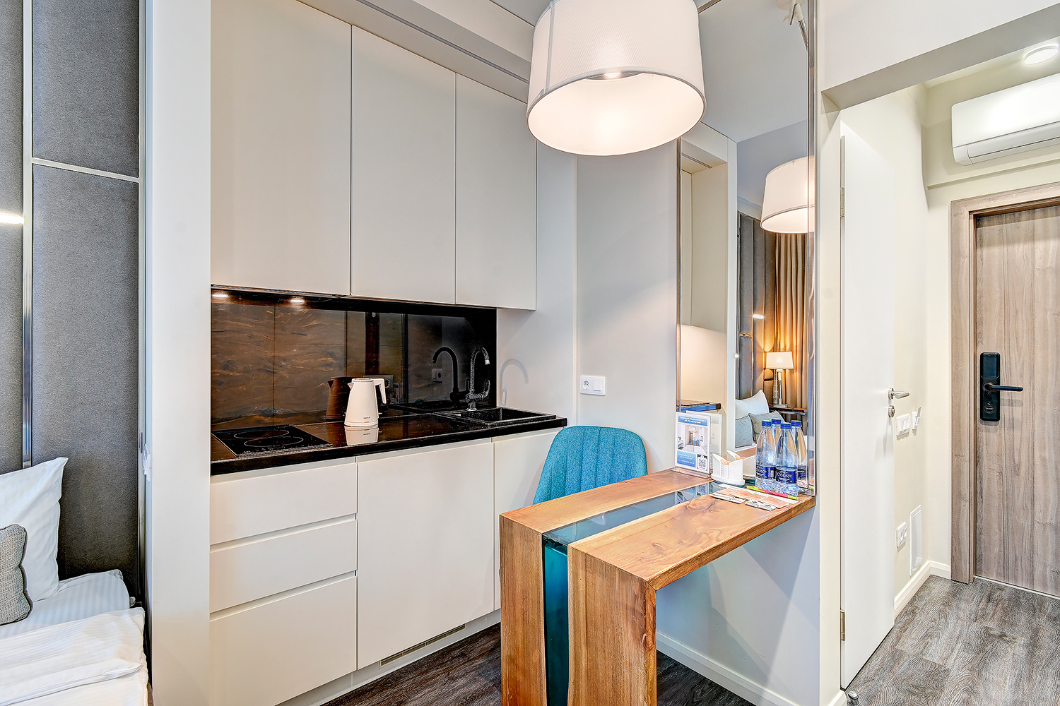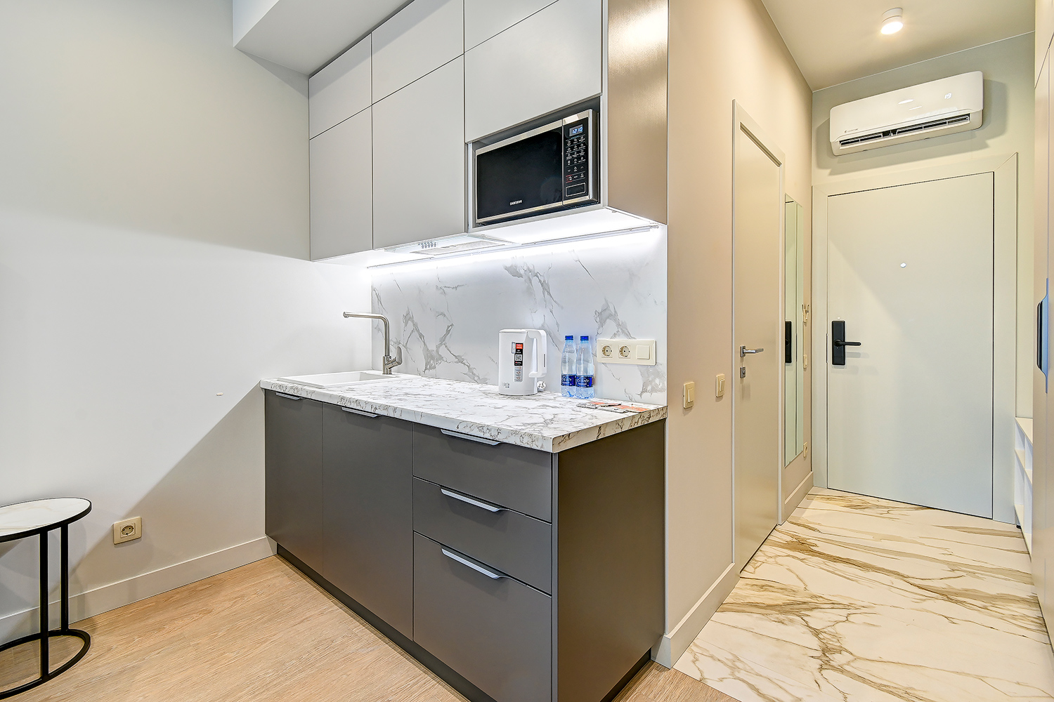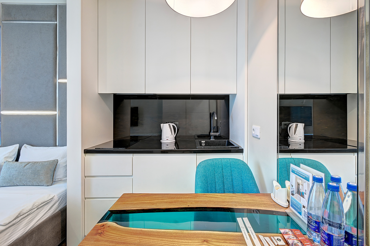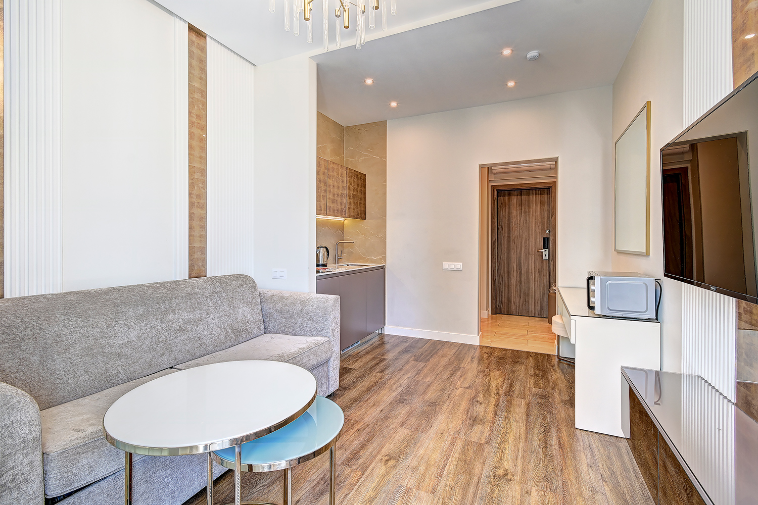 - В номере: душ, туалет, ТВ, кондиционер, мини-кухня, электрочайник, СВЧ-печь, двуспальная кровать, диван
