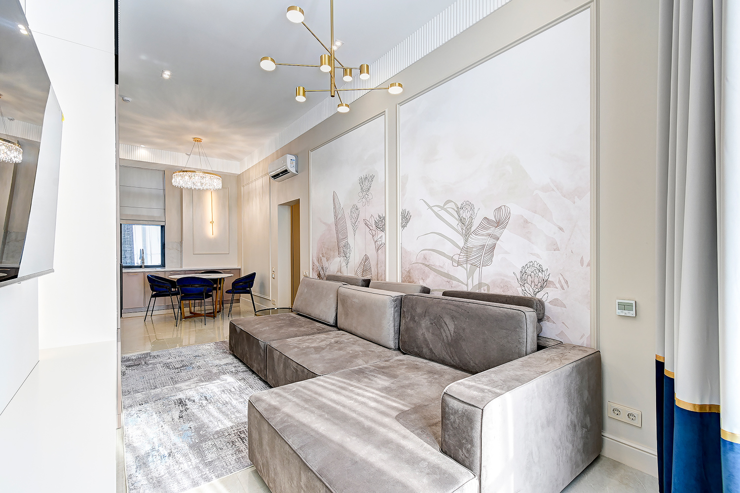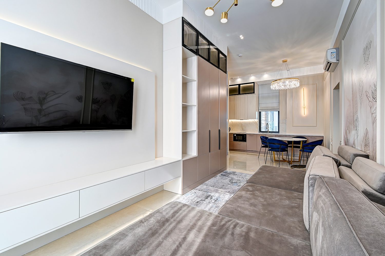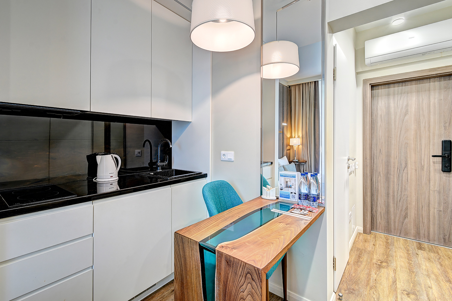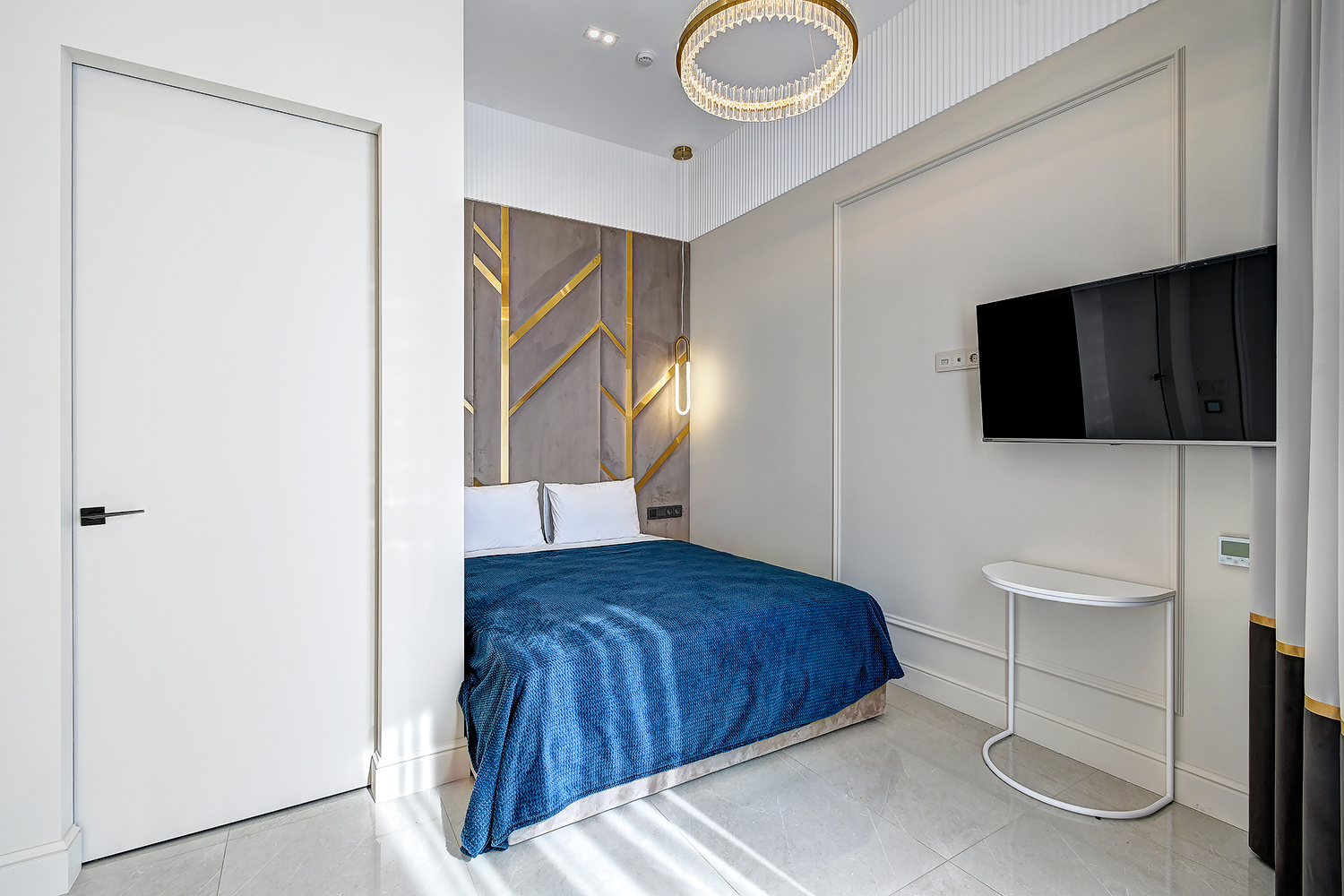- В номере: душ, туалет, ТВ, кондиционер, мини-кухня, электрочайник, СВЧ-печь, двуспальная кровать, диван