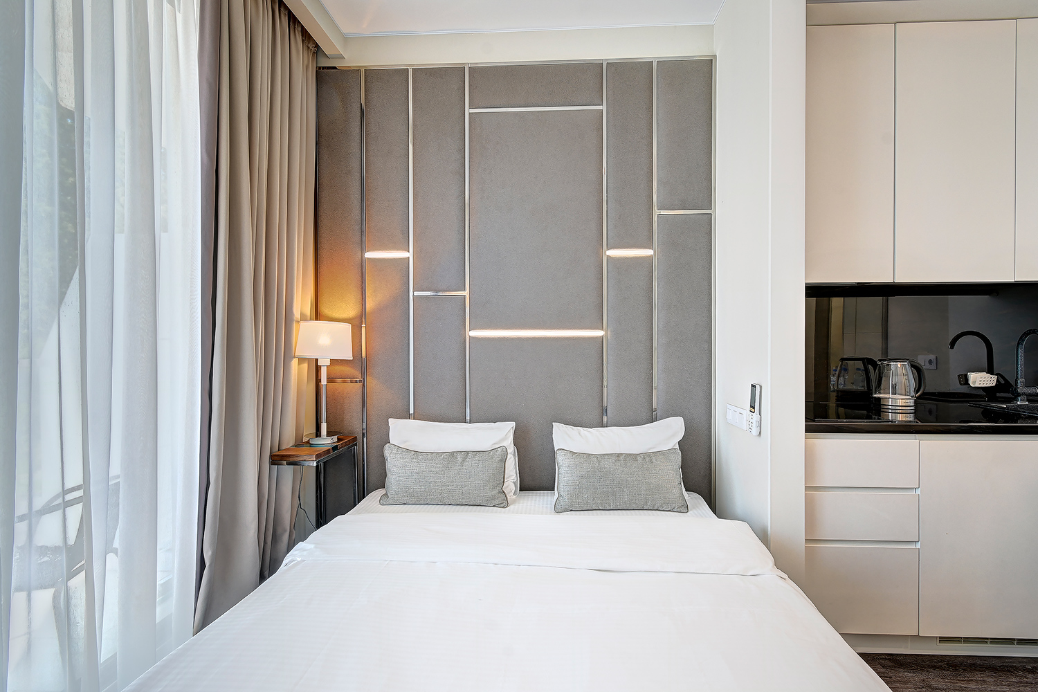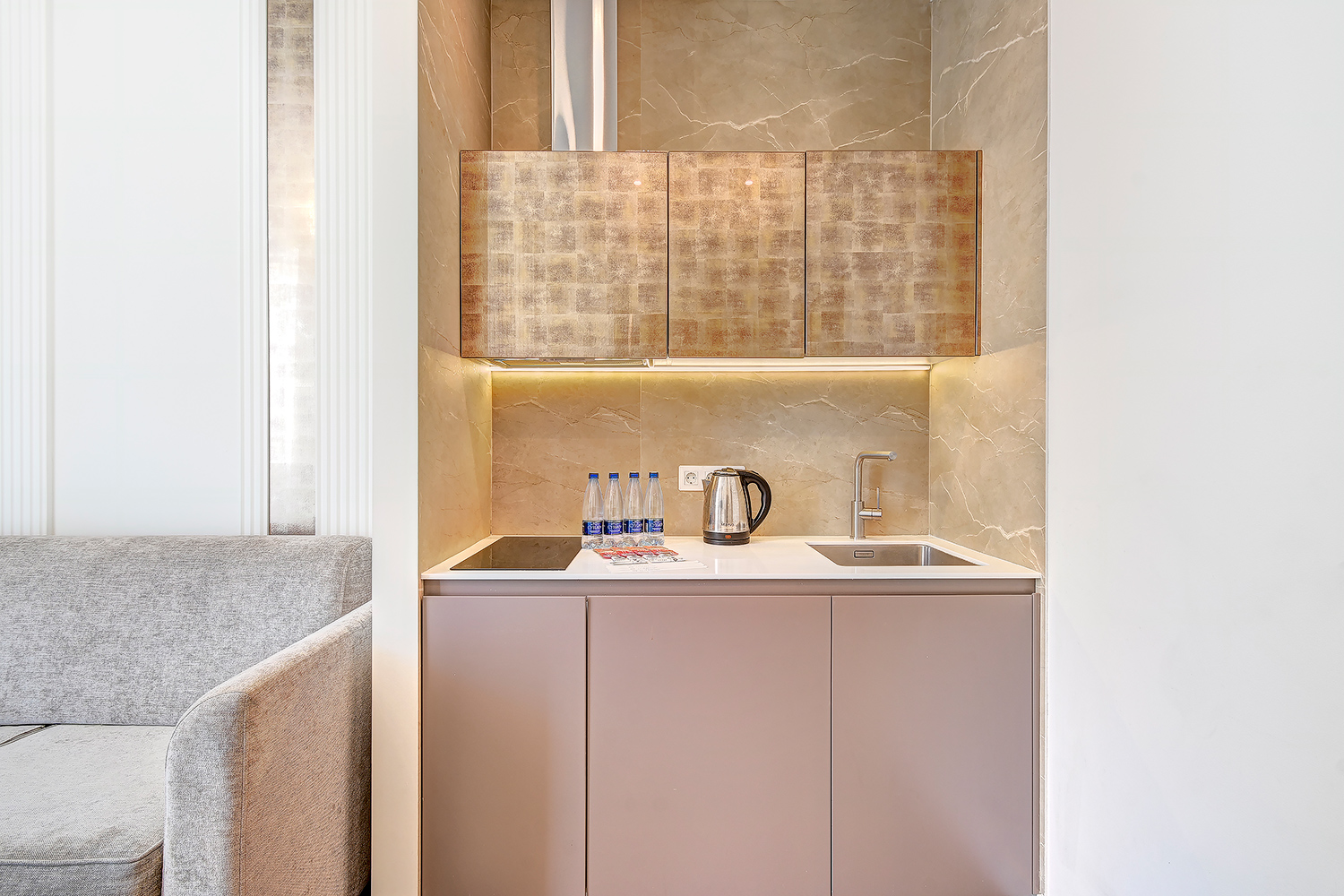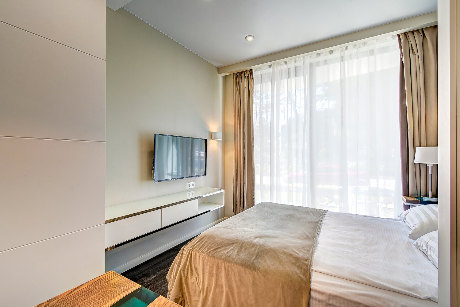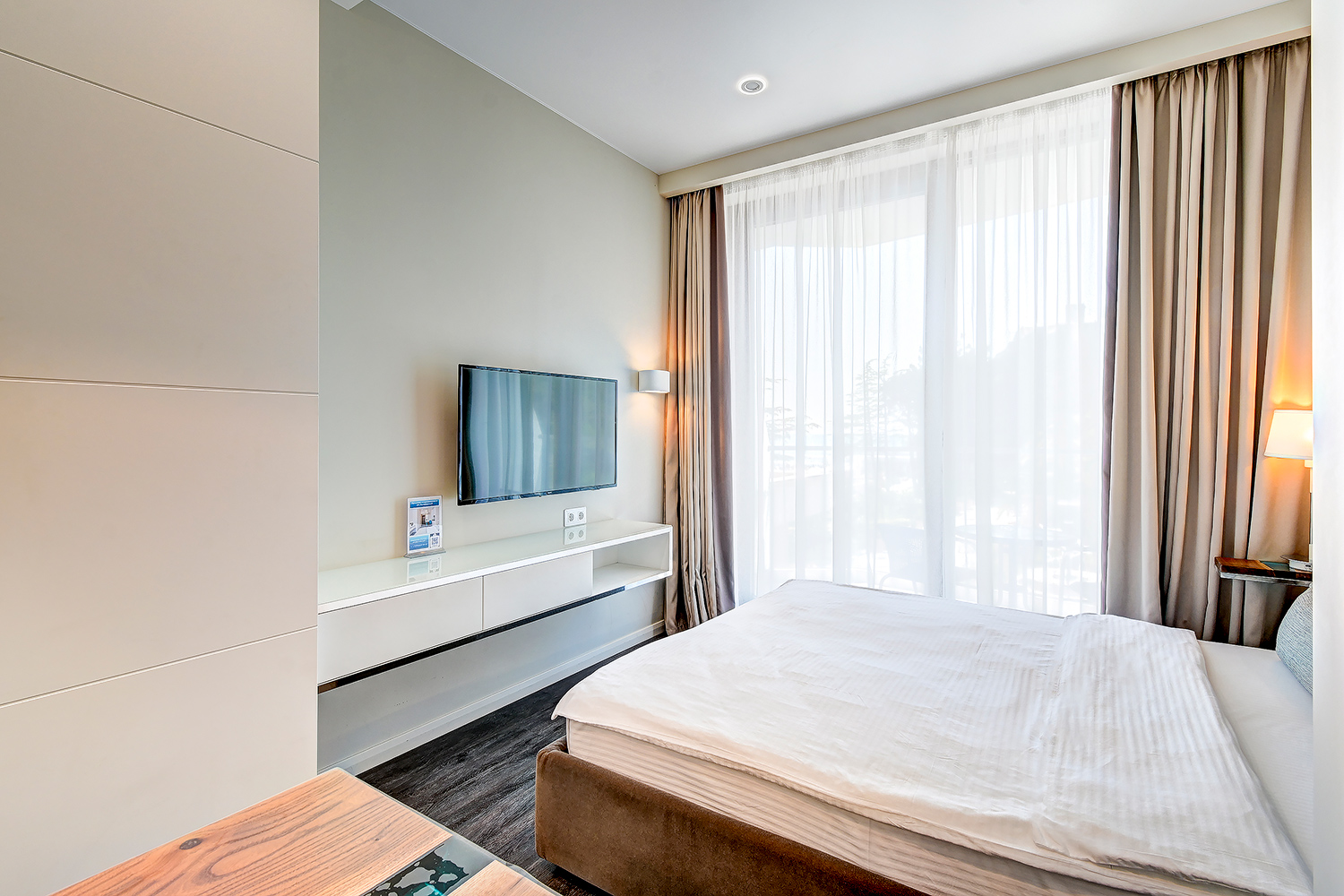 - В номере: душ, туалет, ТВ, холодильник, кондиционер, сейф, фен, телефон, мини-кухня, чайная станция, электрочайник, СВЧ-печь, двуспальная кровать, диван, балкон