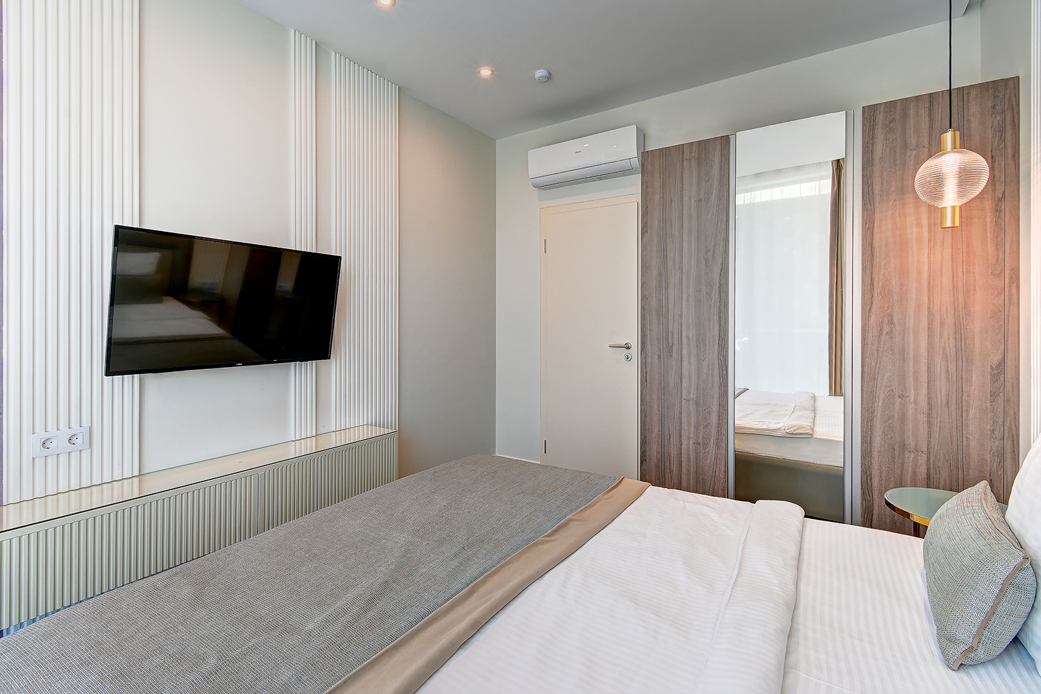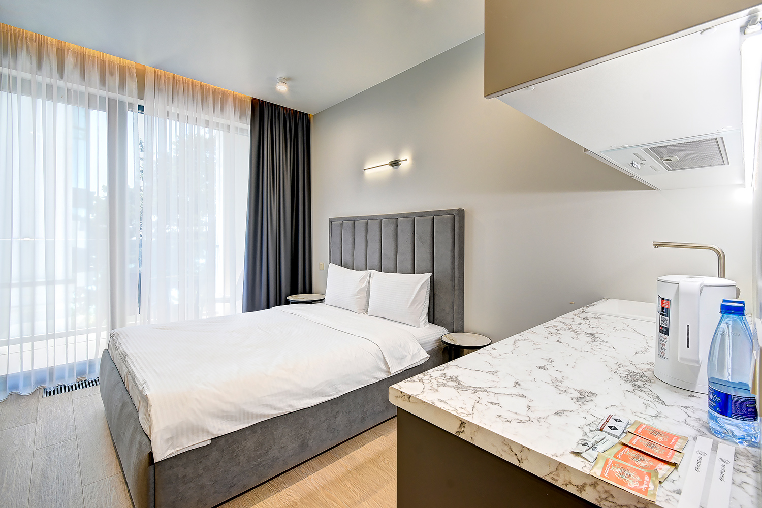 - В номере: душ, туалет, ТВ, кондиционер, мини-кухня, электрочайник, СВЧ-печь, двуспальная кровать