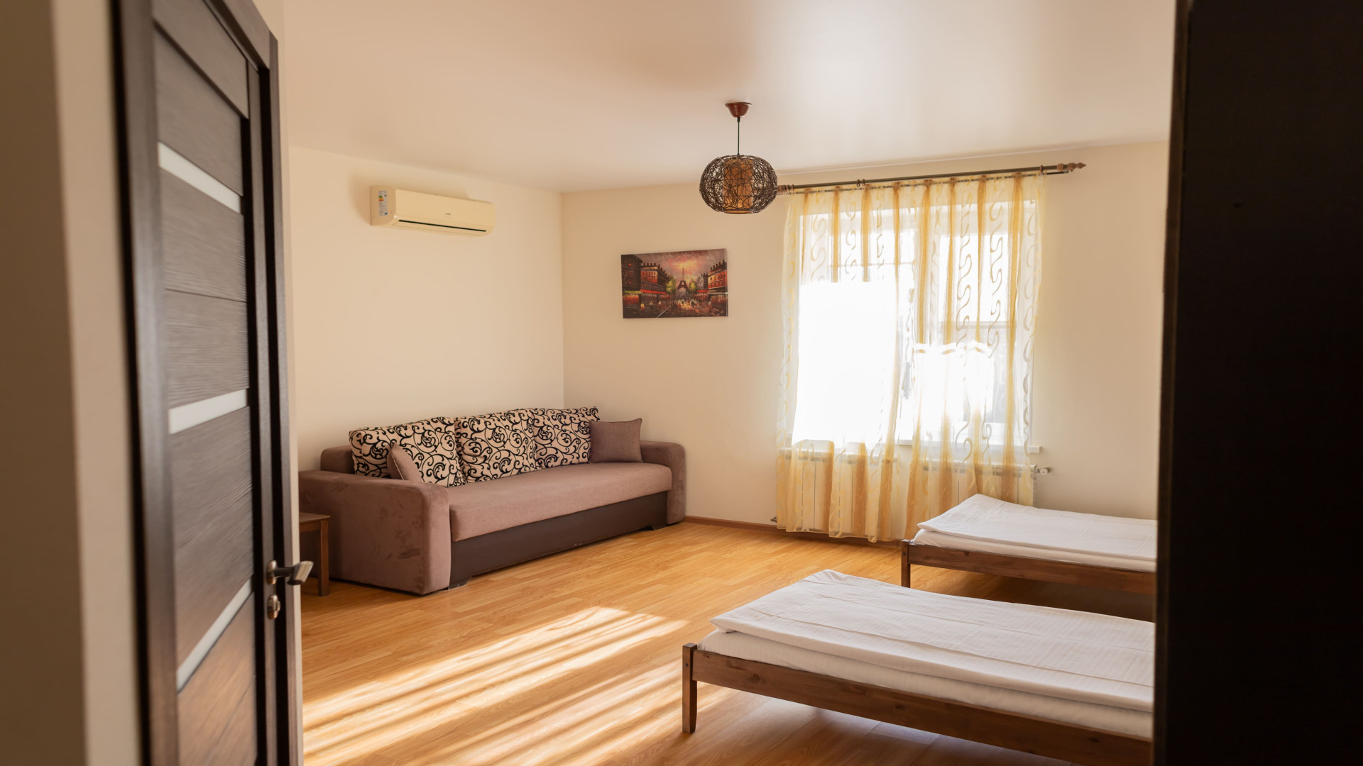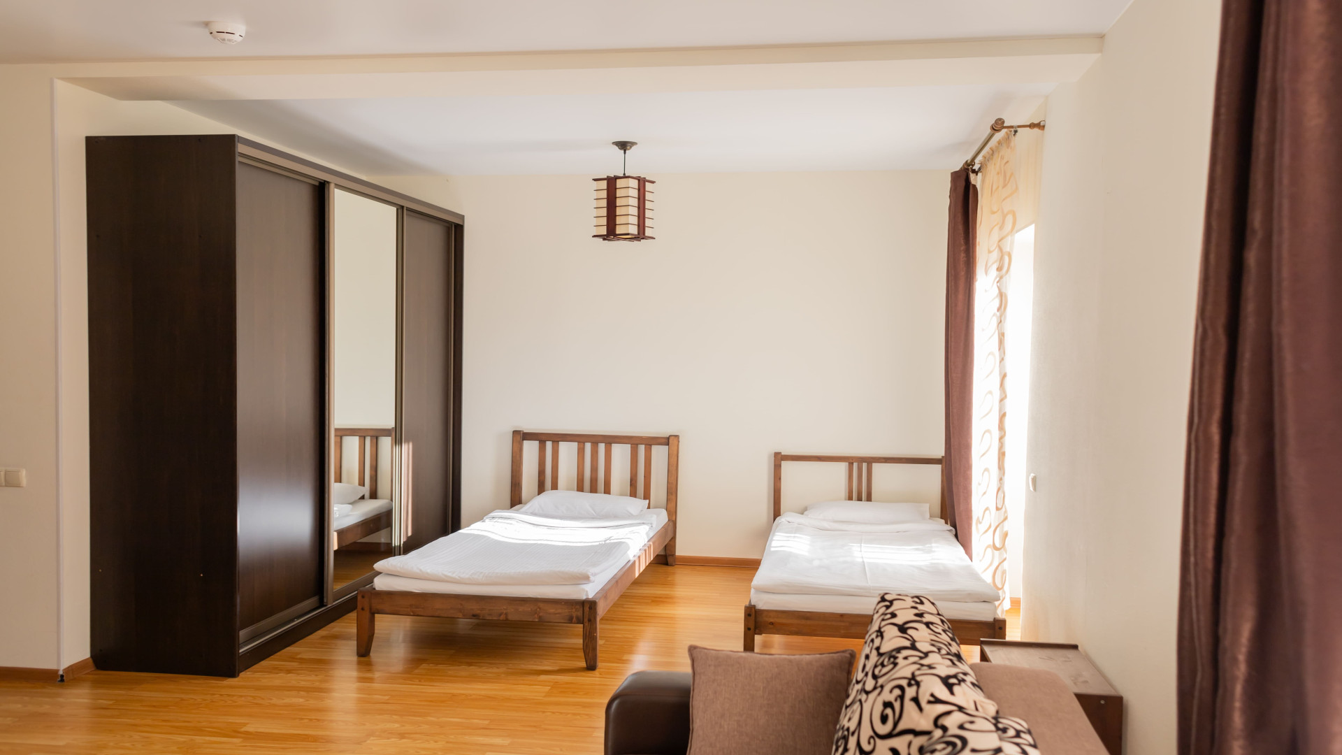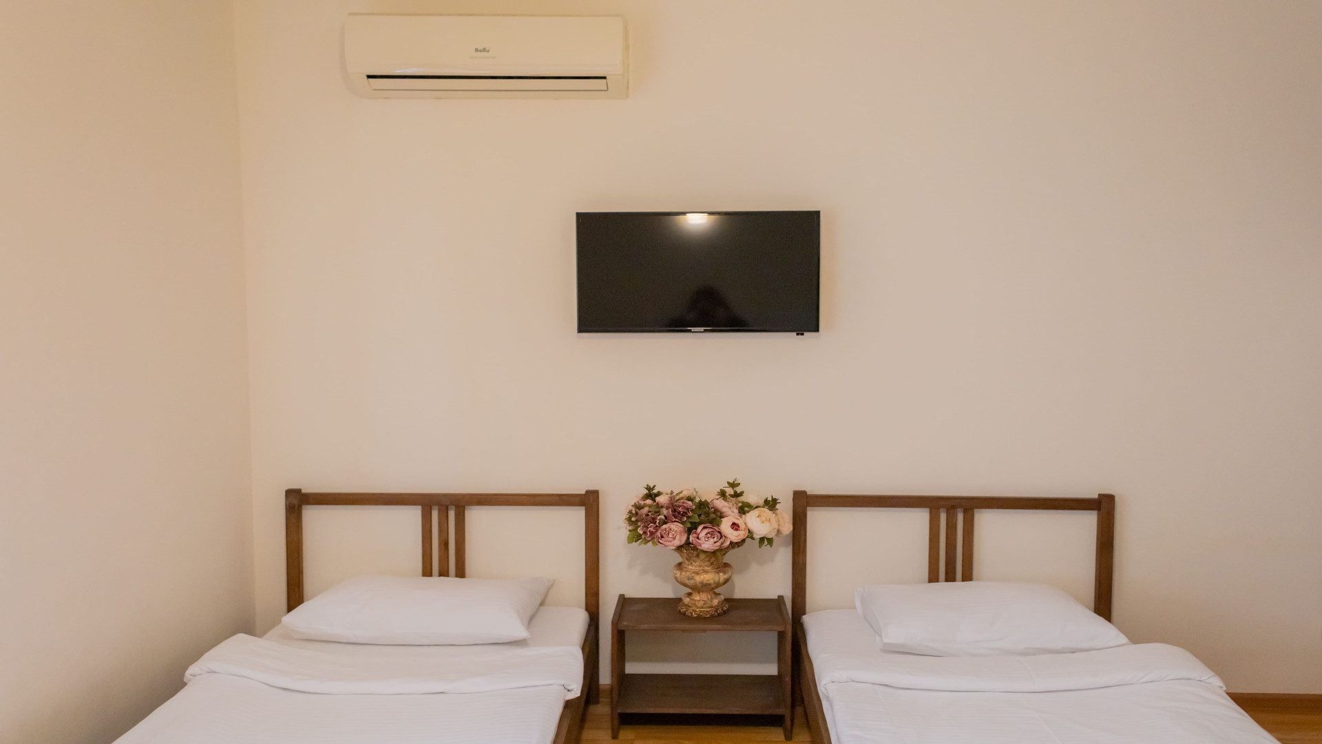 - В номере: душ, туалет, ТВ, холодильник, кондиционер, фен, телефон, мини-кухня, электрочайник, две раздельные кровати, диван
