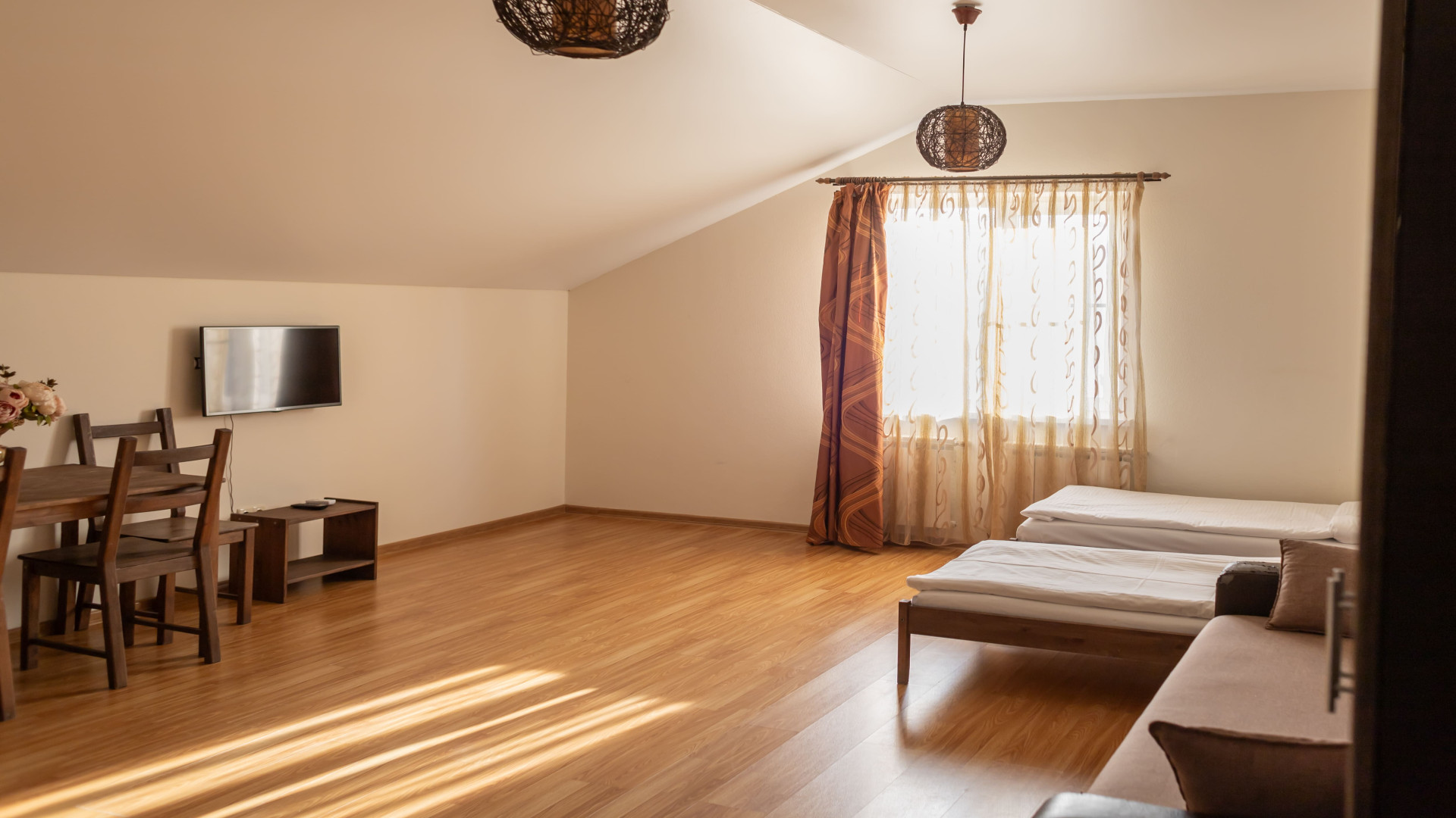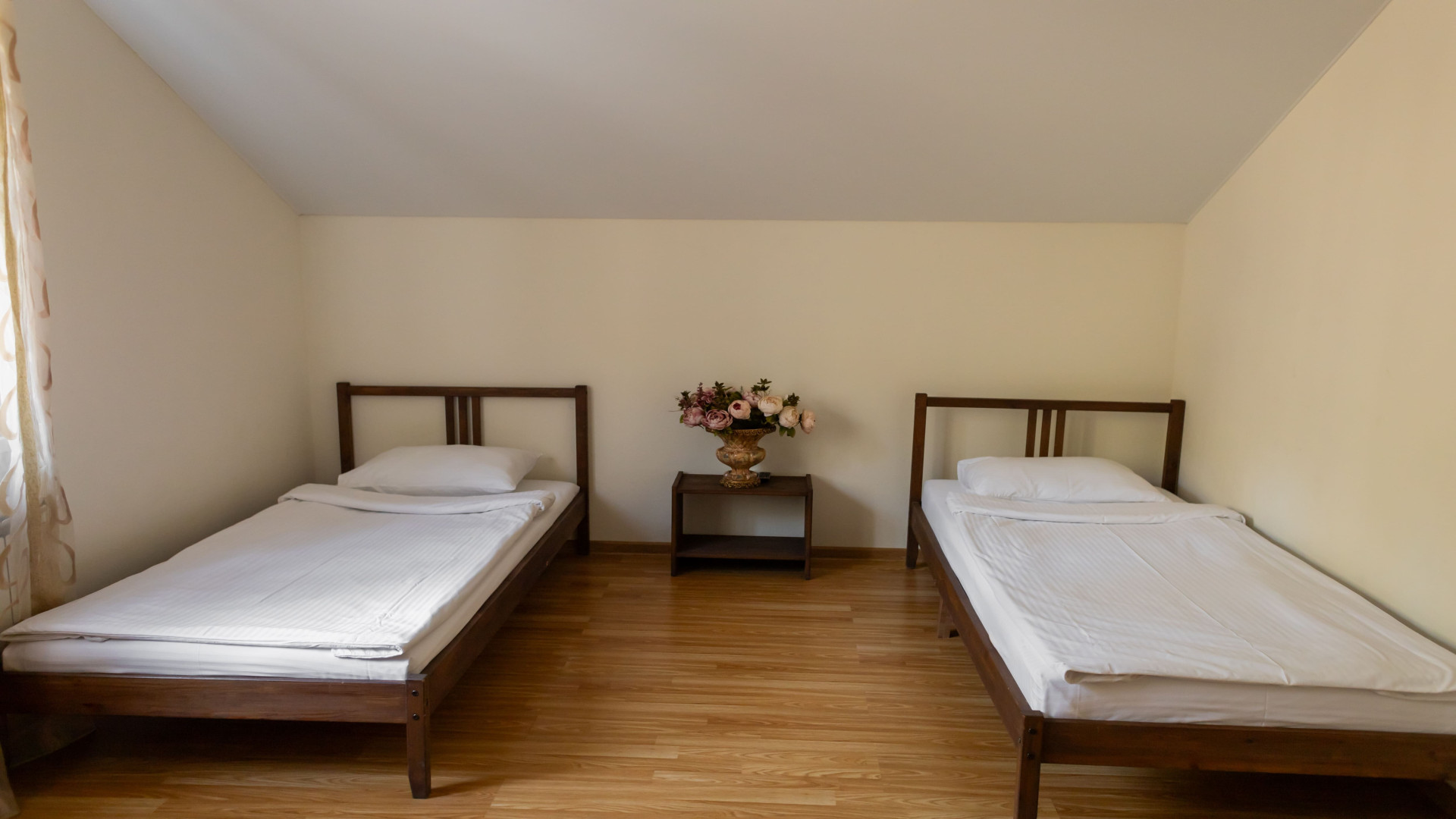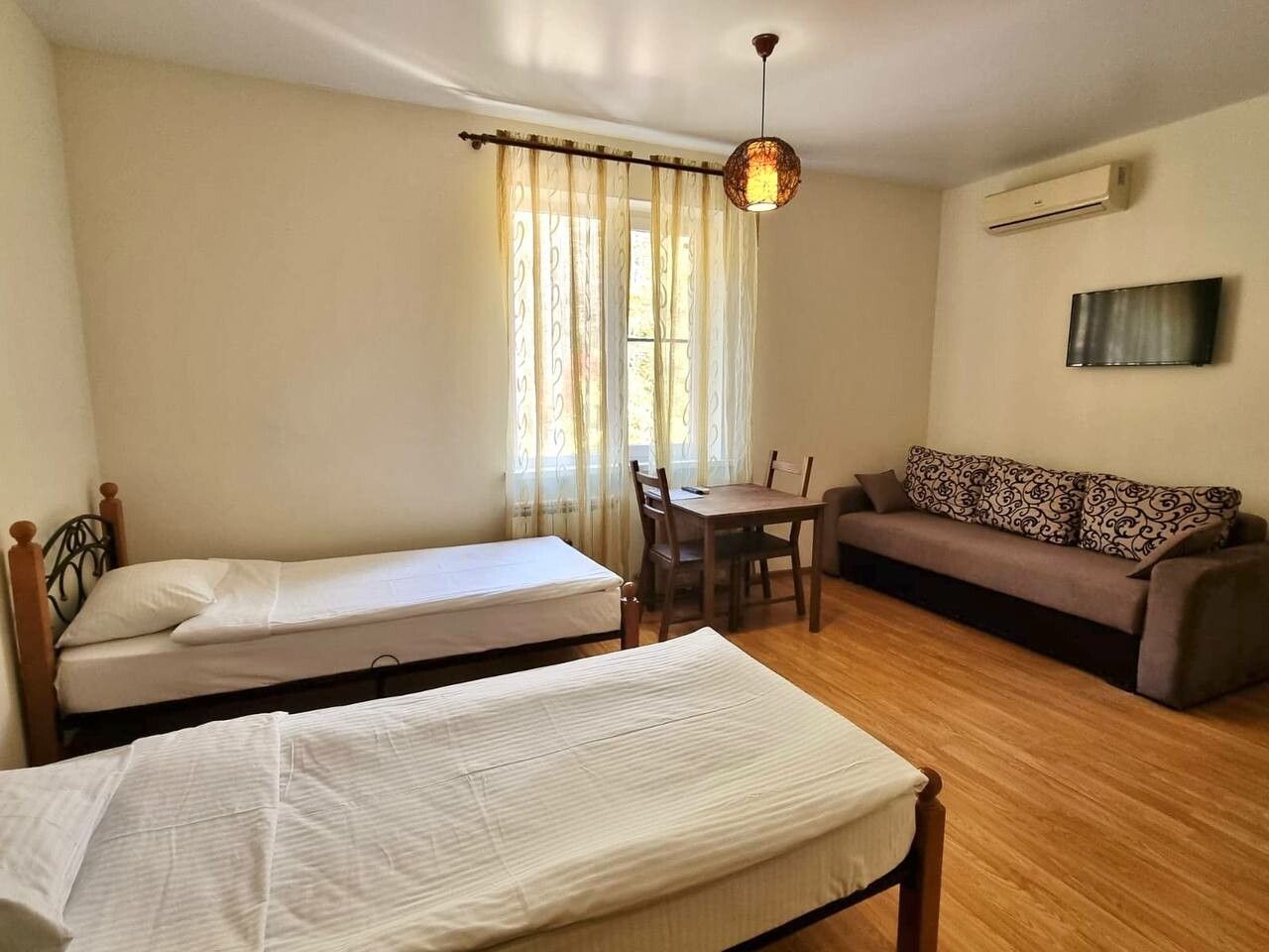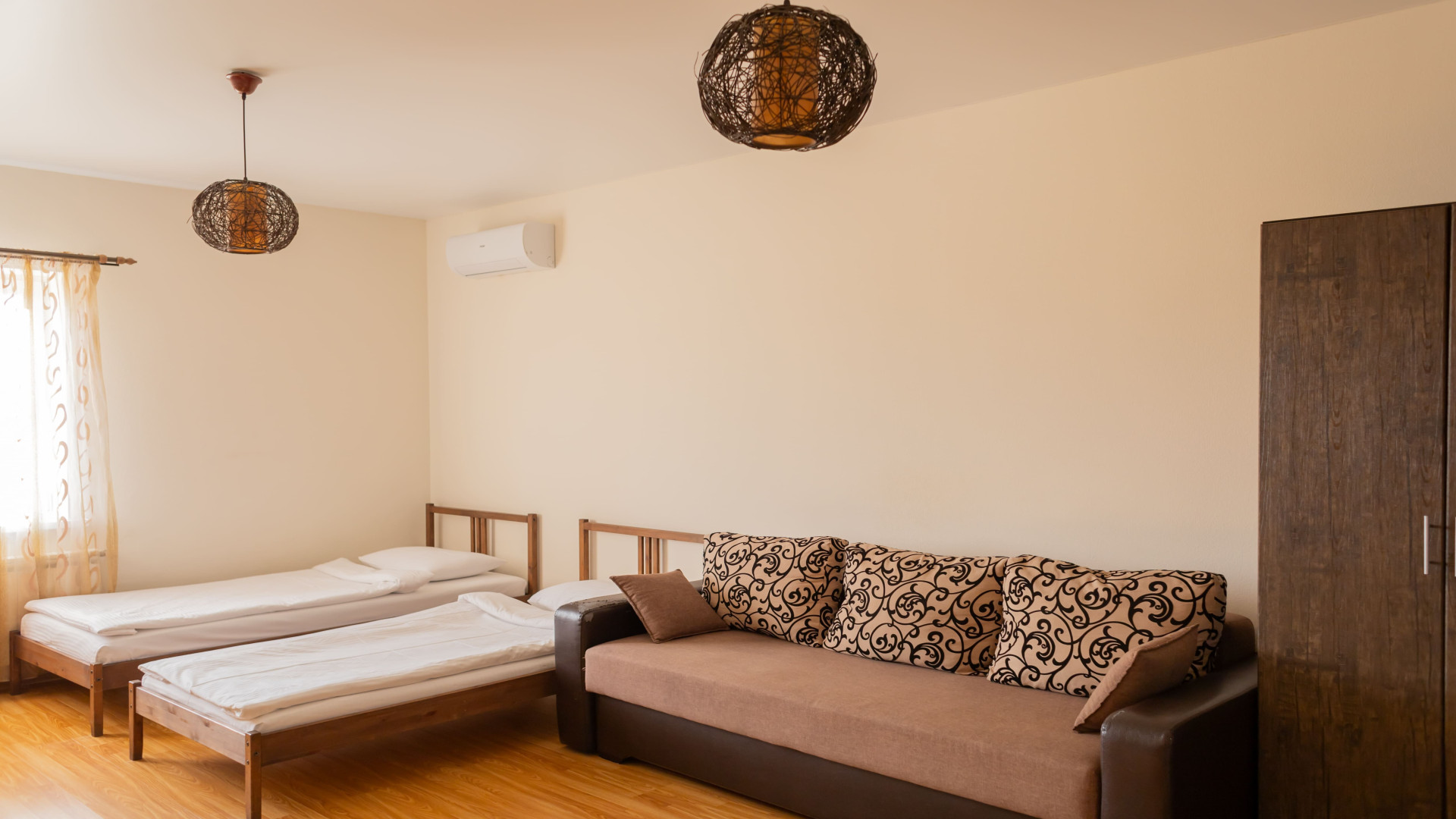 - В номере: душ, туалет, ТВ, холодильник, кондиционер, фен, телефон, мини-кухня, электрочайник, две раздельные кровати, диван