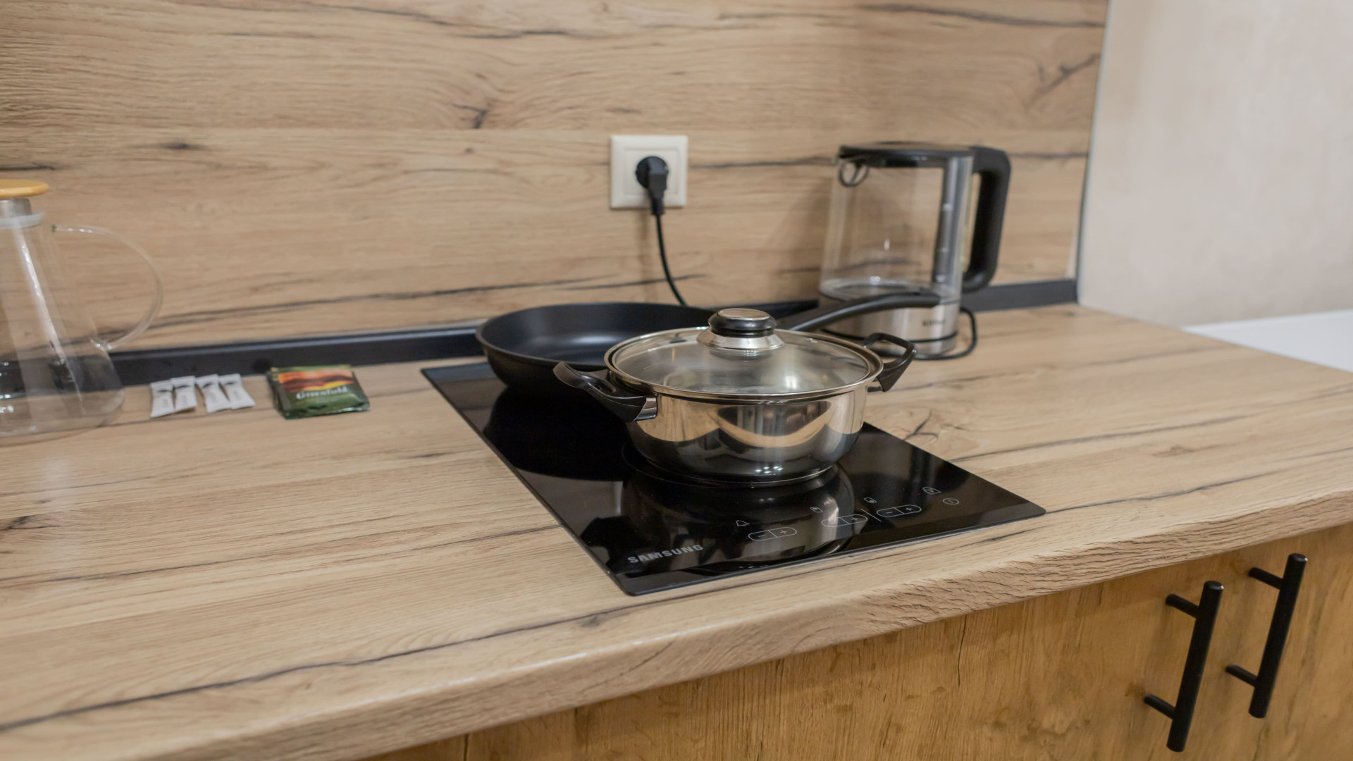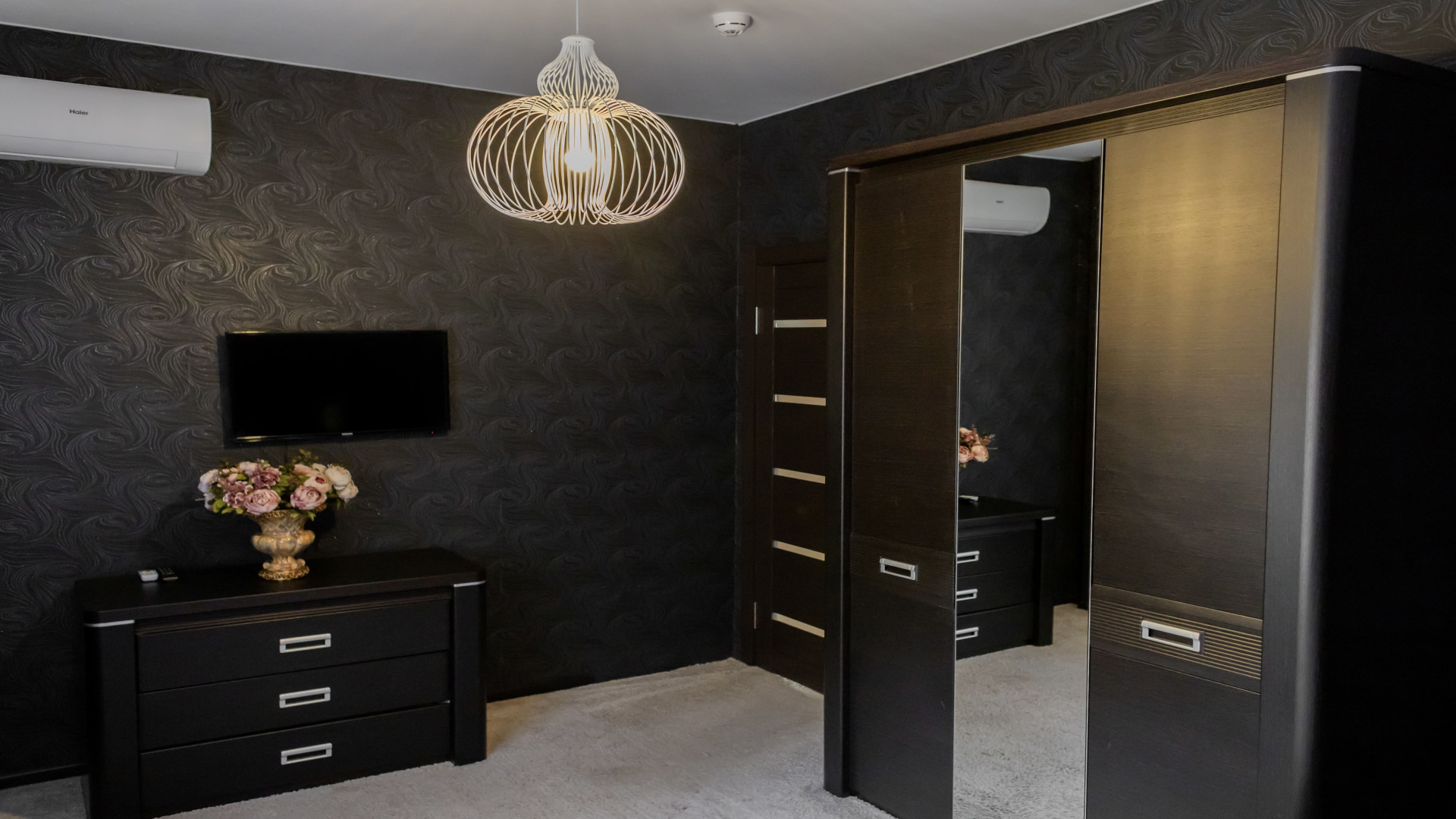 - В номере: душ, туалет, ТВ, холодильник, кондиционер, фен, мини-кухня, чайная станция, электрочайник, СВЧ-печь, двуспальная кровать (2), диван