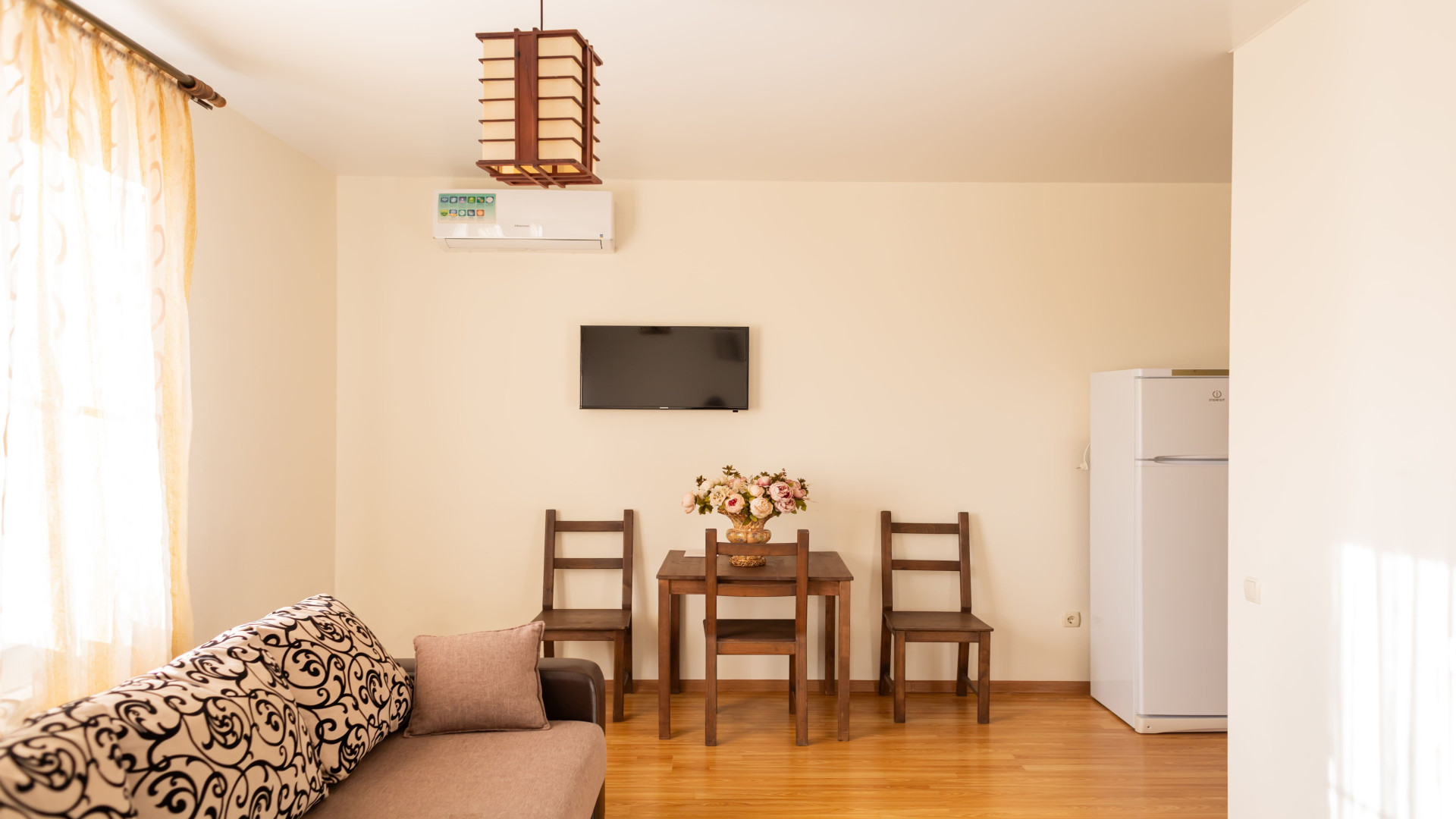- В номере: душ, туалет, ТВ, холодильник, кондиционер, фен, телефон, мини-кухня, электрочайник, двуспальная кровать, диван, балкон