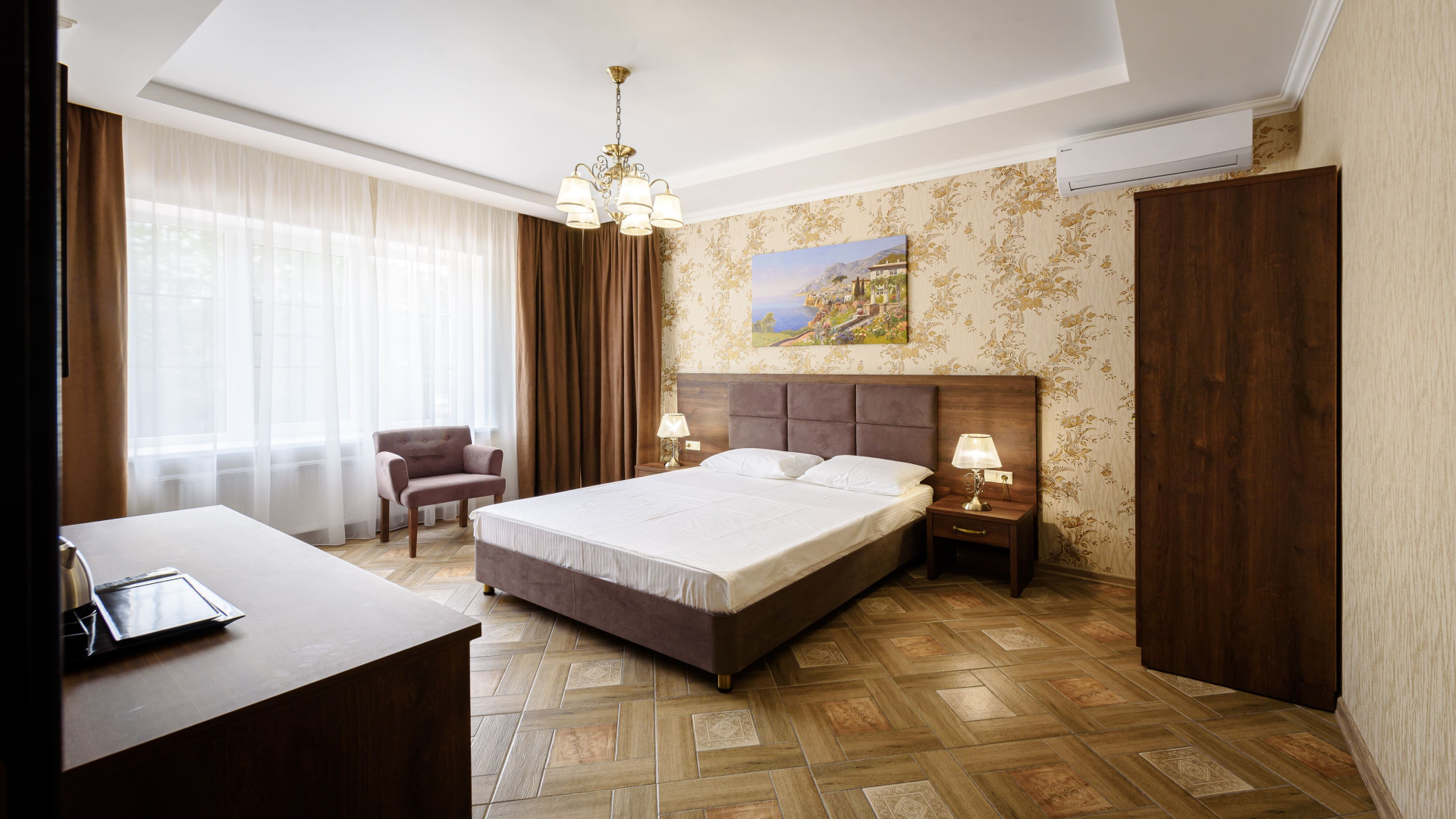 - В номере: душ, туалет, ТВ, холодильник, кондиционер, фен, телефон, электрочайник, двуспальная кровать, диван, балкон