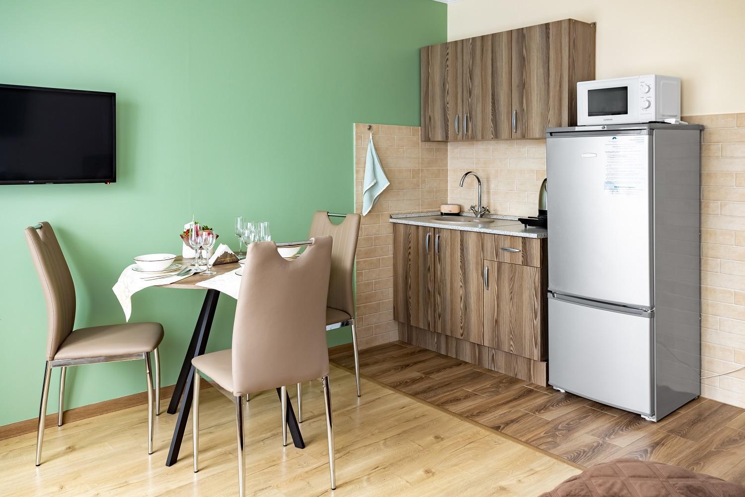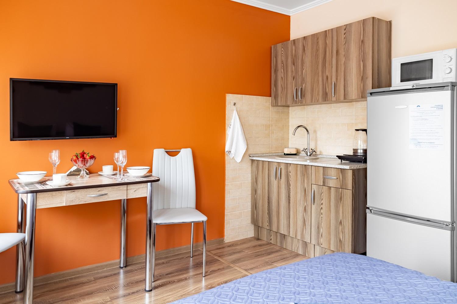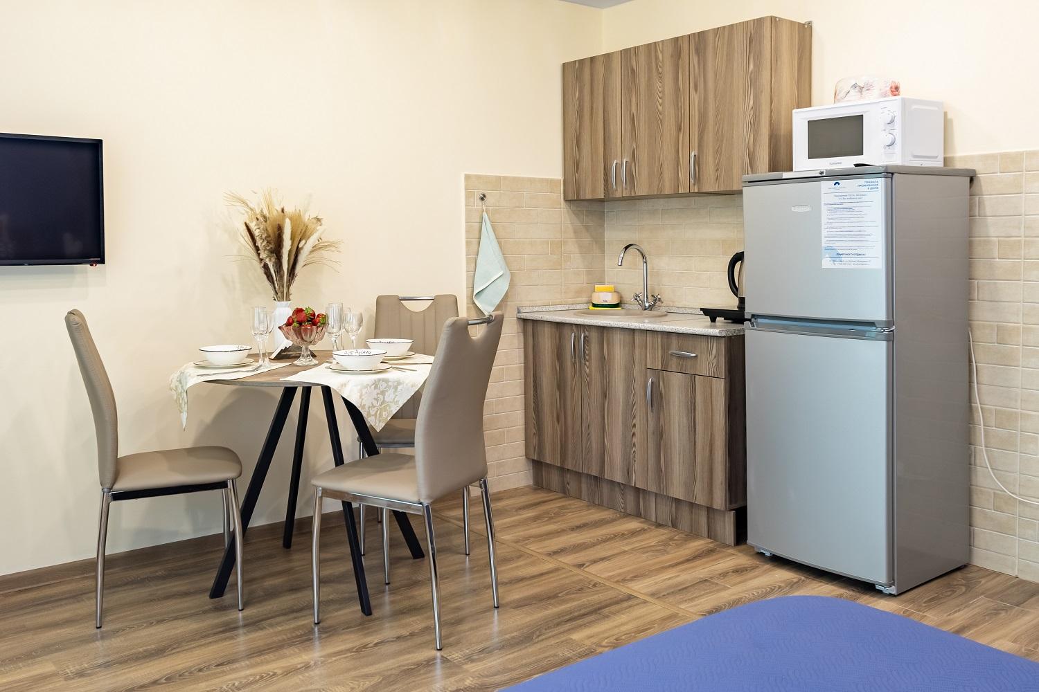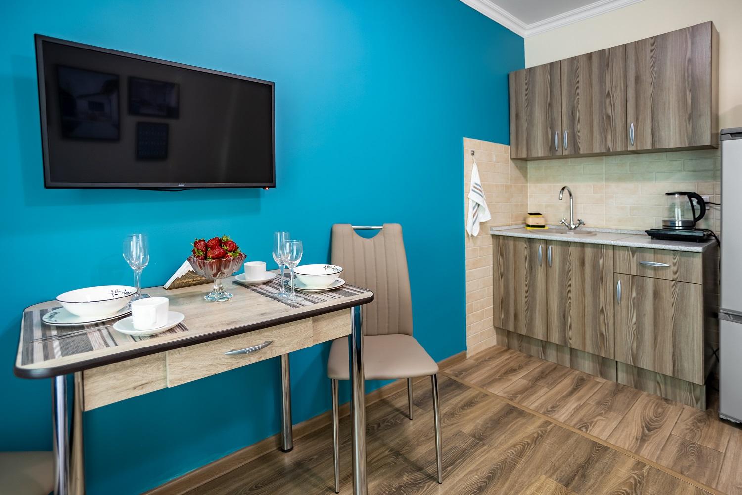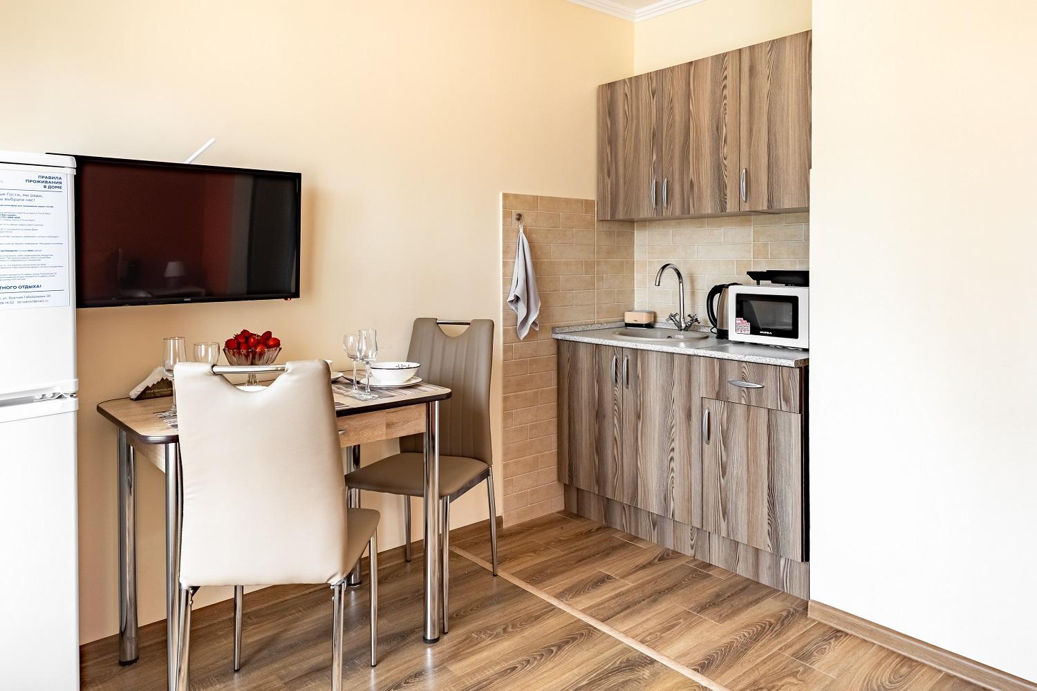 Апартаменты выполнены в индивидуальном дизайне. Мини-кухня, обеденная зона и бытовая техника сделают пребывание гостей комфортным и беззаботным.