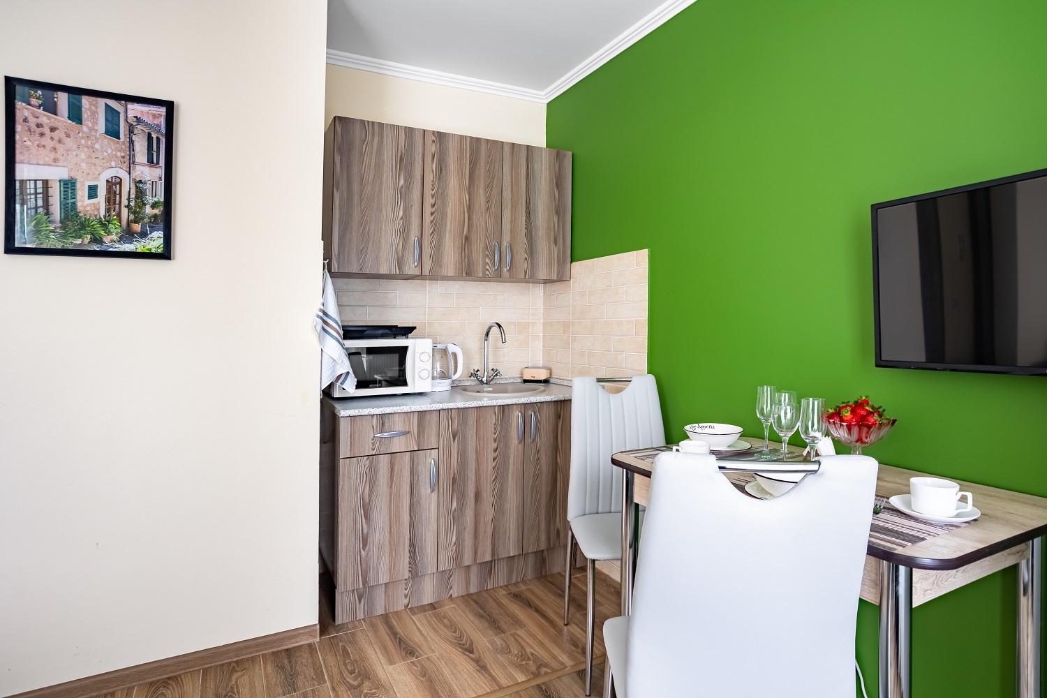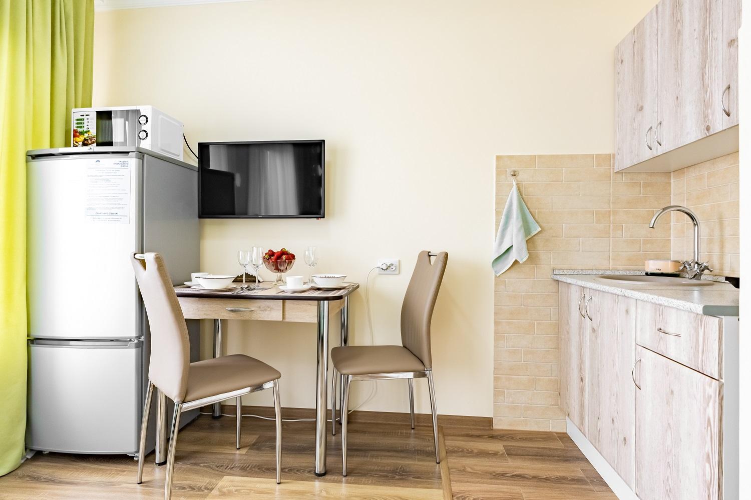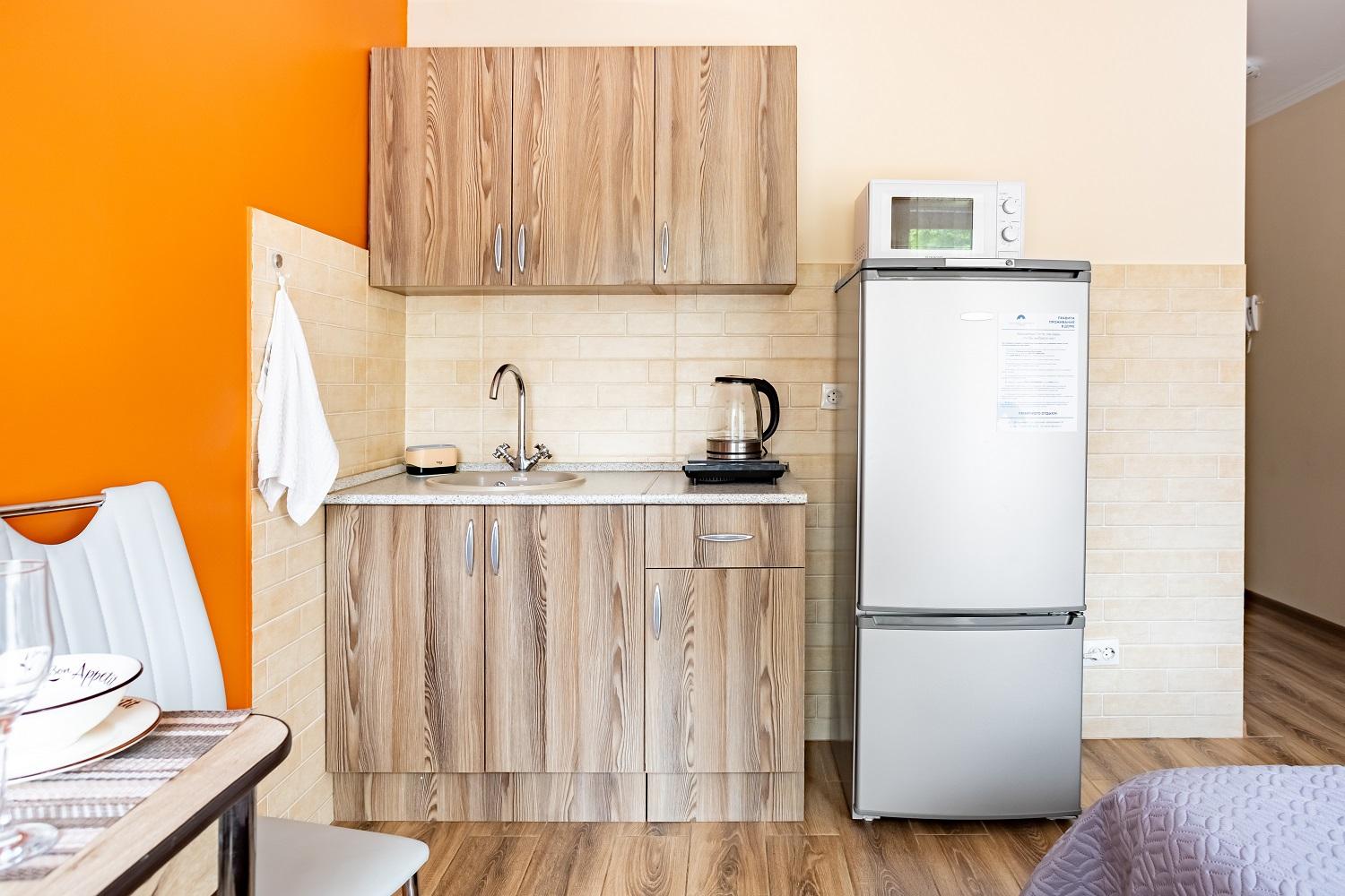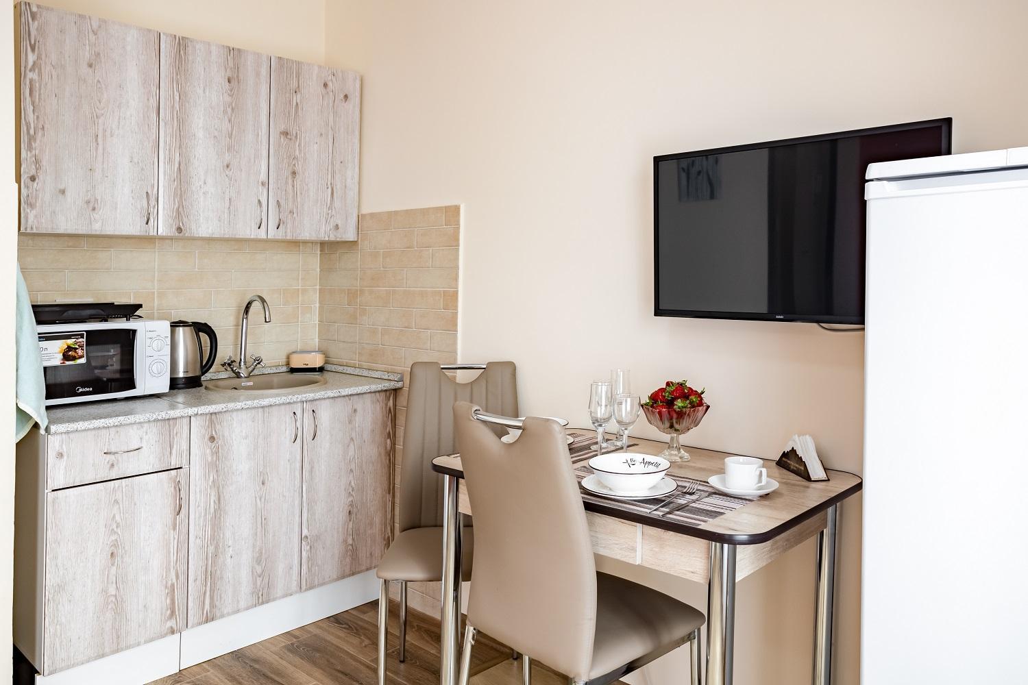 Апартаменты выполнены в индивидуальном дизайне. Мини-кухня, обеденная зона и бытовая техника сделают пребывание гостей комфортным и беззаботным.